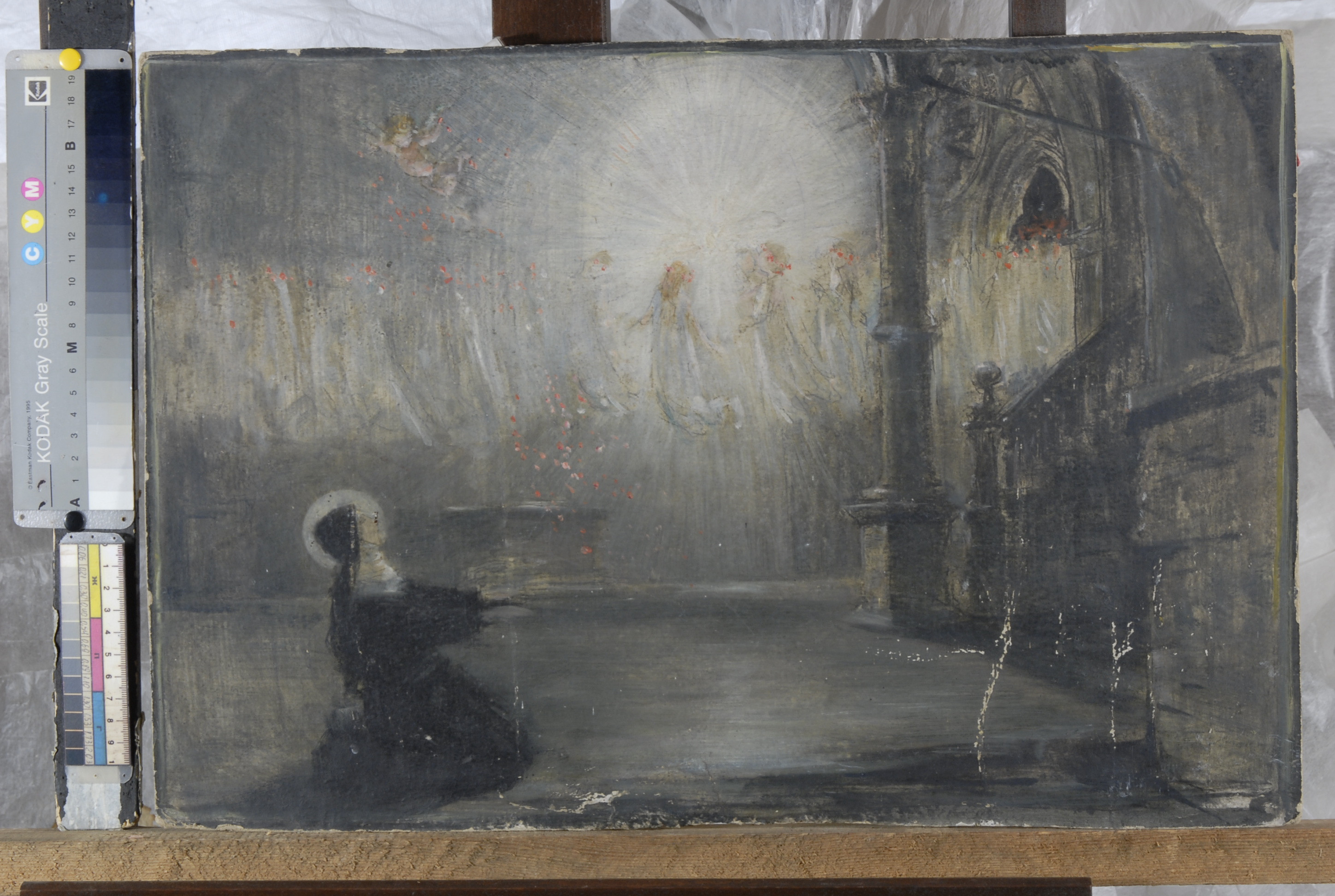 Інвентар 1967р.: численні осипання фарбового шару (головним чином внизу, по краю і в правому нижньому куті), загальне забруднення, краї картону подерті.,