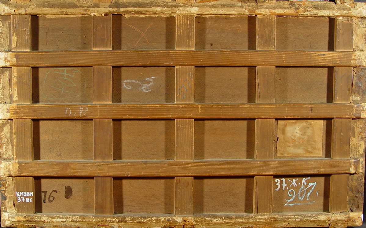 Задовільний. Без рами. Паркетаж 19 ст. Втрати фарбового шару: помитості бл. 50% (локальні - небо). Реставраційні тонування із засягненням на авторський живопис змінили тон та колір на 1%. Покривний шар пізній, лаковий. Потребує профілактичного огляду.,