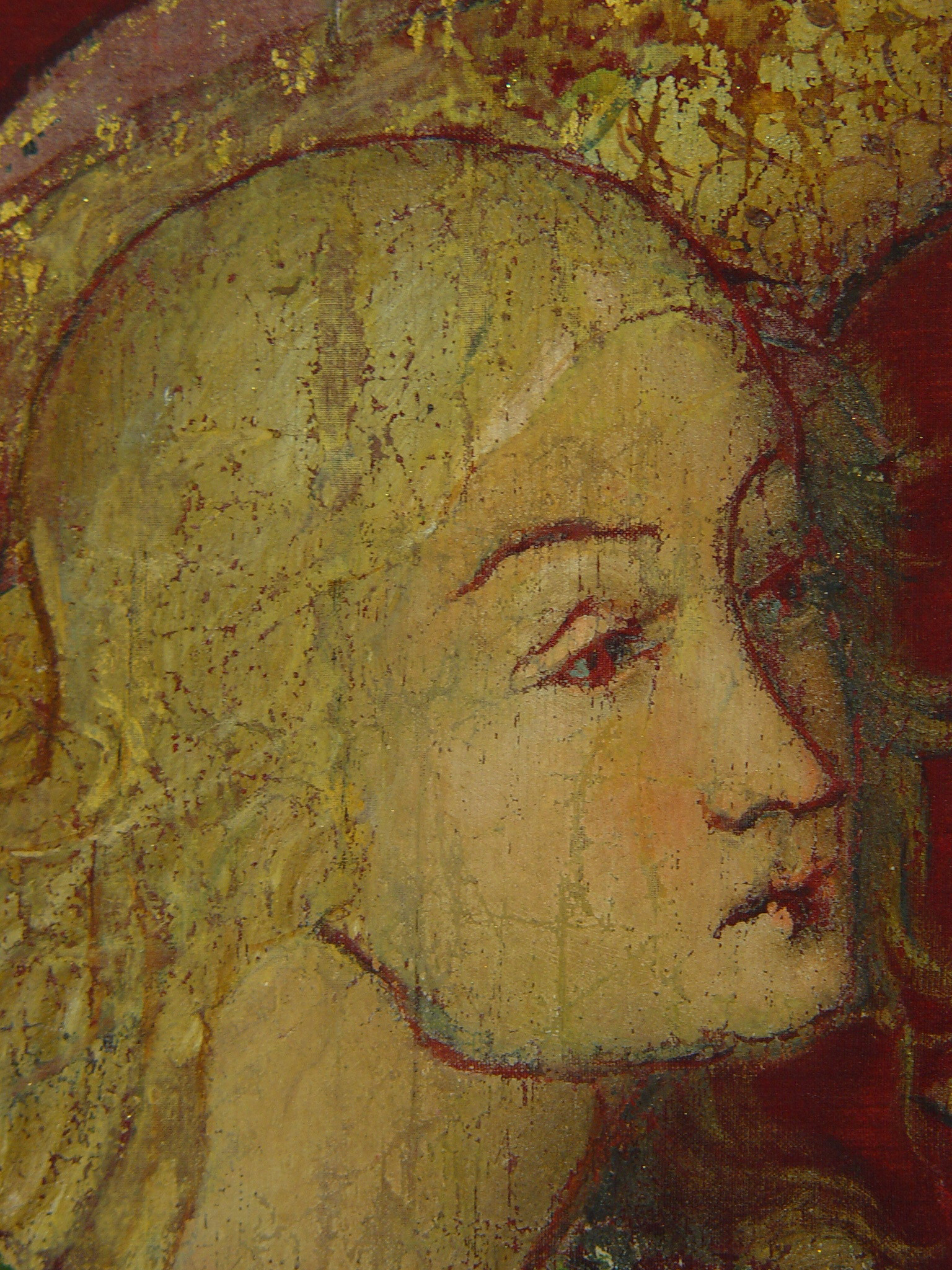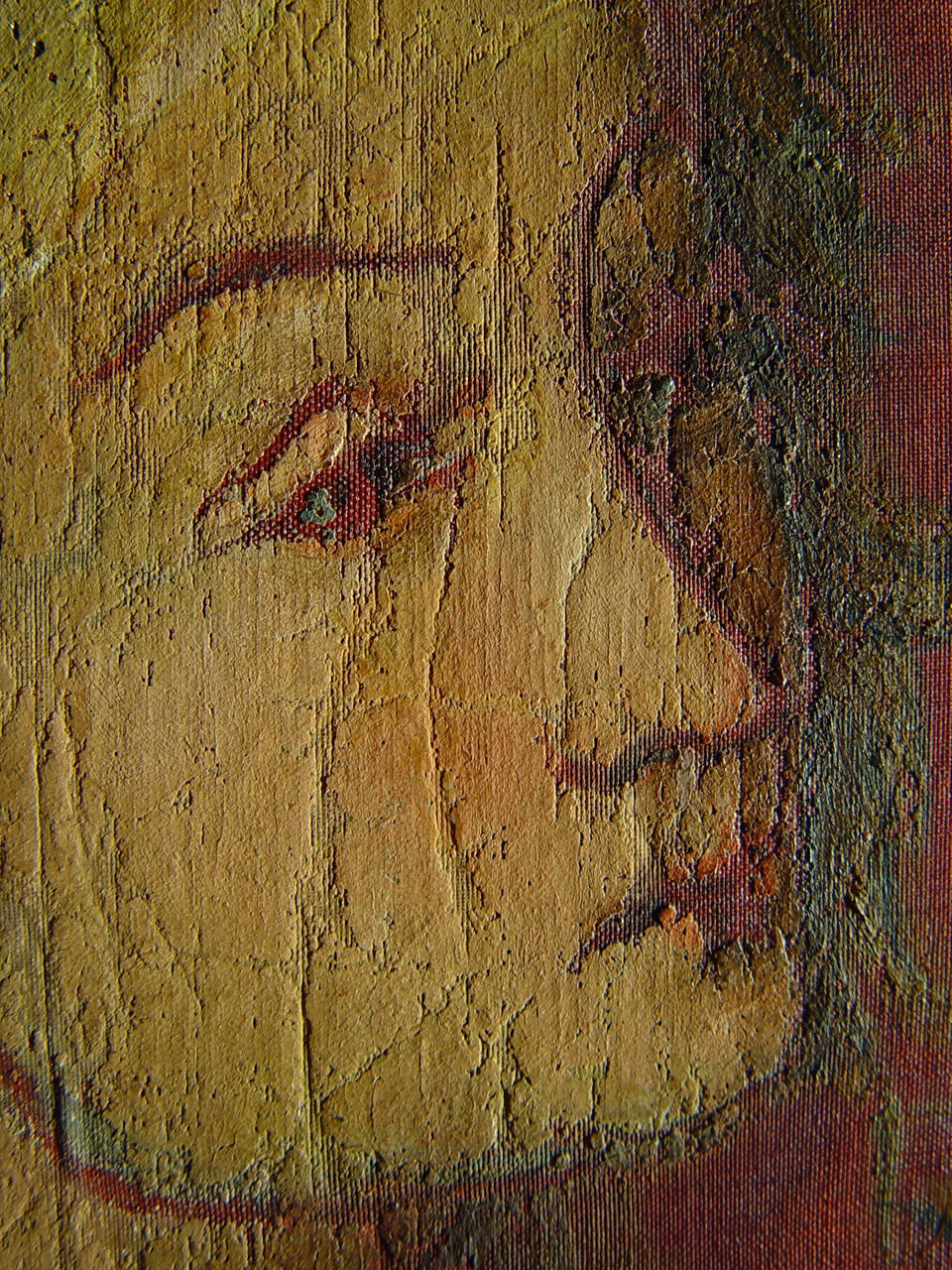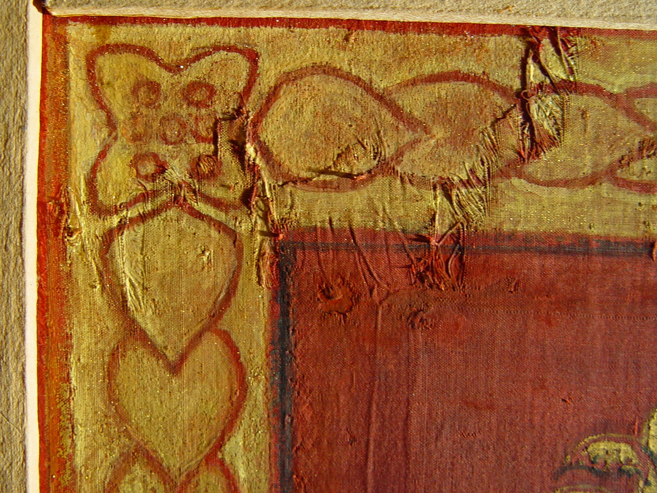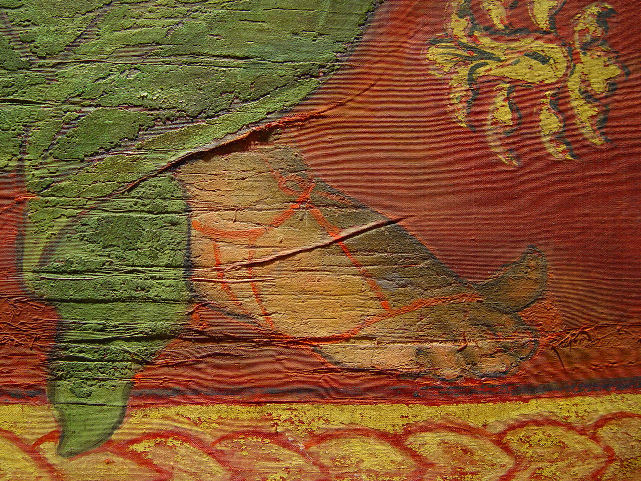 Численні злами тканини з численними осипами фарбового шару по зламам. Часткова втрата тканини ліворуч та частково праоруч.,