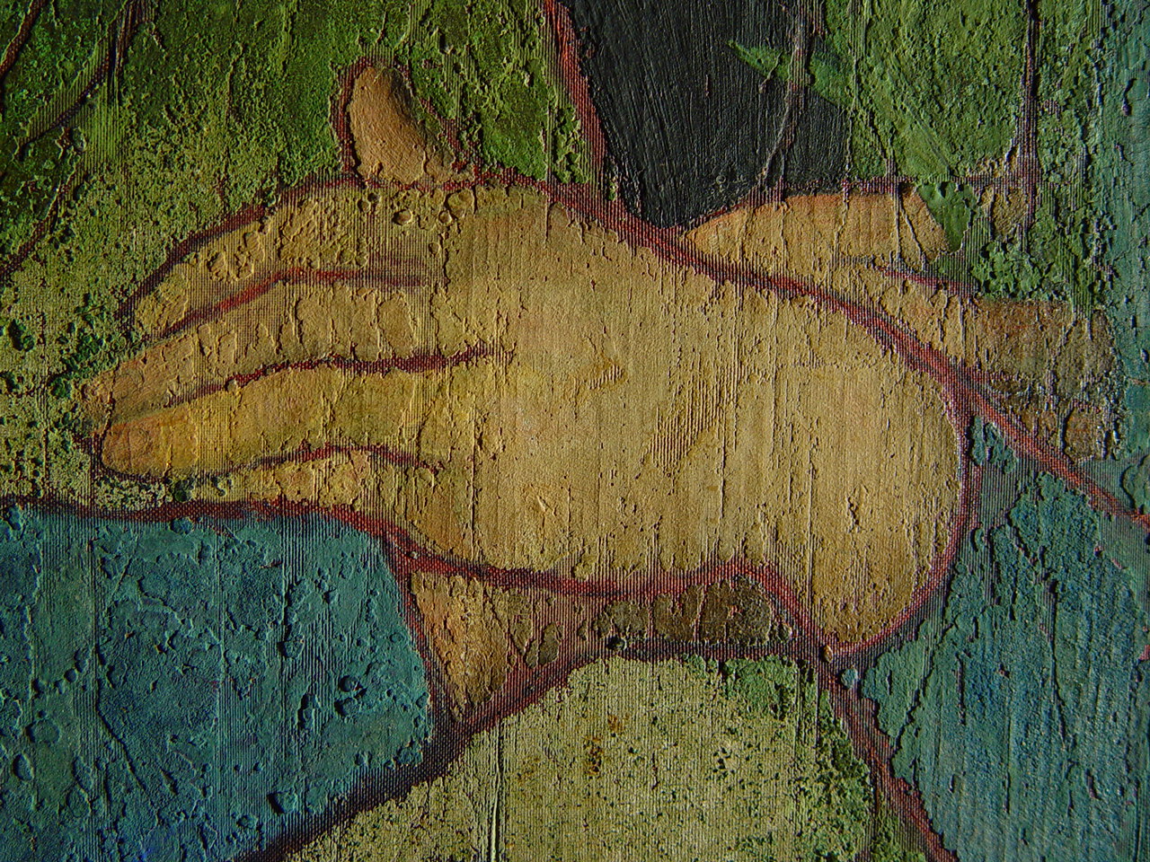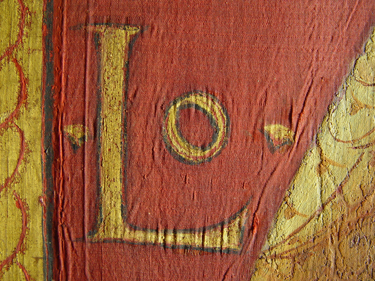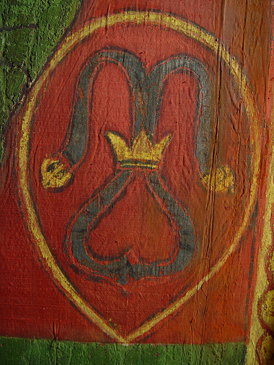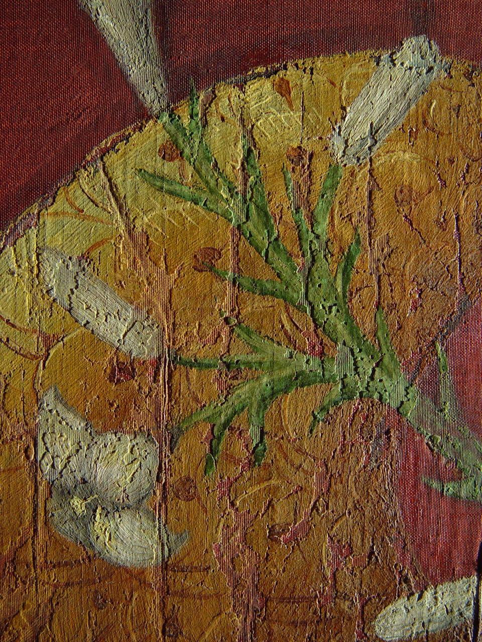 Численні злами тканини з численними осипами фарбового шару по зламам. Часткова втрата тканини ліворуч та частково праоруч.,