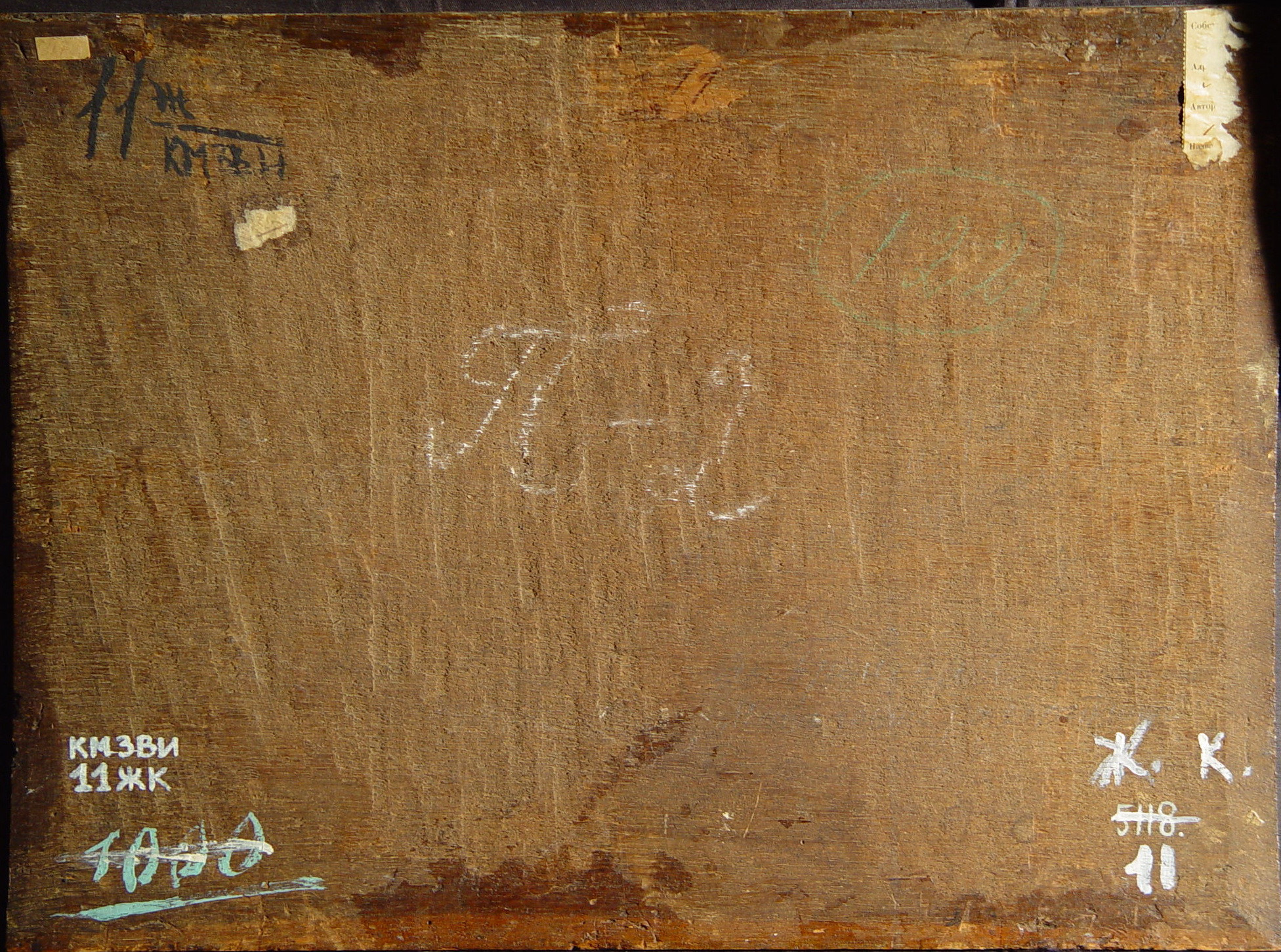 Задовільний. Сліди механічного пошкодження, подряпини, дрібні випади фарби та потертості уздовж бортів. Без рами. Короблення дерева максимальною висотою 2,5 см. Реставраційні тонування. Покривний шар пізній, лаковий. Потребує профілактичного огляду.,