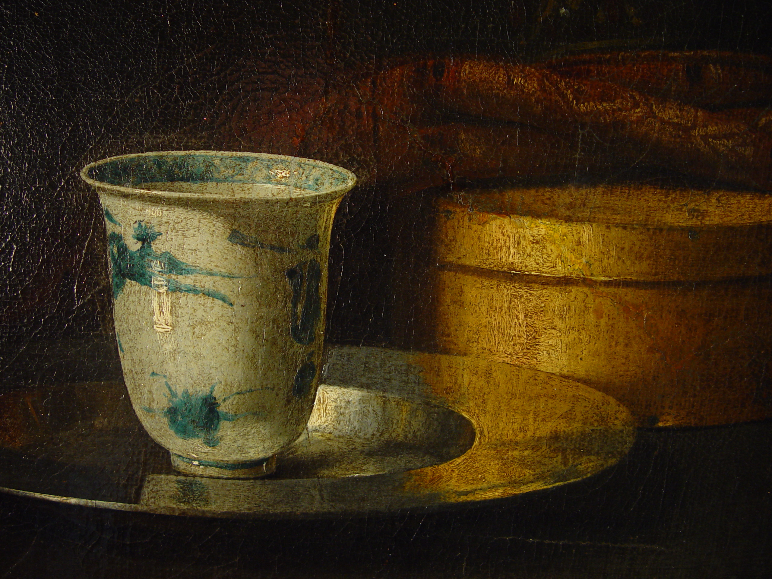 Дубльована. Лінії злому полотна : вертикальна, зигзагоподібна у 12 см над чашкою у лівій частині картини, горизонтальна на столі. Кракелюр з піднятістю бортів повсюдний, незначні потертості фарбового шару по кракелюру. Плями бруду у фактурі. Дрібні збоїнки,