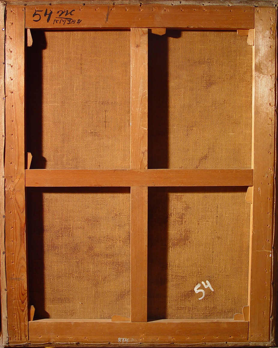 Задовільний. У рамі. Підрамок придатний. Окрайки полотна обрізані. Дубляж окрайка. Зв"язок грунту з основою послаблений. Кракелюр дрібносітчастий з підійнятими краями на 0,1 см. Відшарування без загрози осипань бл. 50% (локальні - коричневе тло); із загрозою та втратою 0,3х0,5 (66,5;18). Зв"язок фарбового шару з грунтом задовільний. Втрати фарбового шару: осипання бл. 5%. Покривний шар пізній, лаковий. Пилові забруднення з обох боків. Потребує профілактичного огляду.,