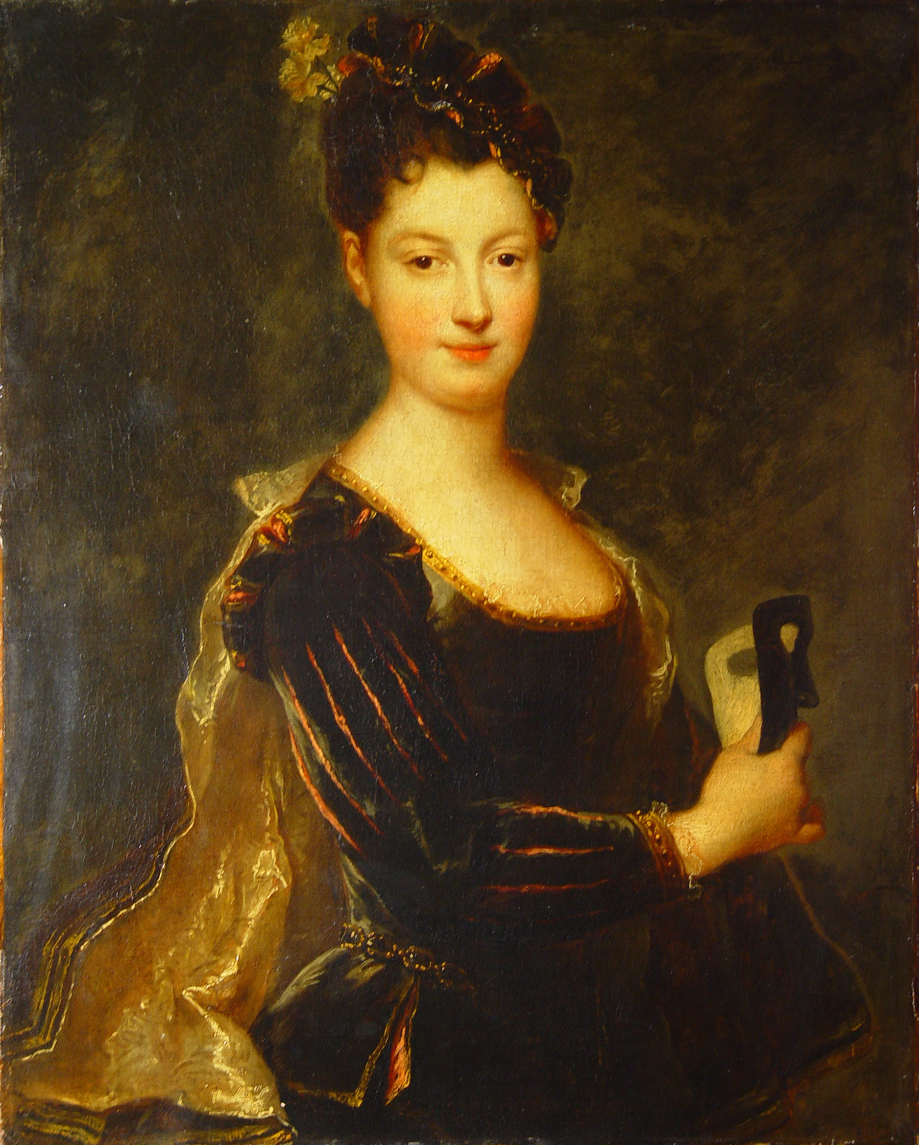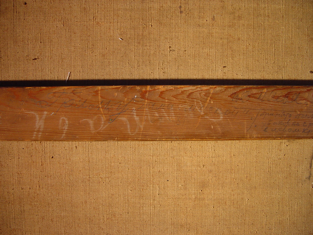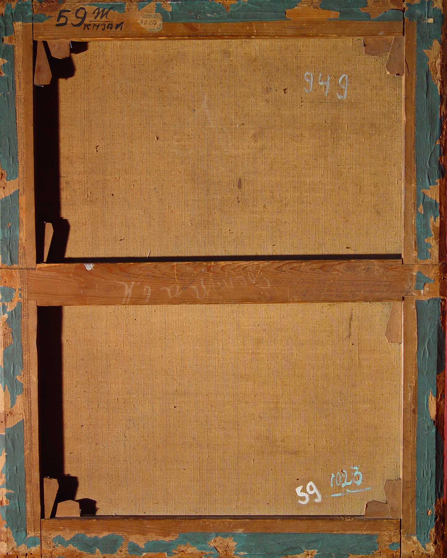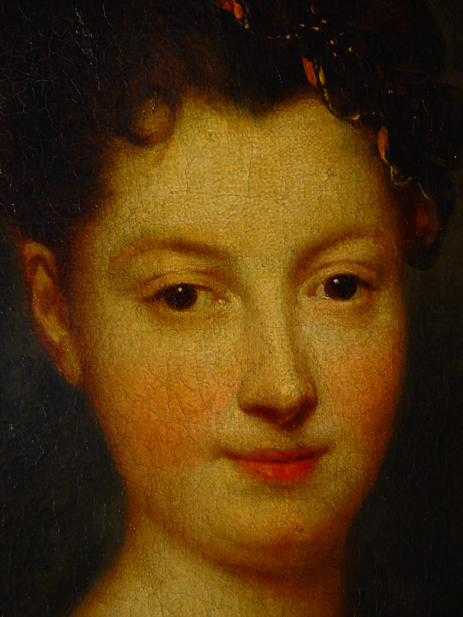 Підняття полотна на місці розриву на лівому плечі. Легке помутніння лаку.,