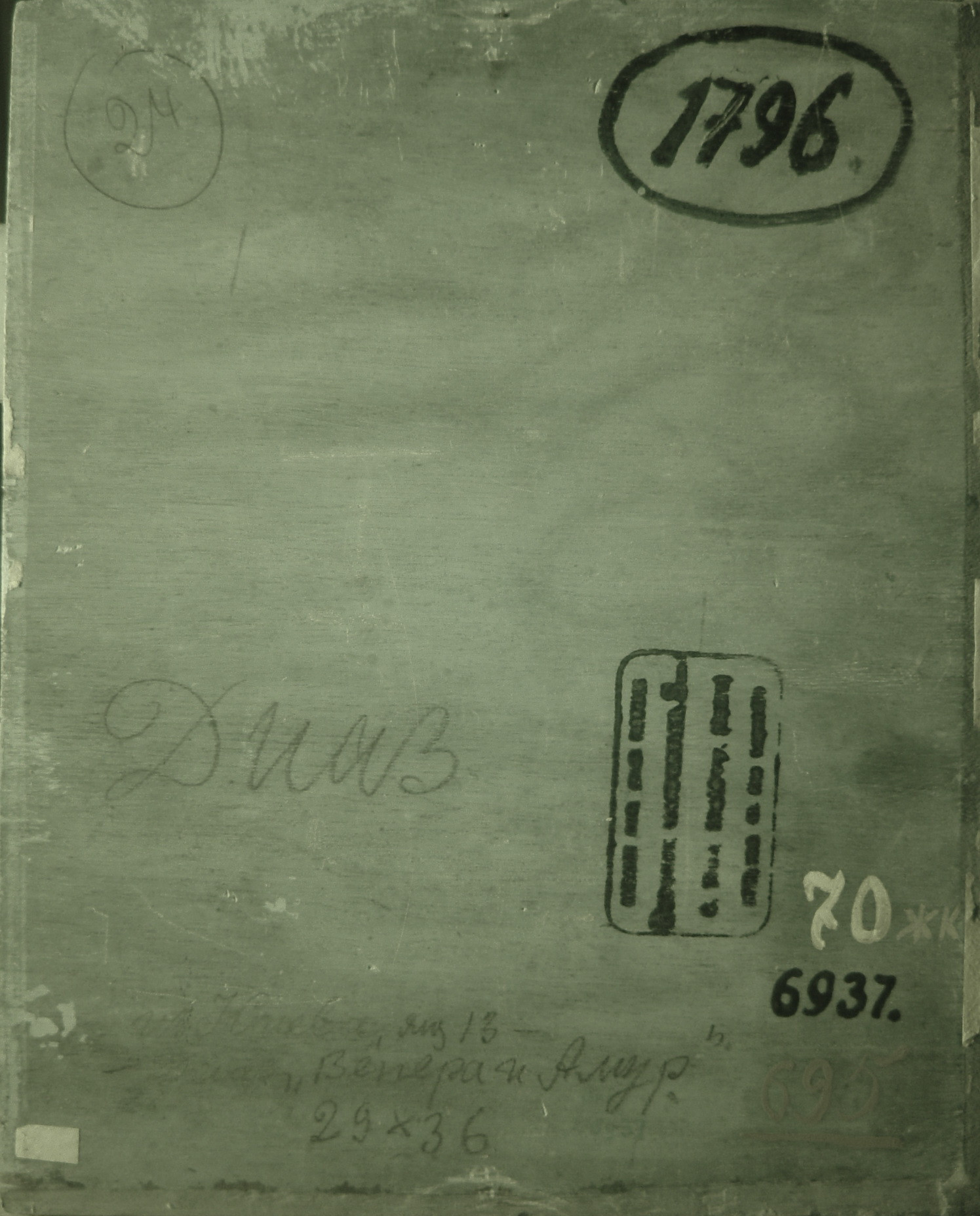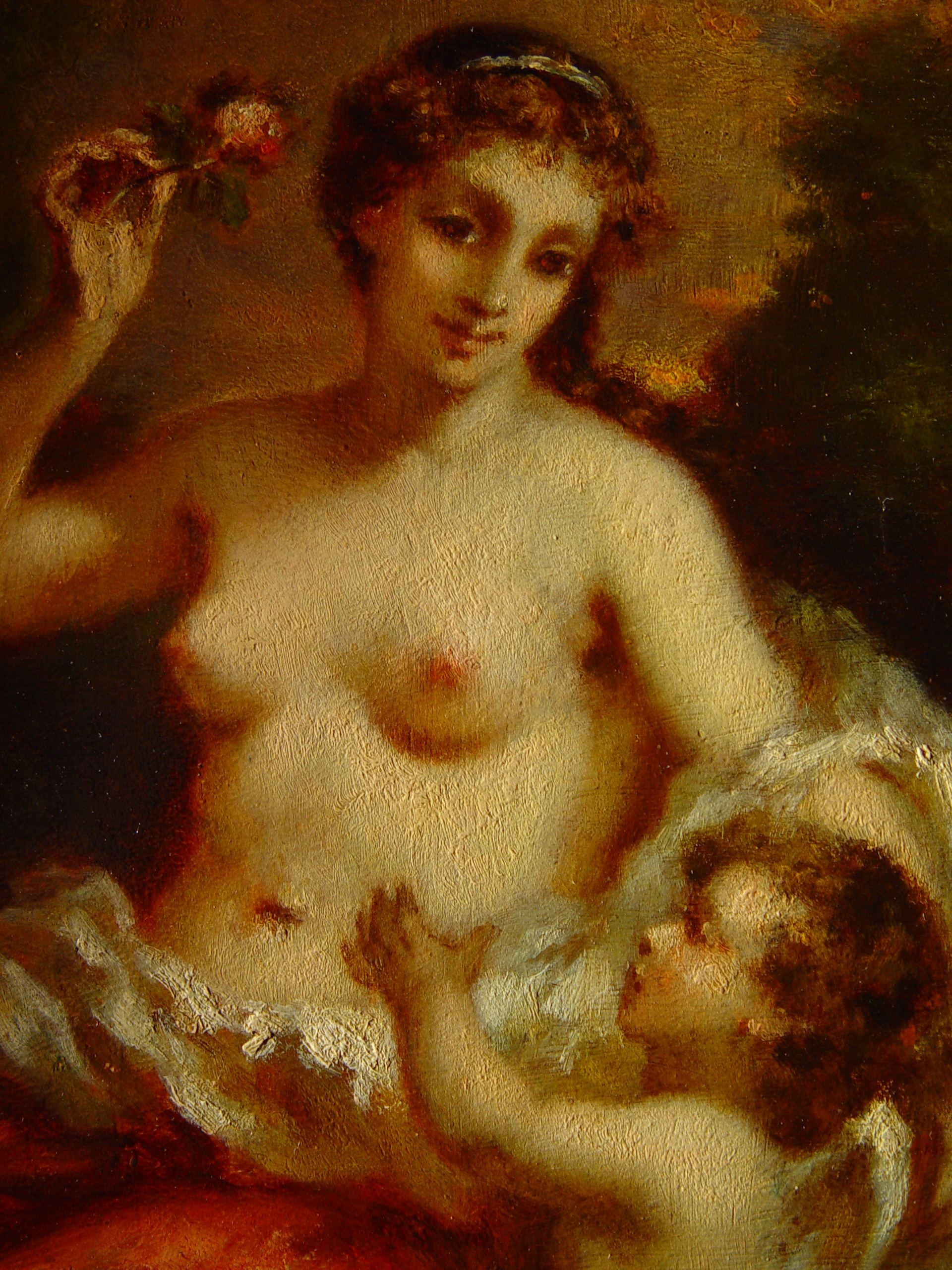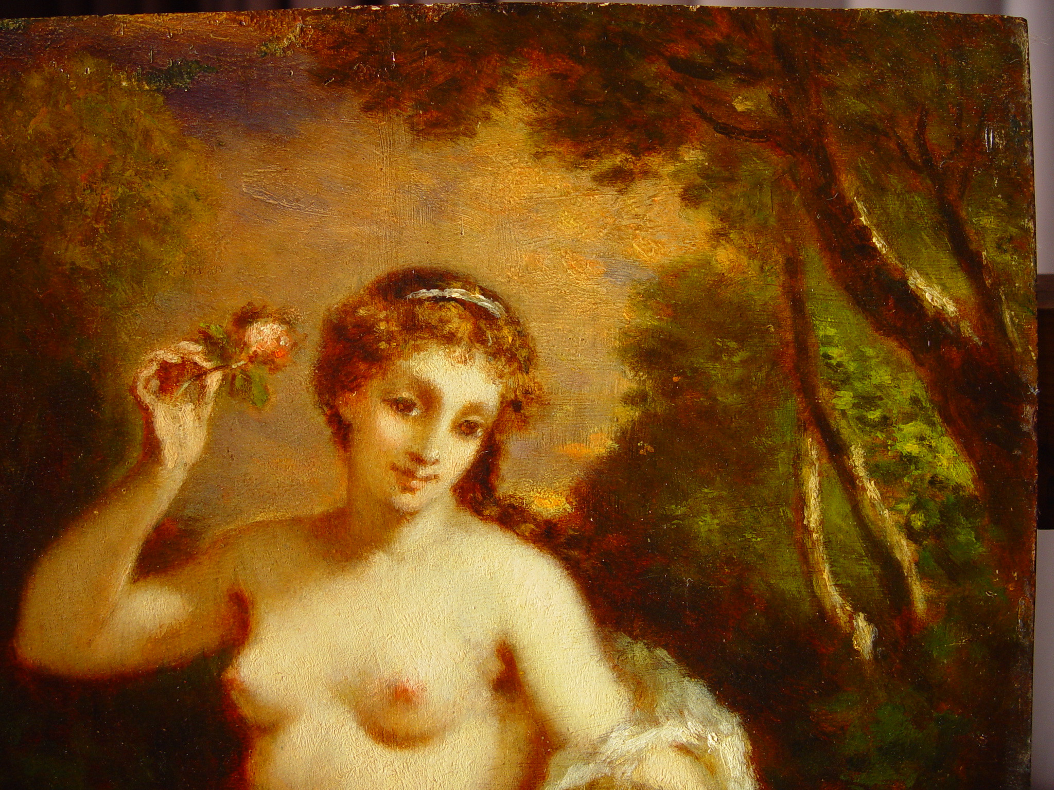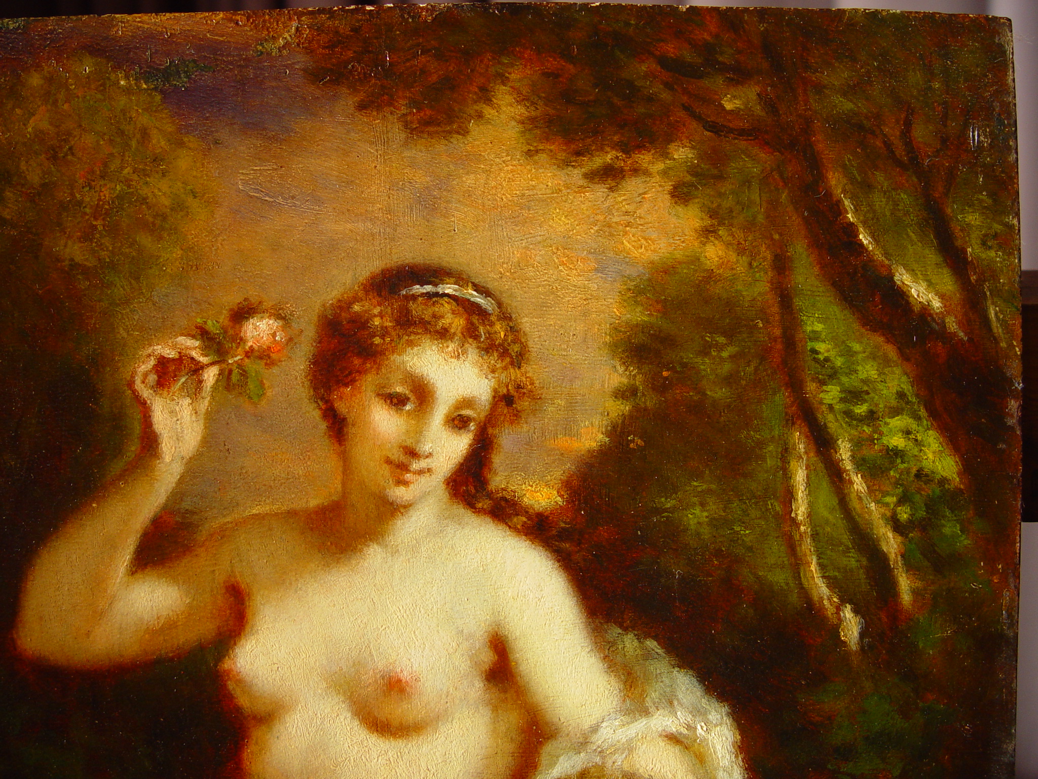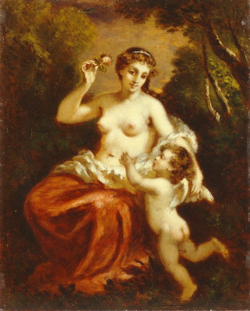 Кількість: 1/Опис: В центрі зображена напівоголена молода жінка. Торс її повернутий вліво, голова злегка нахилена вліво. В правій піднятій руці Венери - квітка, ліва опущена на крильце Амура, який стоїть справа і тягнеться до квітки. Ноги Венери покриті помаранчево - червоною тканиною.Фоном слугують дерева, в просвіті між ними - освітлена рожева хмара./N негат.: 291с