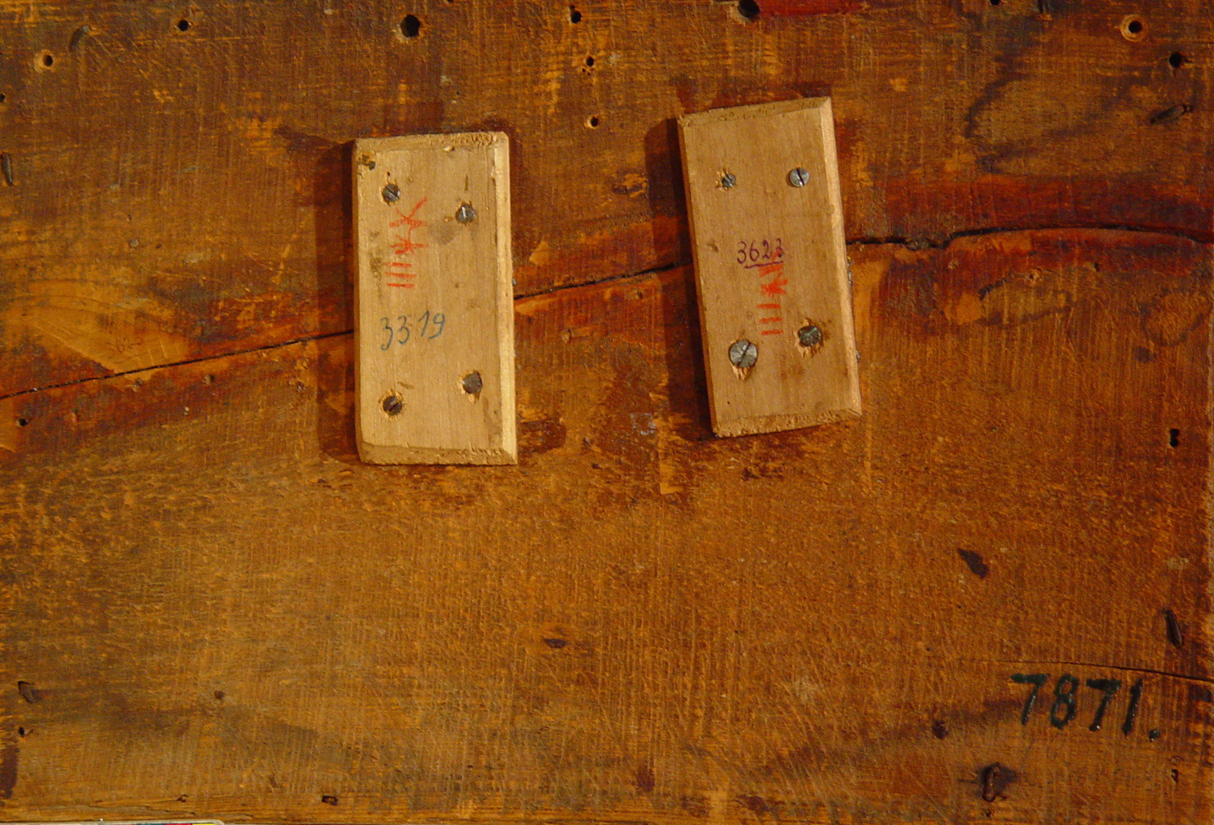 Численні реставраційні заправки. Тріщини в дошці. В різних місцях втрати, особливо зліва вверху.,