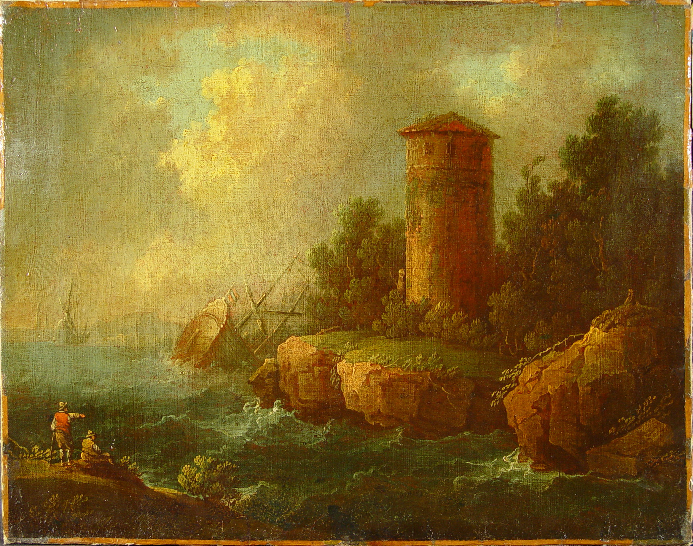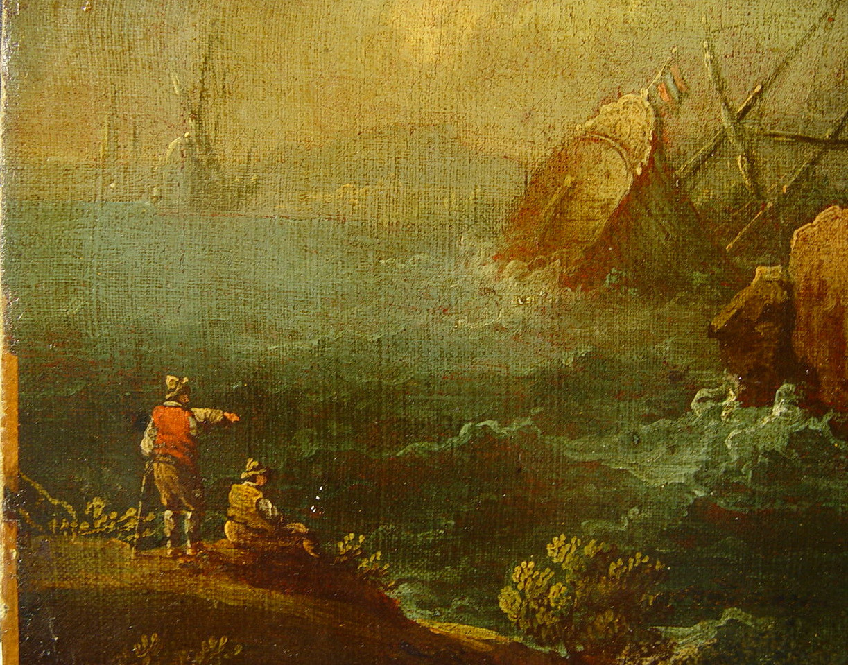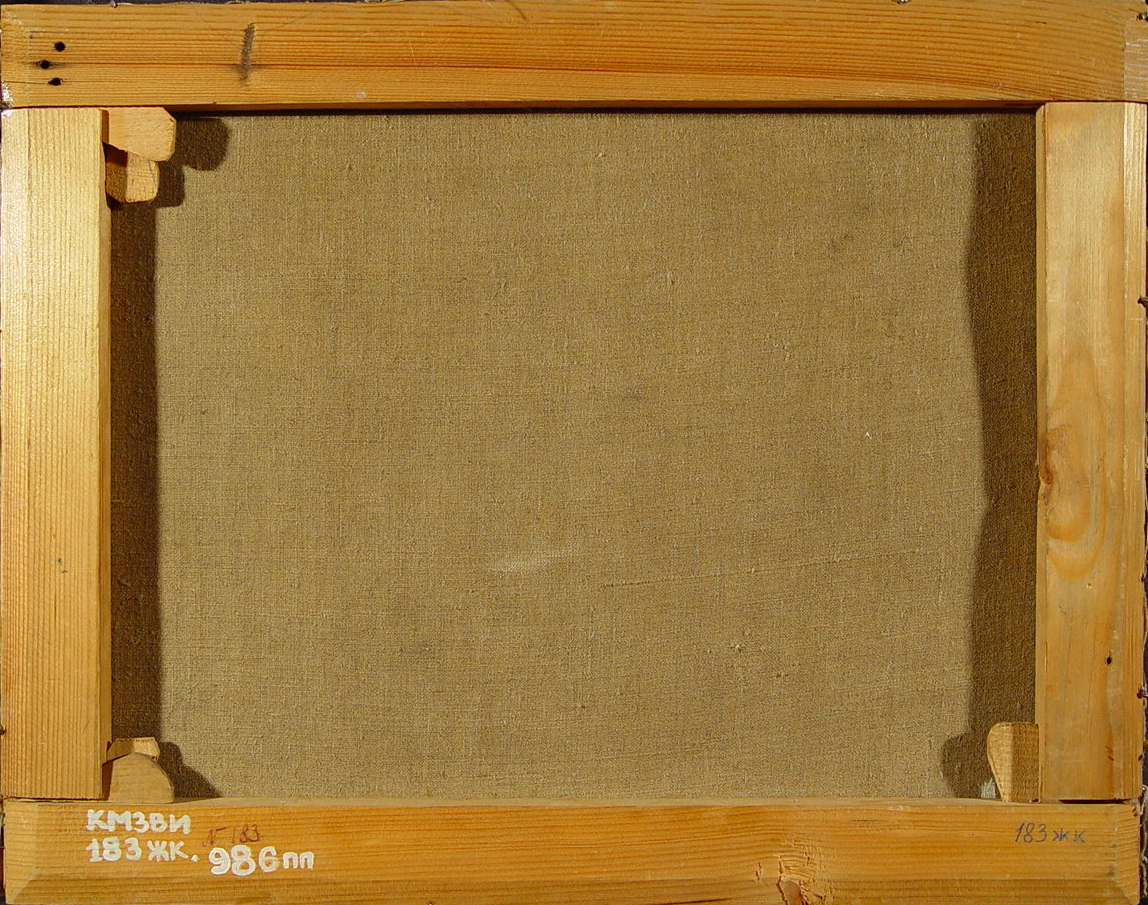 Без підрамника, у нижній частині кілька подряпин.Без рами. Підрамок неавторський, підлягає ремонту. Окрайки полотна обрізані. Обклеєна по периметру папером. Втрати фарбового шару: осипання бл. 3%. Реставраційні тонування по реставраційному грунту змінили тон на 3% (н. кр.). Покривний шар пізній , лаковий, нерівномірний, потемнілий. Потребує підготовки до експонування., Деформацii: загальні, Деформацii: провисання, Покривний шар: пізній, Покривний шар: лаковий, Покривний шар: нерівномірний, Покривний шар: потемнілий,