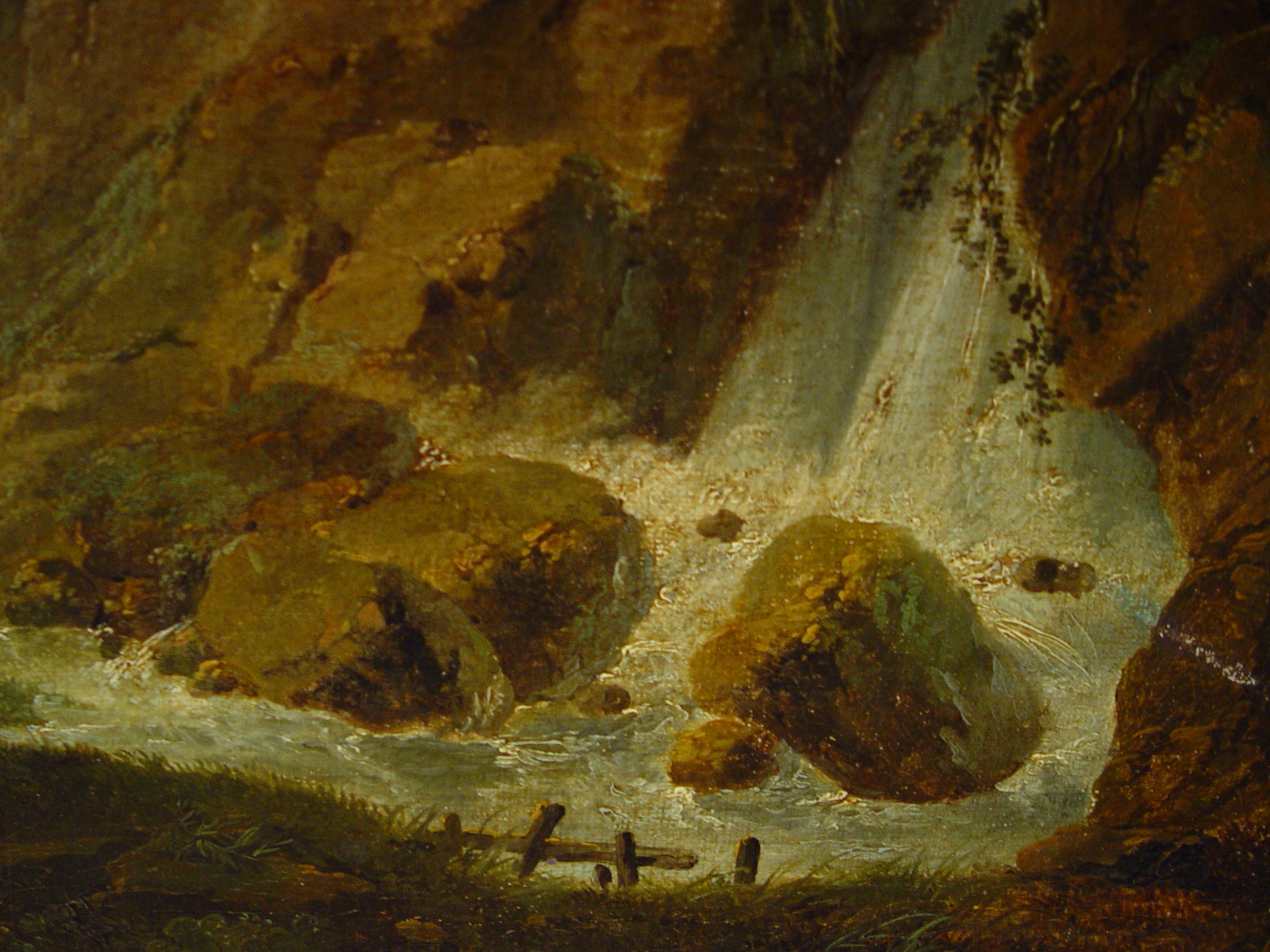 Дрібносітчастий кракелюр. Заломи уздовж внутрішньої грані планок підрамка. Втрати фарбового шару й ґрунту по периметру, глибокі подряпини (до червоного ґрунту) 0,5х0,5 (46; 6,5) та 0,5х0,5 (46; 47). Дрібні потертості до білого ґрунту по опуклим частинам ниток: 27х22 (28; 20), решта перекрита тонуванням, на значній площі (переважно на зображенні неба). Група подряпин у верхніх фарбових шарах 9х2,5 (19;24 – на межі зображення кручі); діагональна 0,5х5 (11;75 – частково тонована).