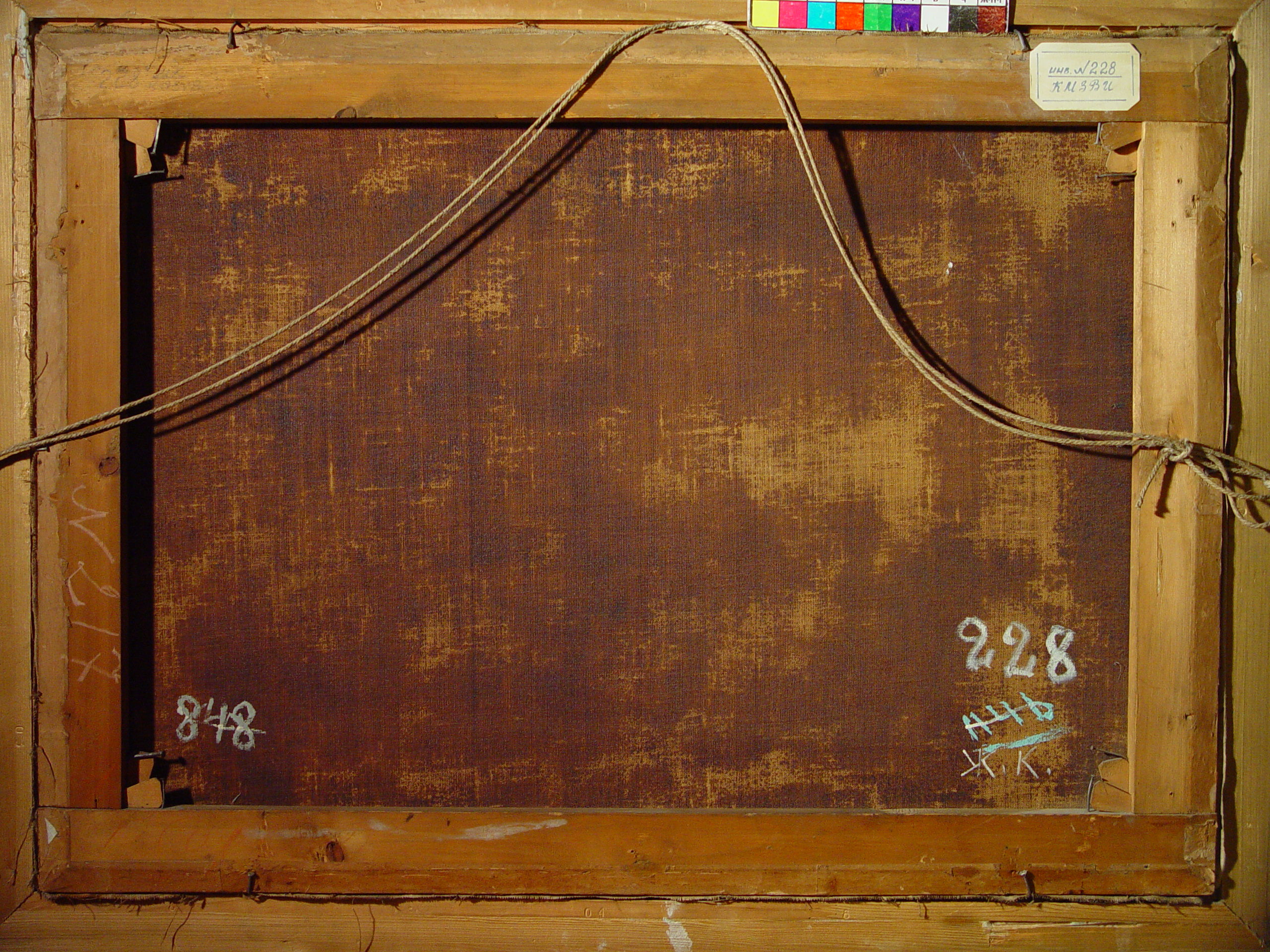 На великозернистому полотні з двошаровим ґрунтом (нижній – темно-червоний, верхній – білий). Натягнуто на розсувний підрамок. Крайки обрізані, картина дубльована на середньозернисте полотно (коричневий клей пройшов на тильний бік). Краї обрізані нерівно, подекуди нитки висатані. Уздовж нижнього краю по центру – часткове роздублювання ділянки 0,5х2 см, яка заломлена, з втратою ґрунту (0; 45). Відшарування авторського полотна від дублювального у кількох місцях вздовж периметру (довжиною 2 – 4 см).