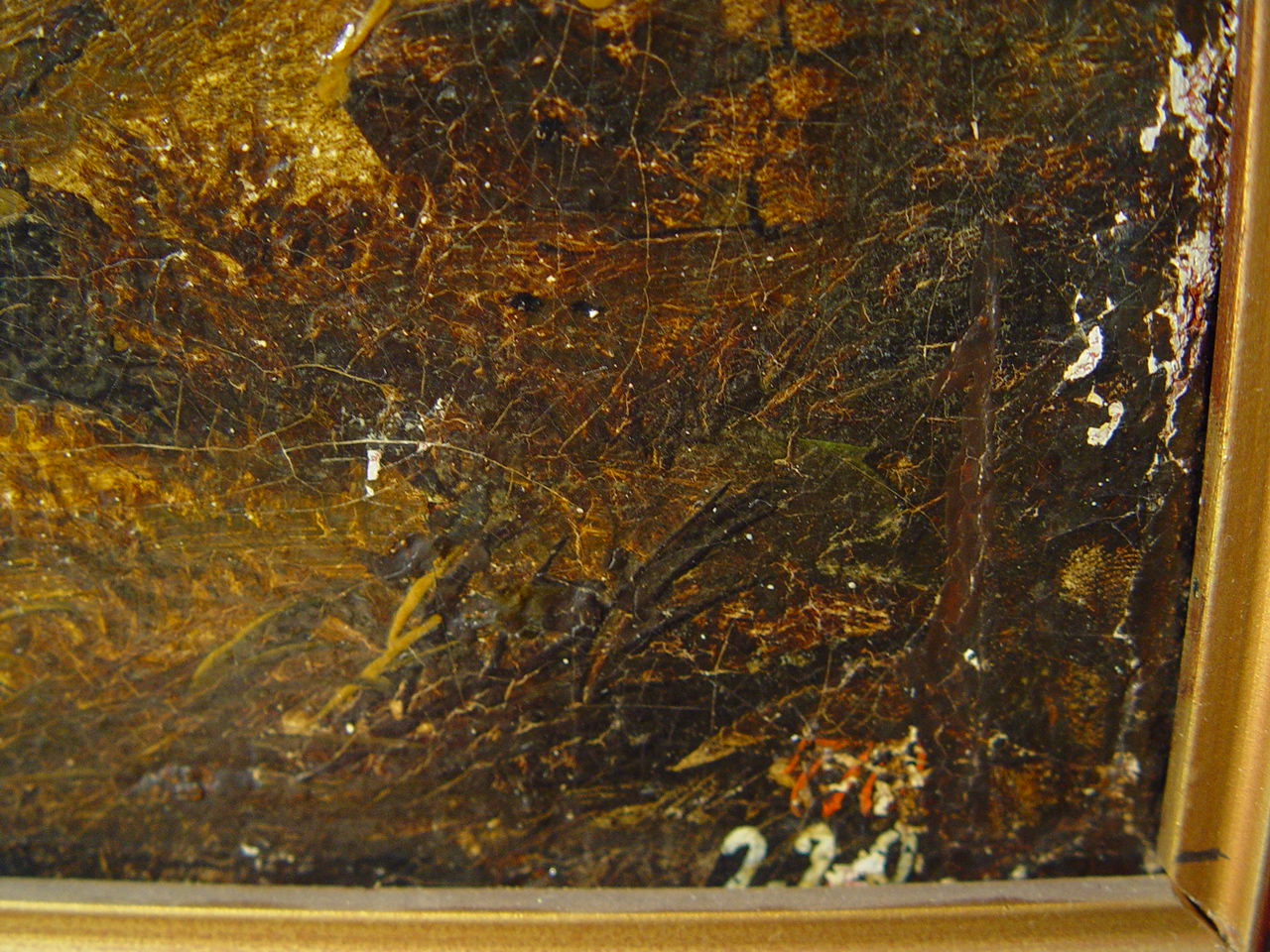 Старий неавторський пожовклий лак з коричневими згустками у фактурних заглибленнях. Змінені у тоні перемалювання по периметру та у багатьох місцях (переважно на зображенні неба): по верхньому краю (смуга шириною 1 – 3 см), по правому краю (≈1 см); на небі: група 4х12 (50;21); 1,5х3 (54; 48); група 9х8,5 (у верхньому лівому куті); 15х0,5 (41;2); група 2,5х1,5 (56; 3,5); 1,5х0,5 (58;46); 2,5х13 (57;69) (поблизу верхнього краю праворуч); 7х15 (49; 18).