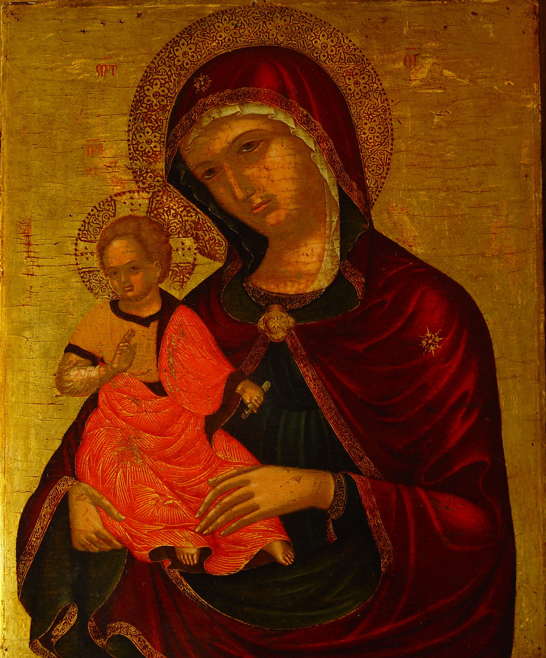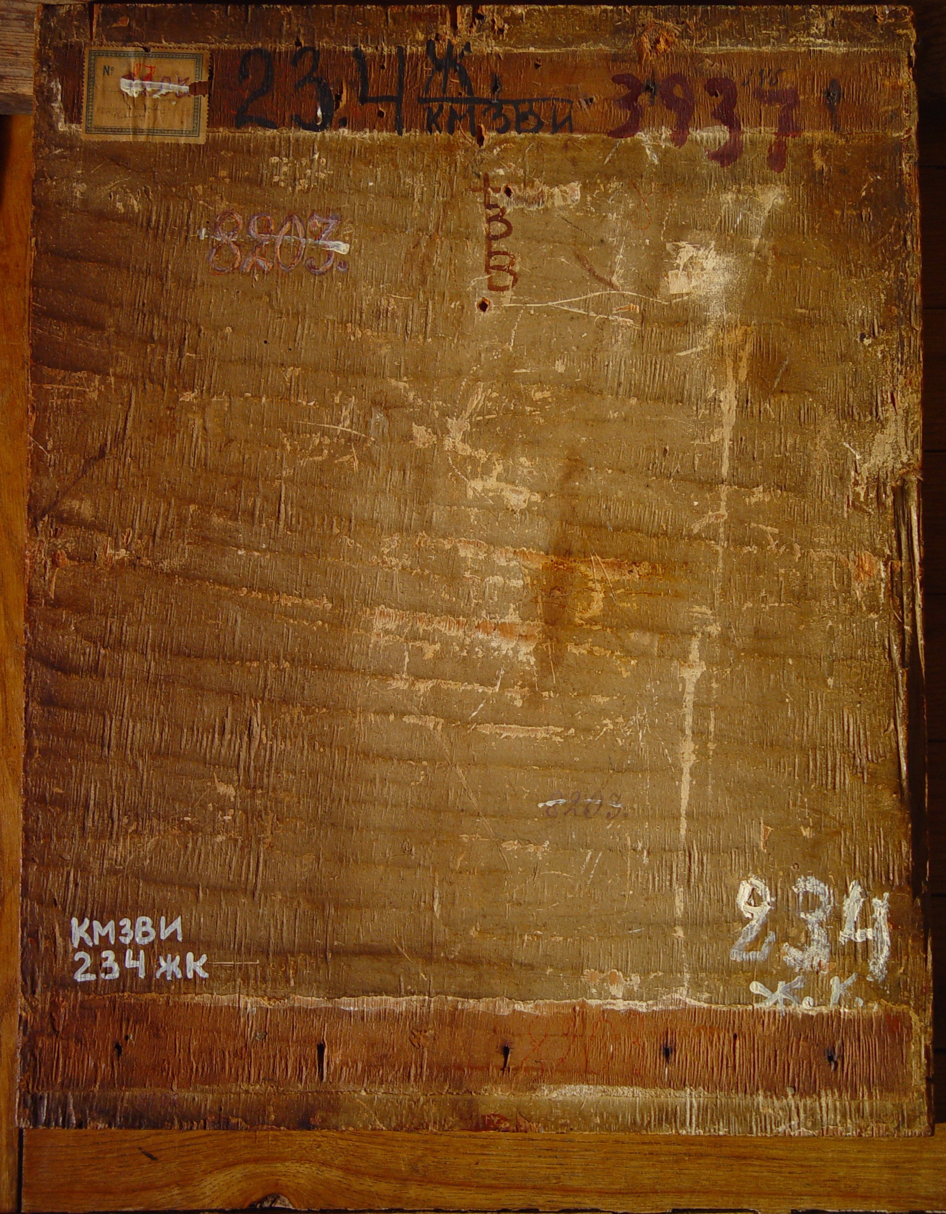 Задовільний. Помутніння лаку, обличчя змиті при реставрації. Дрібні подряпини з випадом фарбового шару.Дерево, планки кількістю 2, з них втрачені 2. Втрати грунту: локальні , по н.к. 0,5х1 - свіжа втрата в. шару. Втрати фарбового шару: помитості бл. 5%, локальні (лики). Покривний шар пізній, лаковий. Пилові забруднення з обох боків. Потребує профілактичного огляду.,