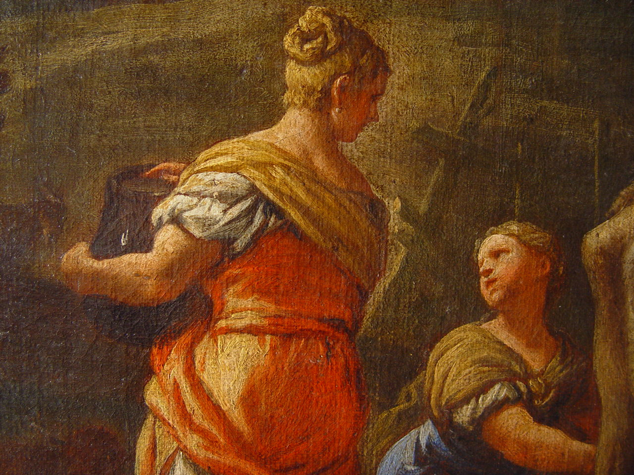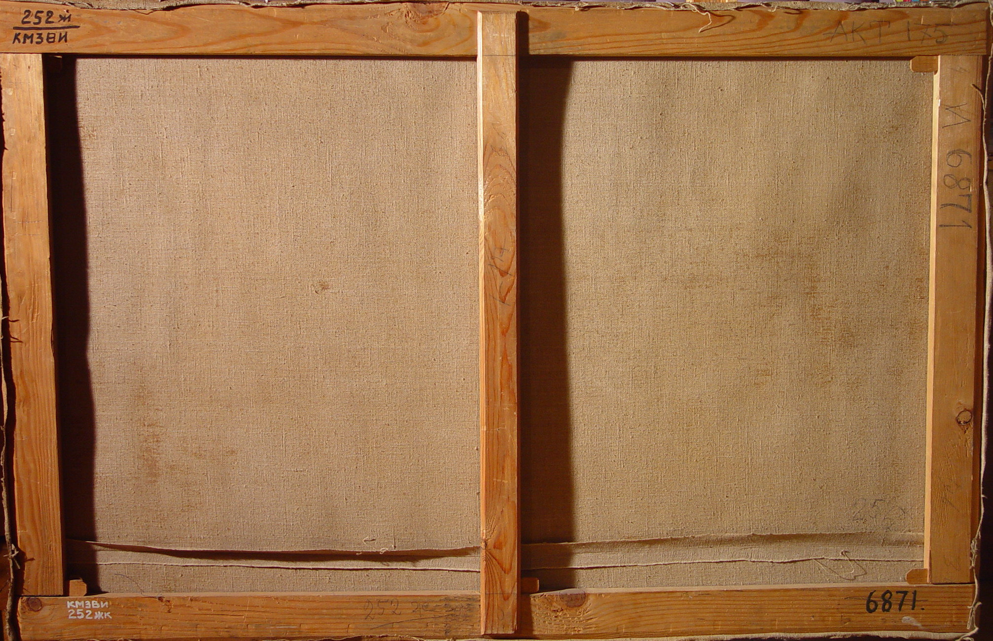 Дубльована, пожухла. Підрамок неавторський,підлягає ремонту. Окрайки полотна обрізані. Дубляж повний. Зв"язок грунту з основою задовільний. Зв"язок фарбового шару з грунтом задовільний. Втрати: помитості бл. 20% , локальні (небо). Реставраційні тонування змінили колір на 5%, переважно по краях. Покривний шар пізній, лаковий. Пилові забруднення з обох боків. Потребує підготовки до експонування.,