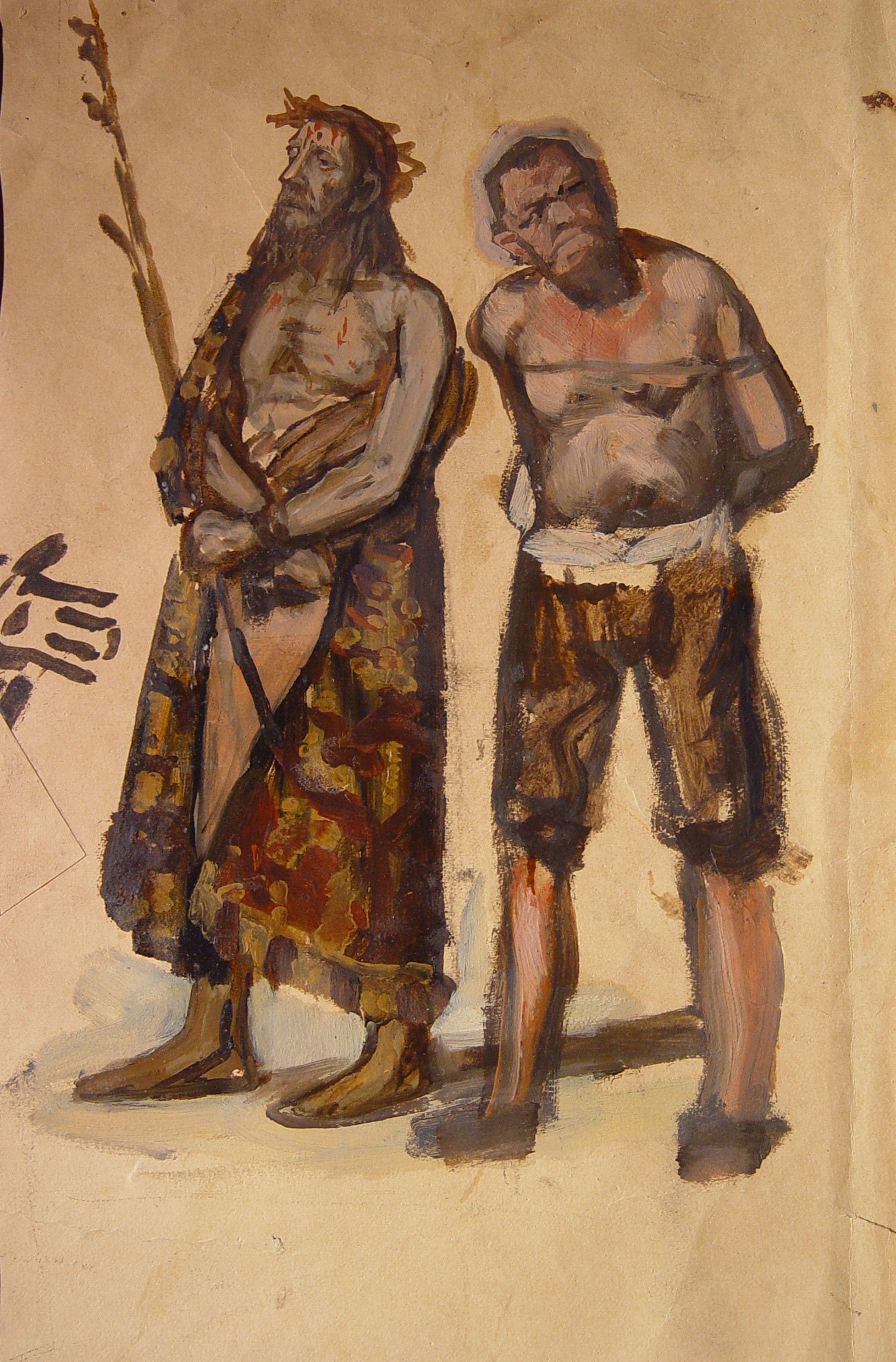 На папері кілька заломів. Ліворуч внизу пом"ятини, подряпини та подекуди прориви. Є великі заломи. Папір пом"ятий та в жовтих плямах.Розриви паперу бл. 4 см., злами. Двобічний лист. У рамі ( паспарту), під склом. Потребує підготовки до експонування.,