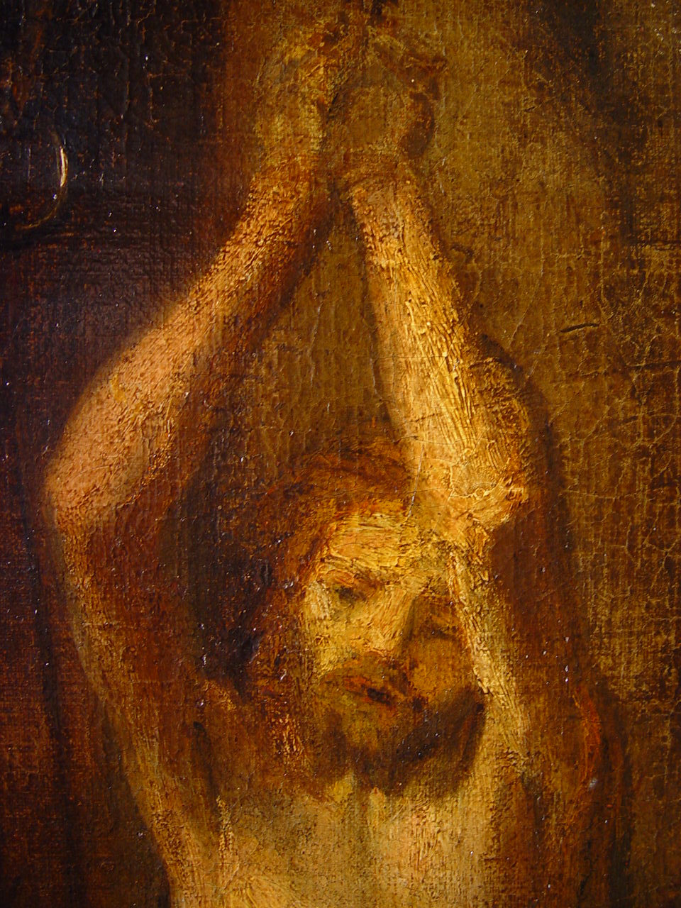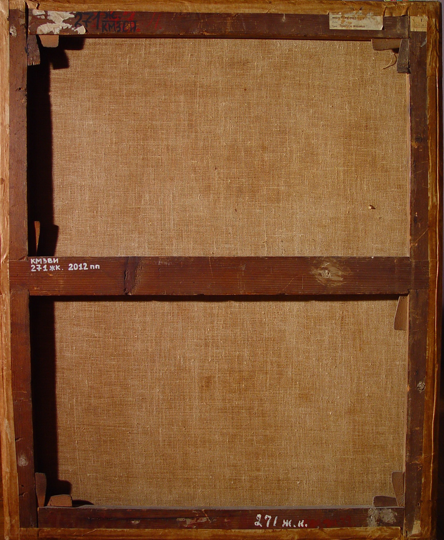Задовільний. Картина дубльована на нове полотно. Пройшла повну технічну та живописну реставрацію в Ермітажі. Підрамок неавторський,придатний. Окрайки полотна обрізані. Обклеєна по периметру. Дубляж повний. Зв"язок грунту з основою задовільний. Кракелюр середньосітчастий. Втрати фарбового шару: помитості бл. 10%, локальні (тло). Етикетки. Покривний шар пізній, лаковий. Пилові забруднення з обох боків. Дані про реставрації: Г. Е. Рест. № 2.... Копія 19 ст.(?). Потребує підготовки до експонування.,