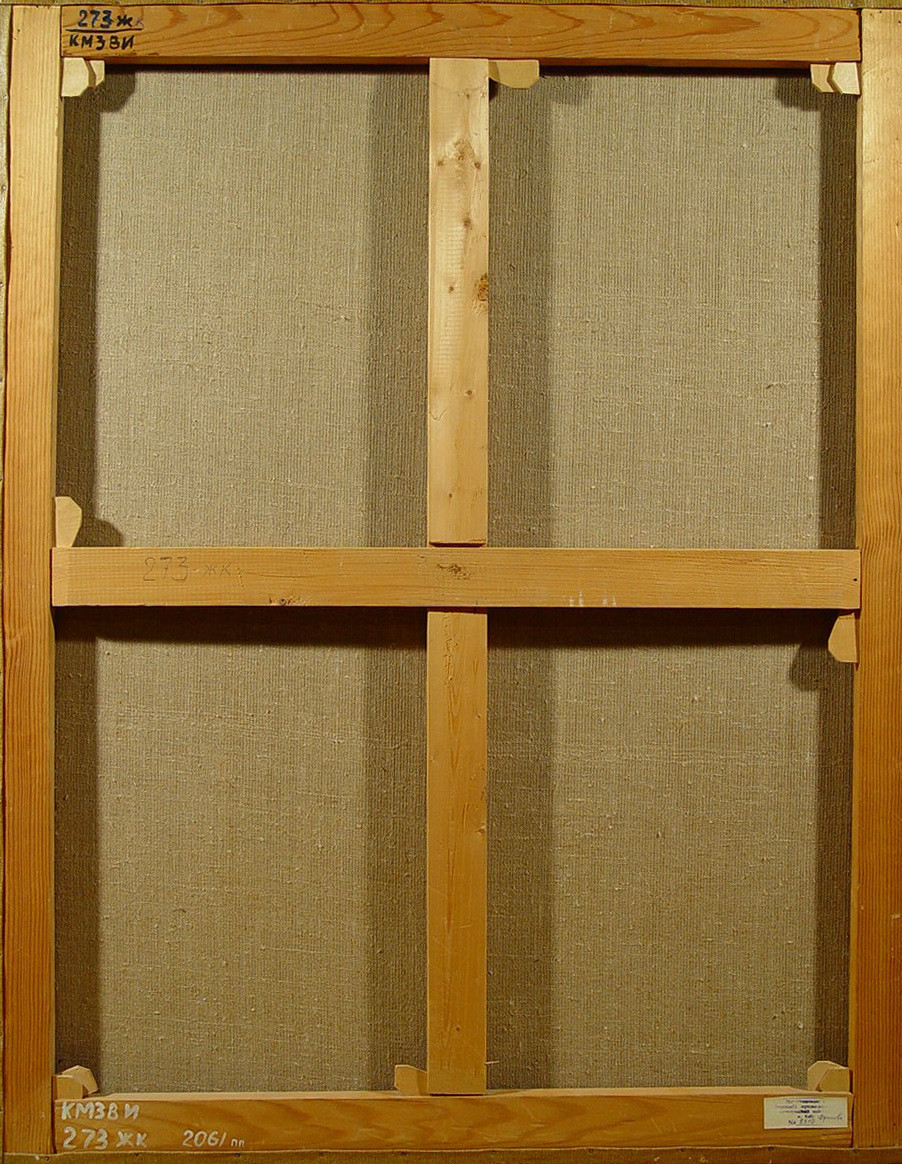 Дубльована. Повсюдні випади фарбового шару, особливо по краях картини, у правому верхньому та лівому нижньому кутах кракелюр. Забруднення.Без рами. Підрамок неавторський, придатний.Окрайки полотна пошкоджені, обрізані (разом з частиною живопису).Дубляж повний. Реставраційні тонування по реставраційному грунту змінили тон на 5%. Покривний шар пізній, лаковий. Пилові забруднення з обох боків. Дані про реставрацію: ДНДРМ № 2810 (Фролова). Потребує профілактичного огляду.,