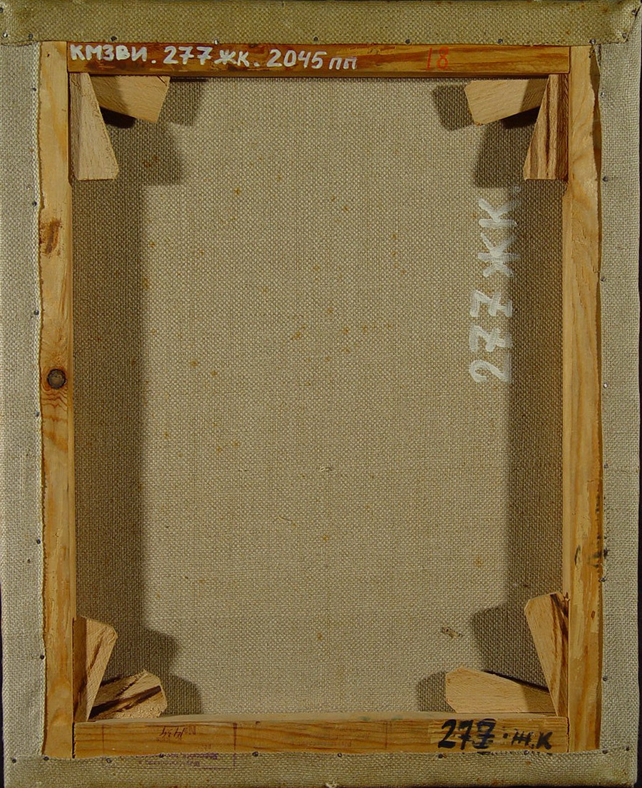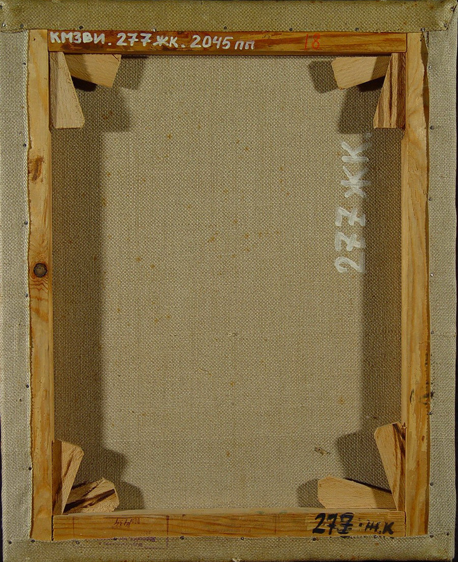 Задовільний. Легке короблення полотна.Без рами (рейки). Підрамок неавторський, придатний. Окрайки полотна обрізані. Дубляж повний. Реставраційні тонування змінили колір на 2%.(по периметру). Покривний шар пізній, лаковий. Пилові забруднення з обох боків. Дані про реставрацію: ДНДРМ № 1434. Потребує профілактичного огляду.,