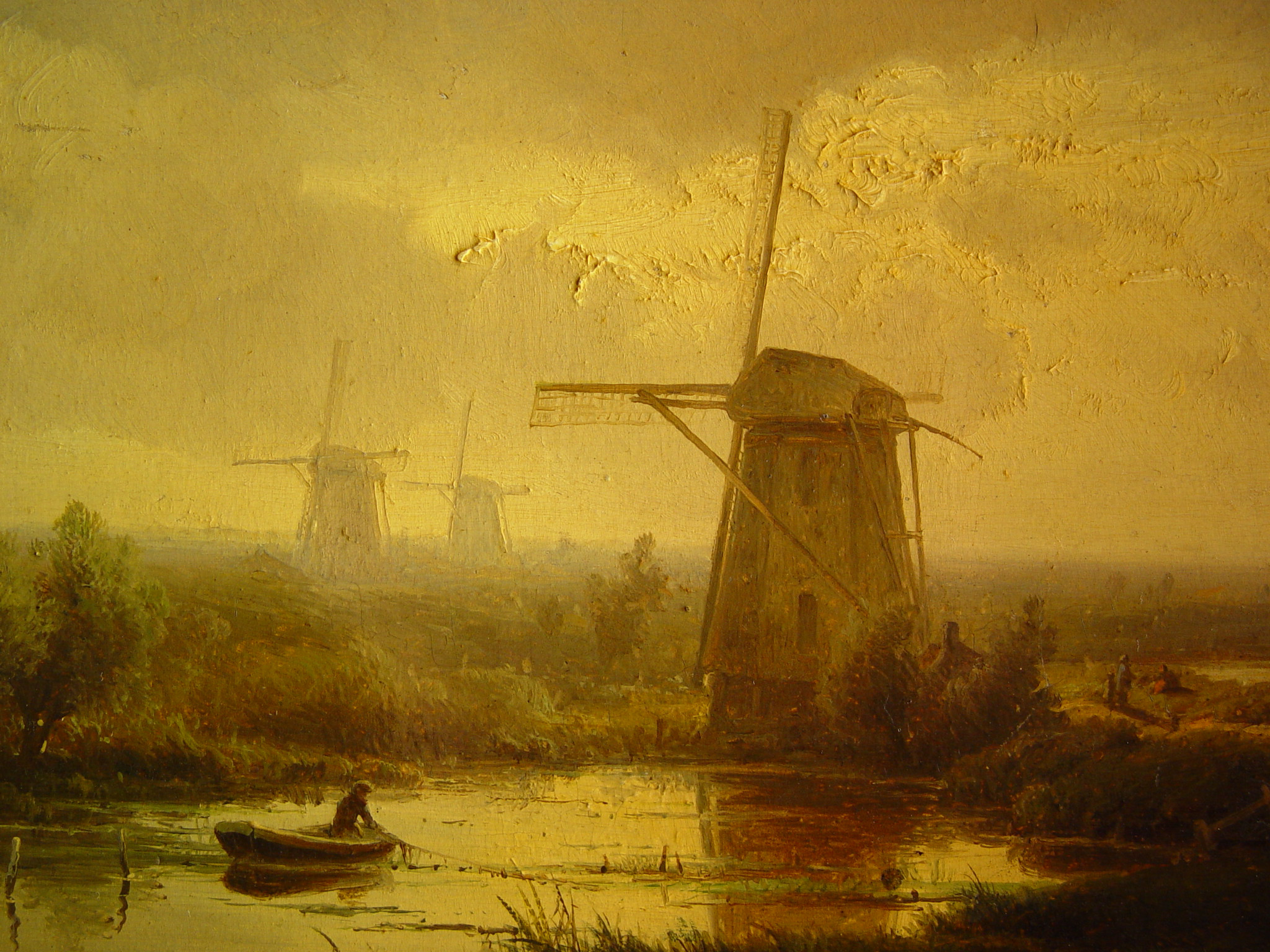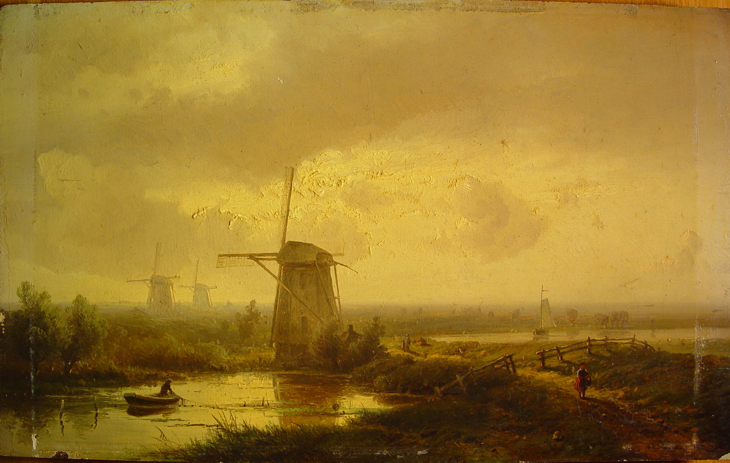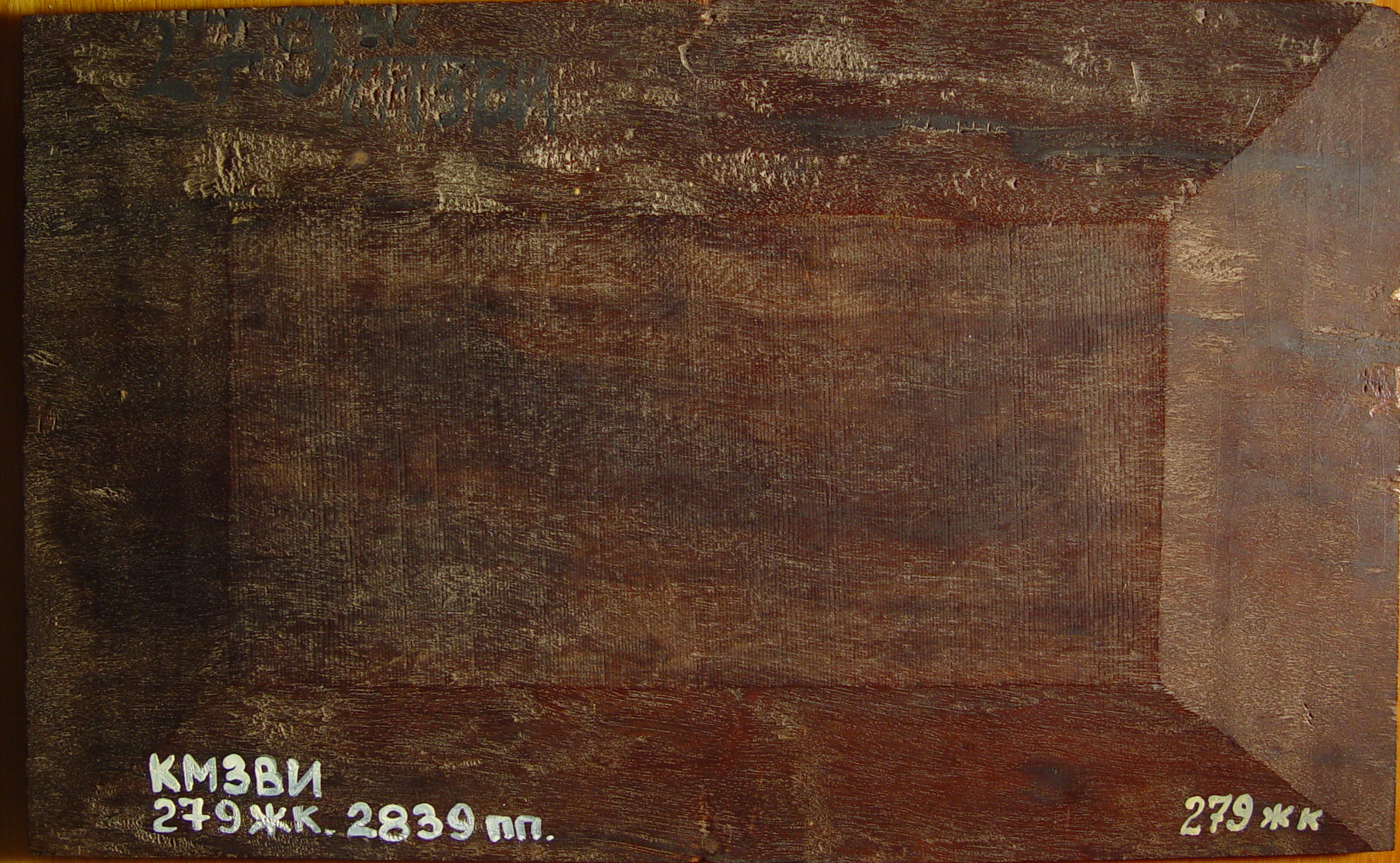 Ущільнений, інтенсивно жовтий та забруднений лак, який уздовж бічних країв (смуг шириною 2 см) має меншу товщину. На смузі уздовж лівого краю унизу – втрата живопису та частково ґрунту, уздовж правого унизу – потертості до ґрунту. Уздовж нижнього краю – слід від рами (вдавлений) на відстані 1,2 см, уздовж верхнього – вдавленість зі слідами темного забруднення на відстані 0,7 см. Втрати ґрунту по нижньому 0,5х1 (0; 3) і верхньому 0,2х1,5 краях, втрати живопису – нижній правий кут (0,5х1), уздовж лівого краю нижче середини 1х0,4 (6; 0,5), над верхнім крилом вітряка 0,5х0,3. Поверхневі забруднення.,