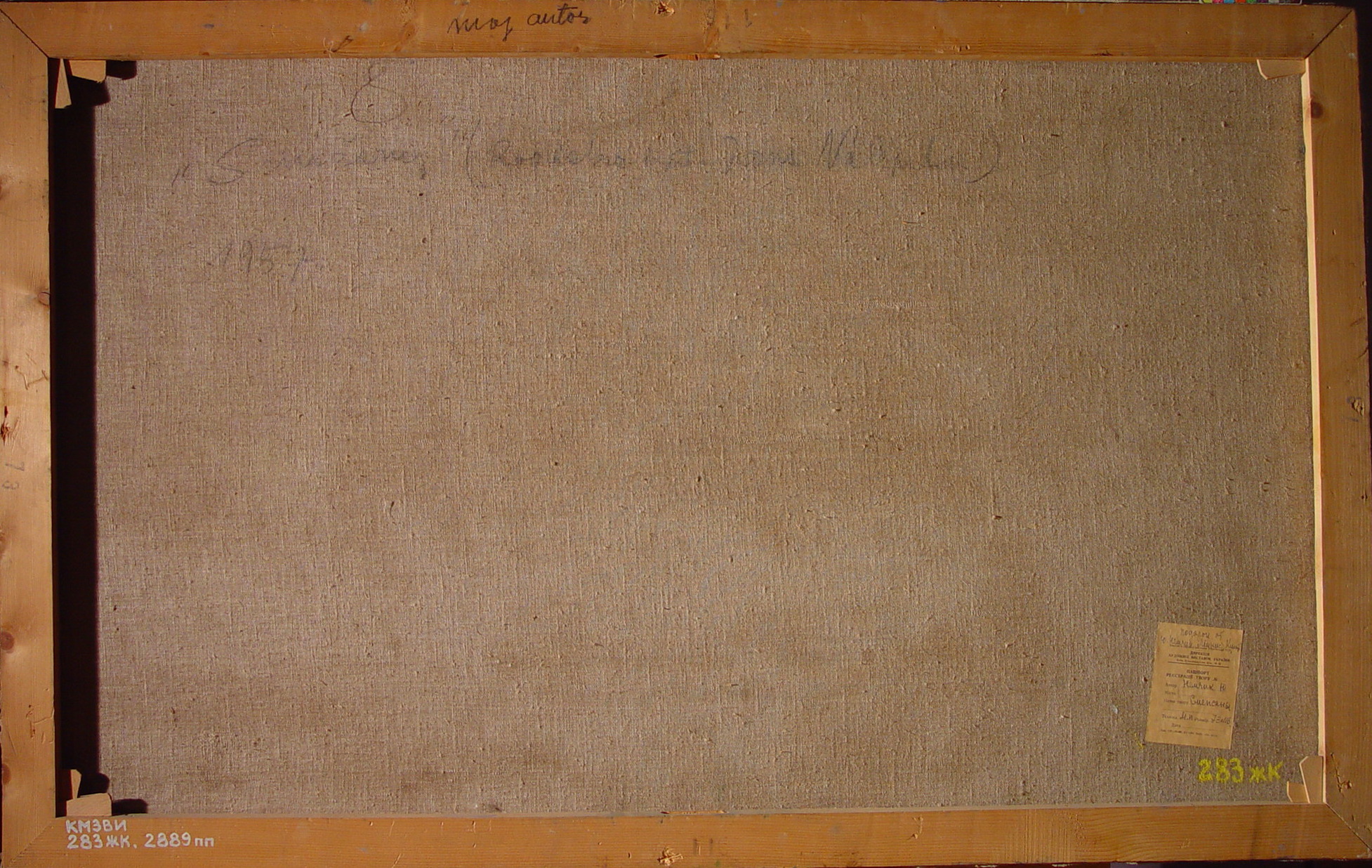 Задовільний.Підрамок авторський, придатний. Зв"язок грунту з основою задовільний. Зв"язок фарбового шару з грунтом задовільний. Пилові забруднення з обох боків. Потребує профілактичного огляду.,