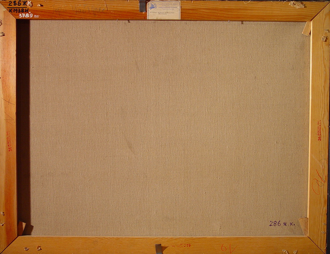 Задовільний. Підрамок авторський,придатний. Локальні деформації полотна ( в кутах). Зв"язок грунту з основою задовільний. Зв"язок фарбового шару з основою задовільний. Пилові забруднення з обох боків. Потребує підготовки до експонування.,
