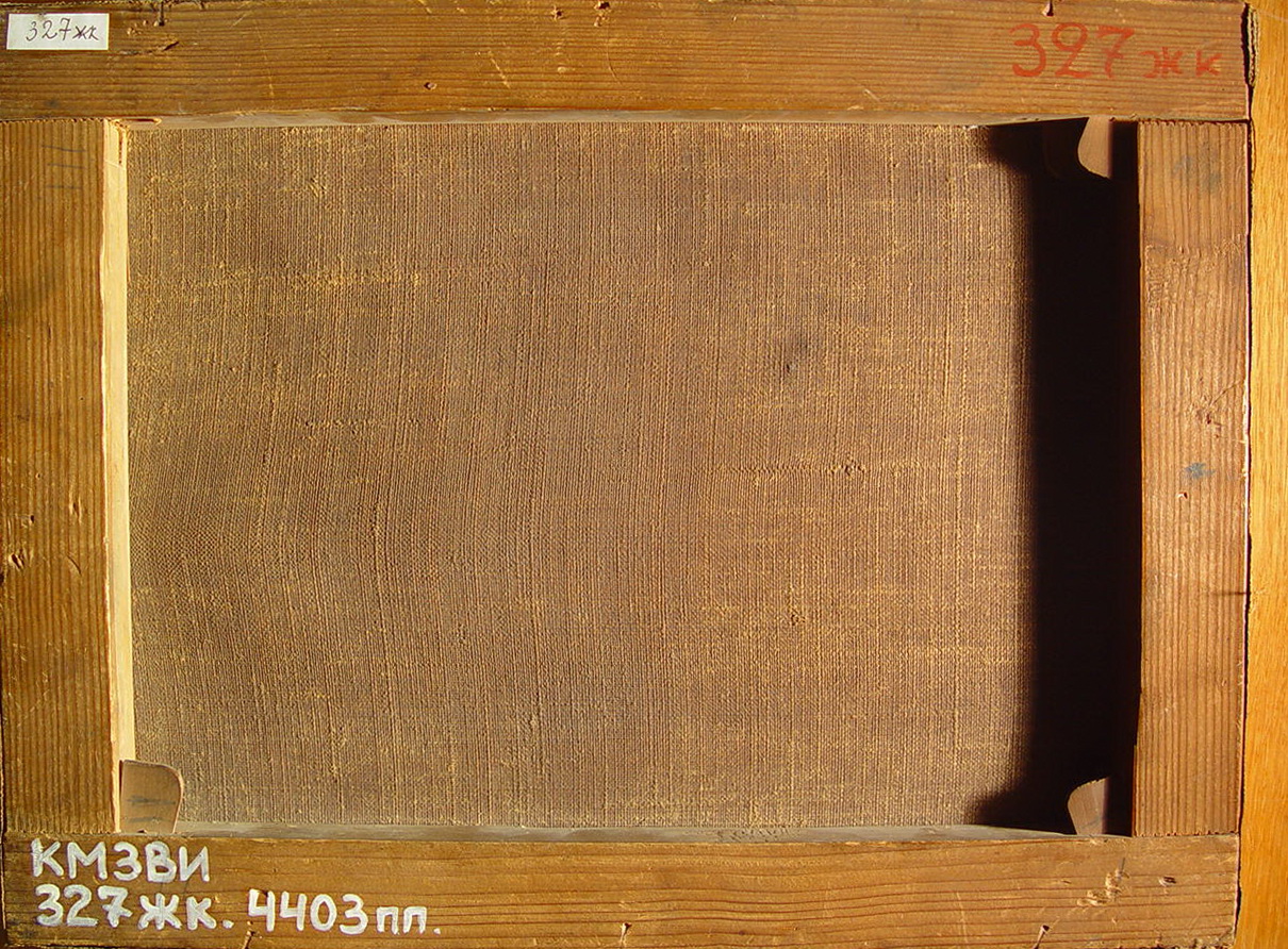Повсюдно дрібносітчастий кракелюр. Уздовж країв проступаючі зі звороту сліди підрамника. По верхньому сліду-тріщина. У лівому верхньому куті на стовбурі дерева невелика втрата фарбового шару.Підрамок авторський,підлягає ремонту. Зв"язок грунту з основою задовільний. Втрати фарбового шару: осипання бл. 1%. Покривний шар пізній, лаковий. Забруднення: плями фарби по краях. Потребує підготовки до експонування.,