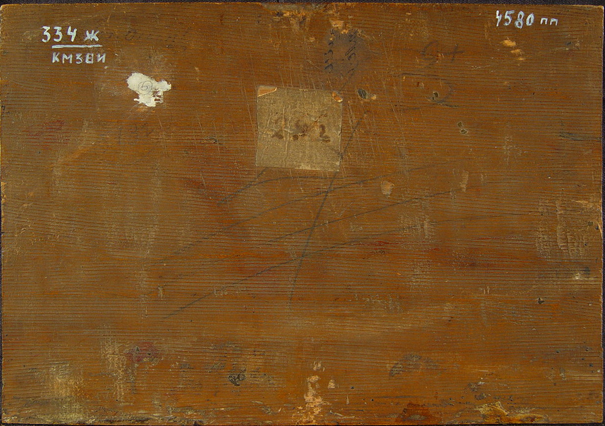 У центрі глибока подряпина з осипом фарбового шару, сліди старої реставрації; тонування змінилося у кольорі.У рамі. Короблення дерева - макс. висота 0,5 см. Втрати фарбового шару: помитості бл. 5%, локальні (небо). Реставраційні тонування змінили колір бл. 1%. Покривний шар пізній, лаковий. Пилові забруднення з обох боків. Потребує профілактичного огляду.,