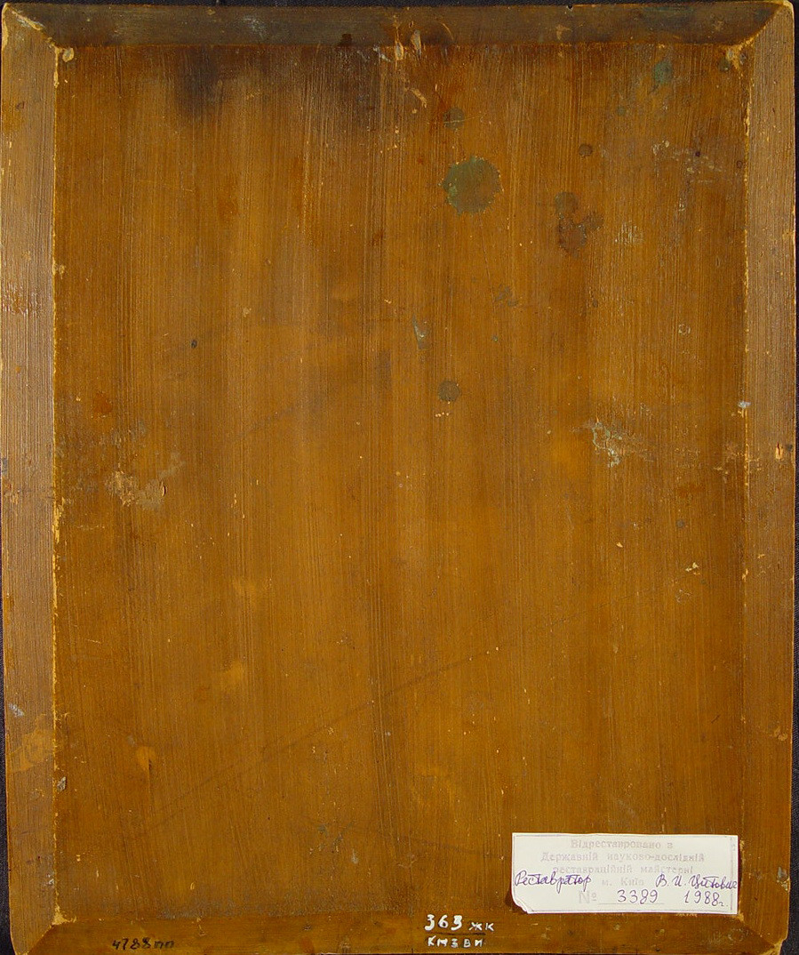 Дошка злегка вигнута, вкрита численними забрудненнями, плямами, сколами, проколами цвяхів. Сліди бугрування фарбового шару вверху, втрати до грунту 3х2,5, 1х1; вверху у центрі наскрізний цвяховий отвір. По нижньому краю втрати до основи.Короблення дерева - макс. висота 1,5 см. Реставраційні тонування по реставраційному грунту змінили колір бл. 5%, локально, по периметру. Покривний шар пізній, лаковий. Пилові забруднення з обох боків. Дані про реставрацію: ДНДРМ № 3389 (1988 р., В. Цитович). Потребує профілактичного огляду.,