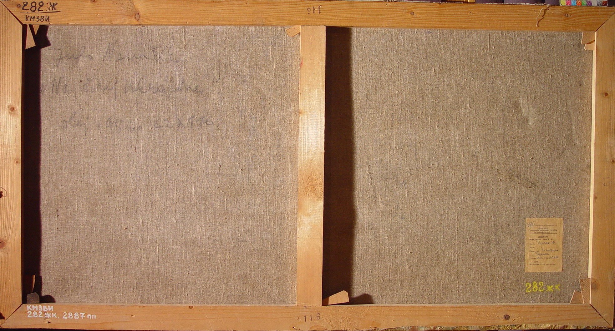 Задовільний. Підрамок авторський,придатний. Окрайки полотна обрізані. Локальні деформації полотна. Зв"язок грунту з основою задовільний. На фарбовому шарі підписи. Пилові забруднення з обох боків. Живопис по н. кр. використаний автором як окрайок. Потребує підготовки до експонування.,