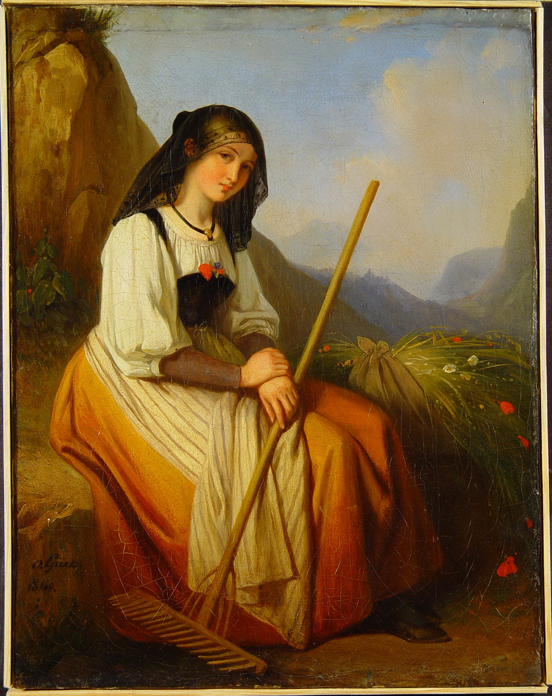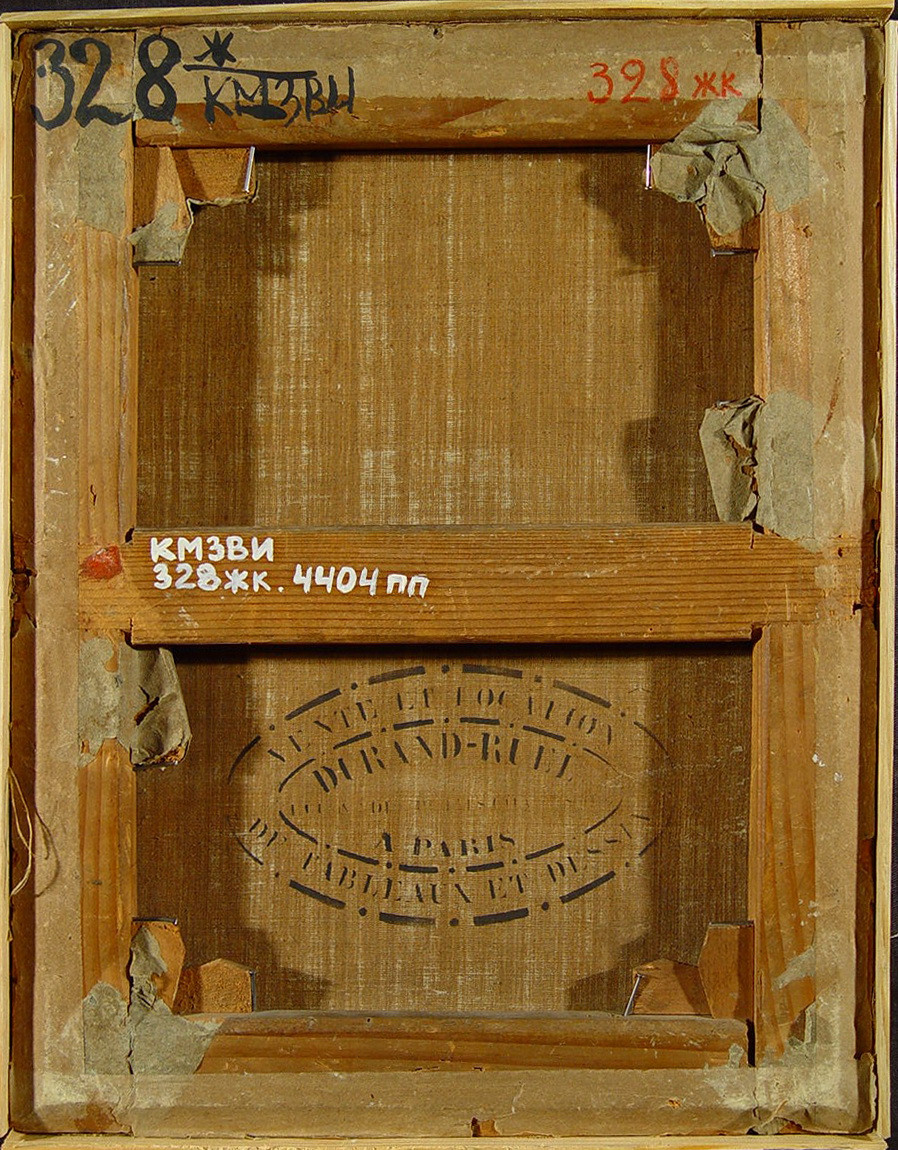 Повсюдний мілко- та середньосітчастий кракелюр. В верхньому лівому куті невелика тонована втрата фарбового шару. Ліворуч над головою та правіше на фоні неба затоновані втрати фарбового шару з загрозою осипу.У рамі. Підрамок авторський, придатний. Реставраційні тонування змінили колір бл. 1%. Підписи. Покривний шар пізній, лаковий. Пилові забруднення з обох боків. Потребує профілактичного огляду.,