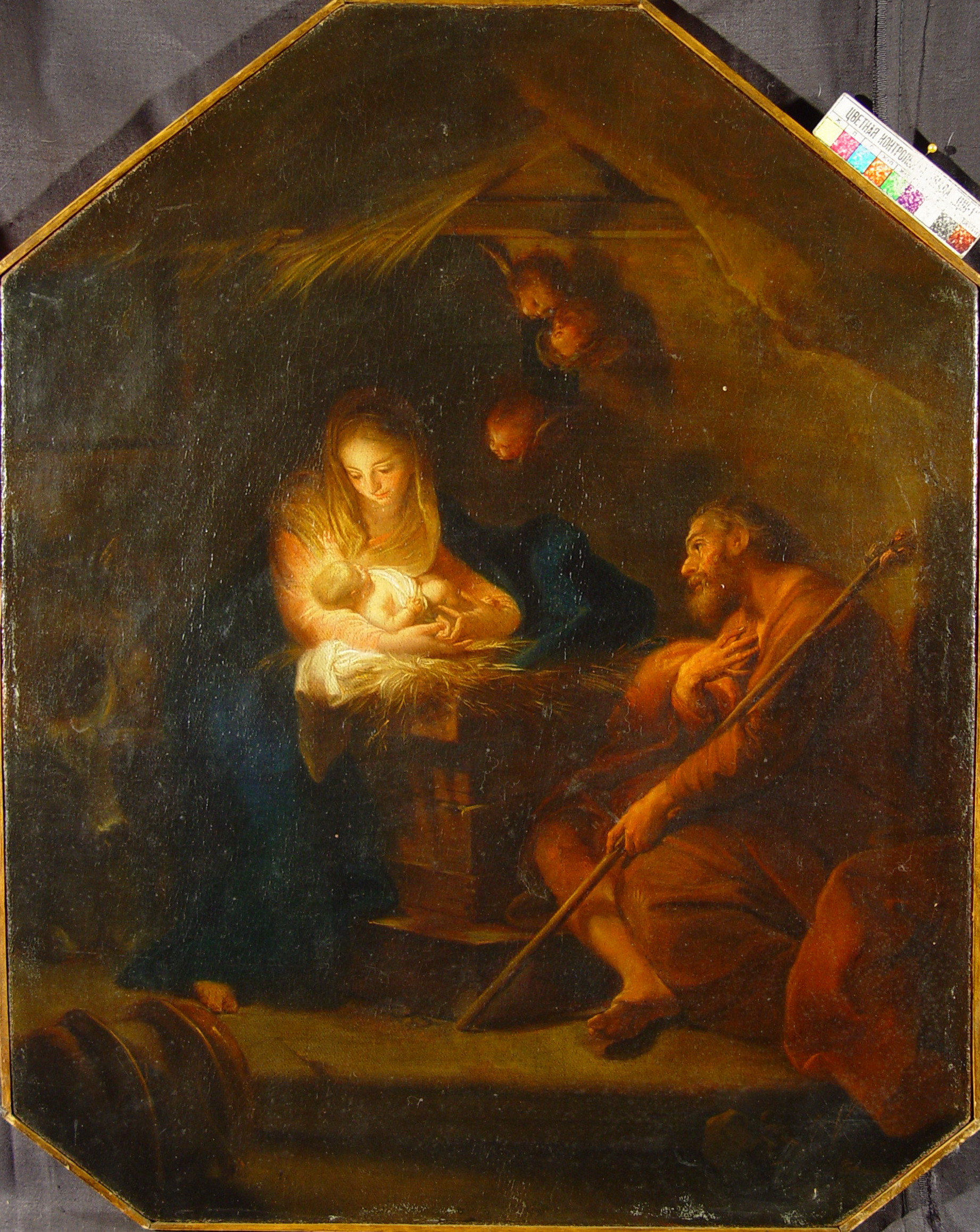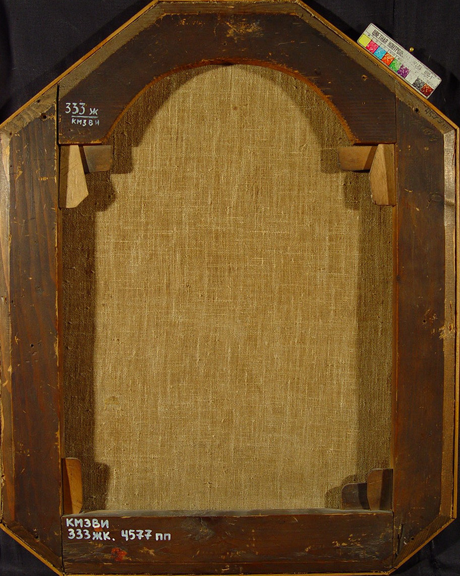 Сліди старої реставрації. Плями, потертості.Окрайки полотна обрізані. Дубляж повний. Втрати фарбового шару: осипання бл. 1%. Реставраційні тонування. Покривний шар пізній, лаковий. Підозра на наявність біодеструкторів бл. 10% (н.п.ч.). Потребує підготовки до експонування.,