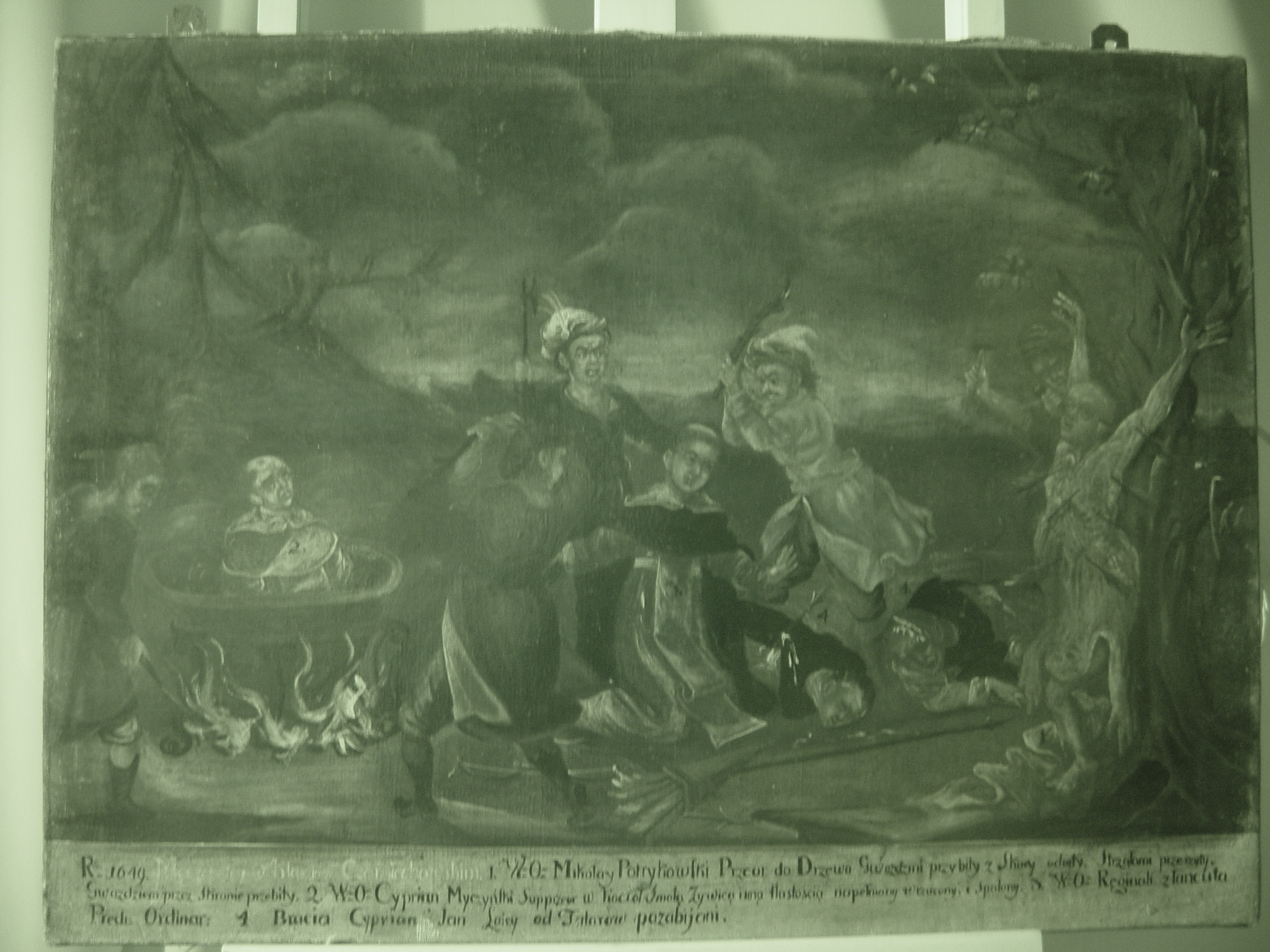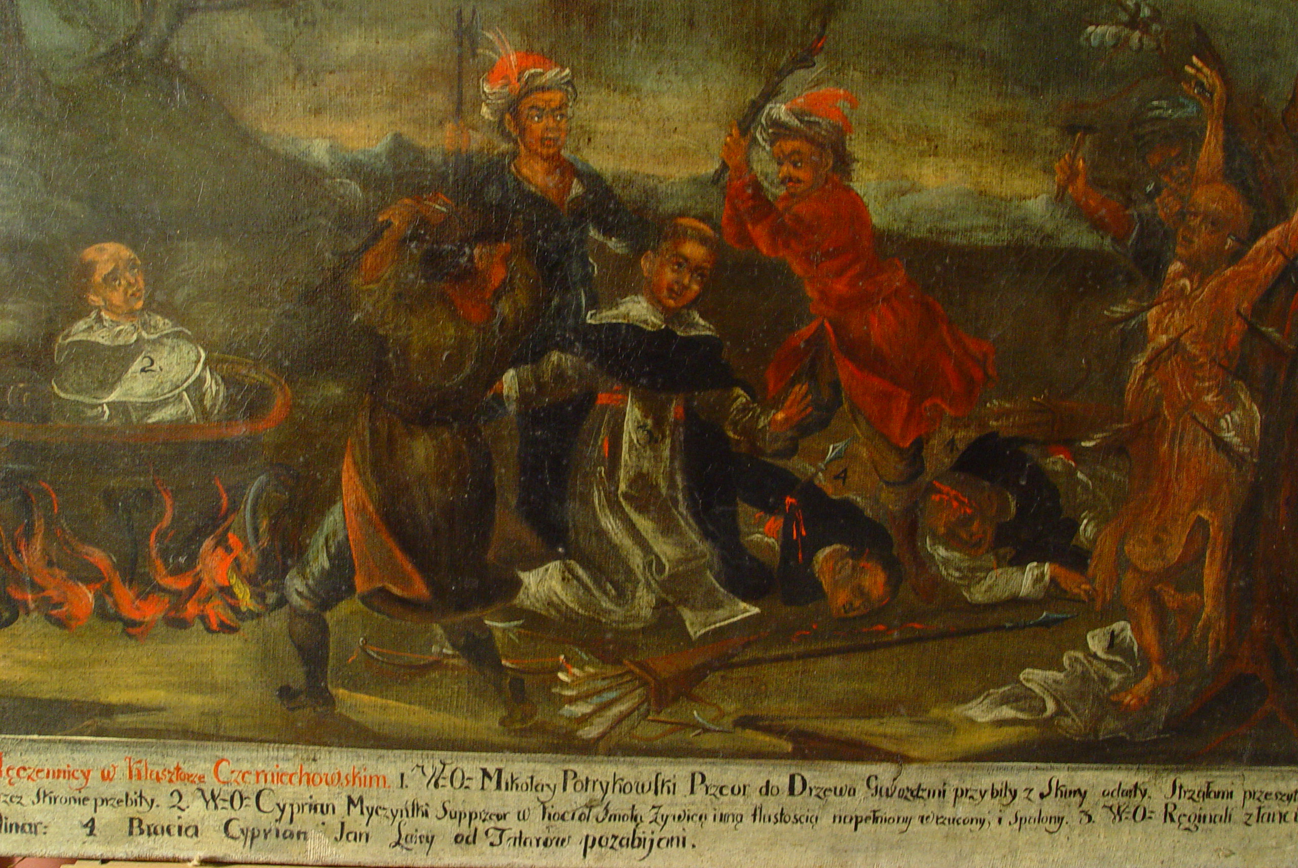 Закладка “Атрибуція” - Змiн. назва: Сцени катування мучеників (Мученики у Черміховському монастирі ?)/Змiн.опис: Композиція багатофігурна. На тлі пейзажу сцени катування декількох мучеників. У лівій частині – мученик у церковному вбранні (Киприян Мичинський ?), вміщений у чан, що стоїть на багатті. У центрі – троє людей з палицями, які нападають на коліноуклінного мученика у білому вбранні та чорному плащі священика. Праворуч від них, на землі, – двоє закатованих. У правій частині – мученик, прикутий до дерева та пронизаний стрілами. Поряд з фігурами мучеників – цифри від 1 до 4, проставлені чорною фарбою