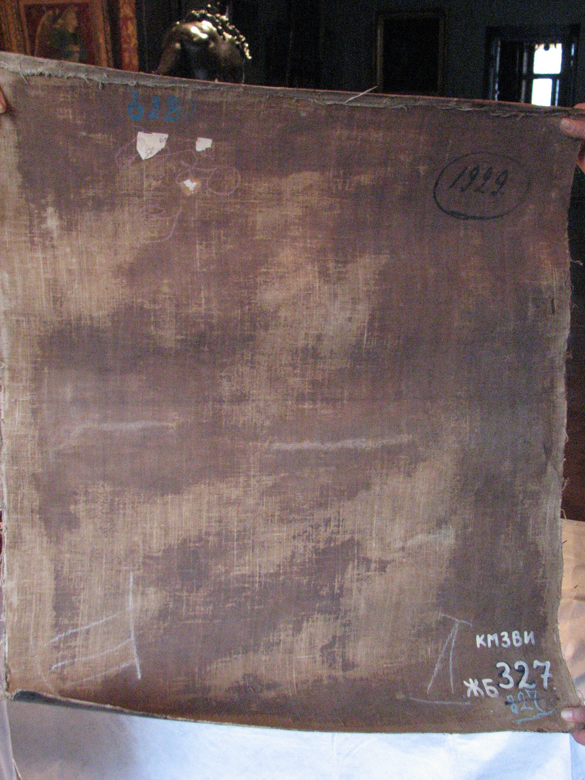 Інвентар 1948р.: без підрамника, дубльована. У середній частині зламана. Вздовж зламу і по краях ...(опис стану збереженості не завершено),