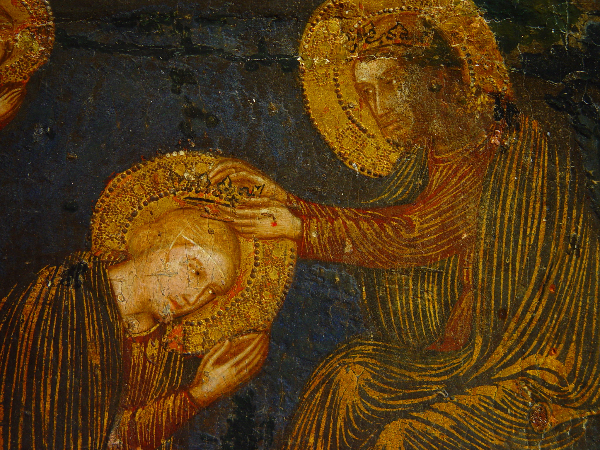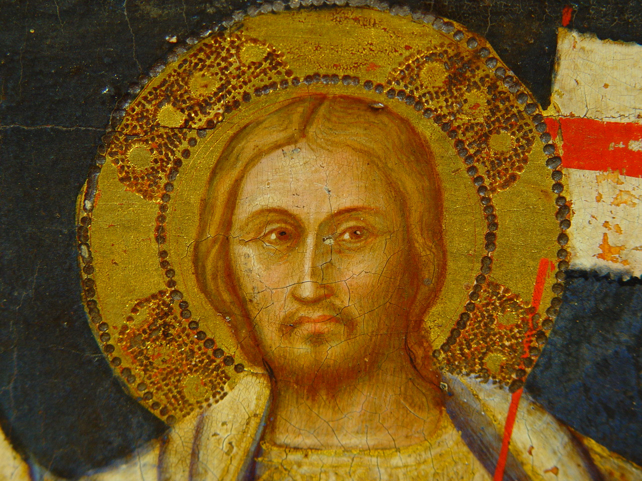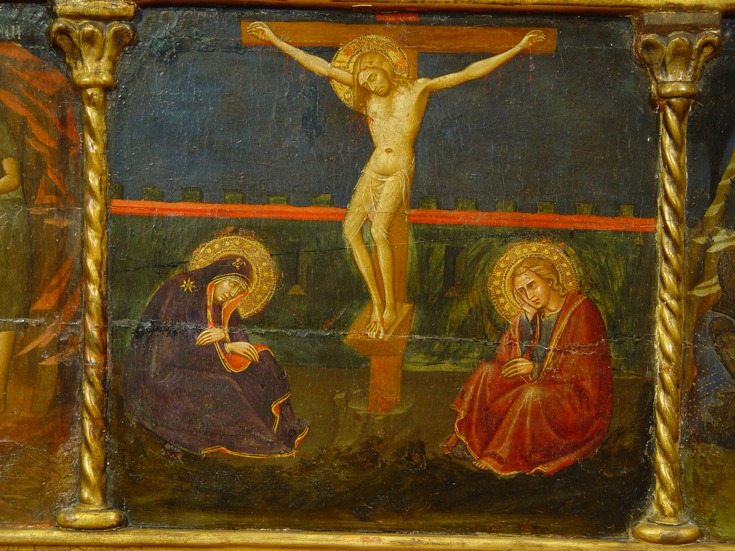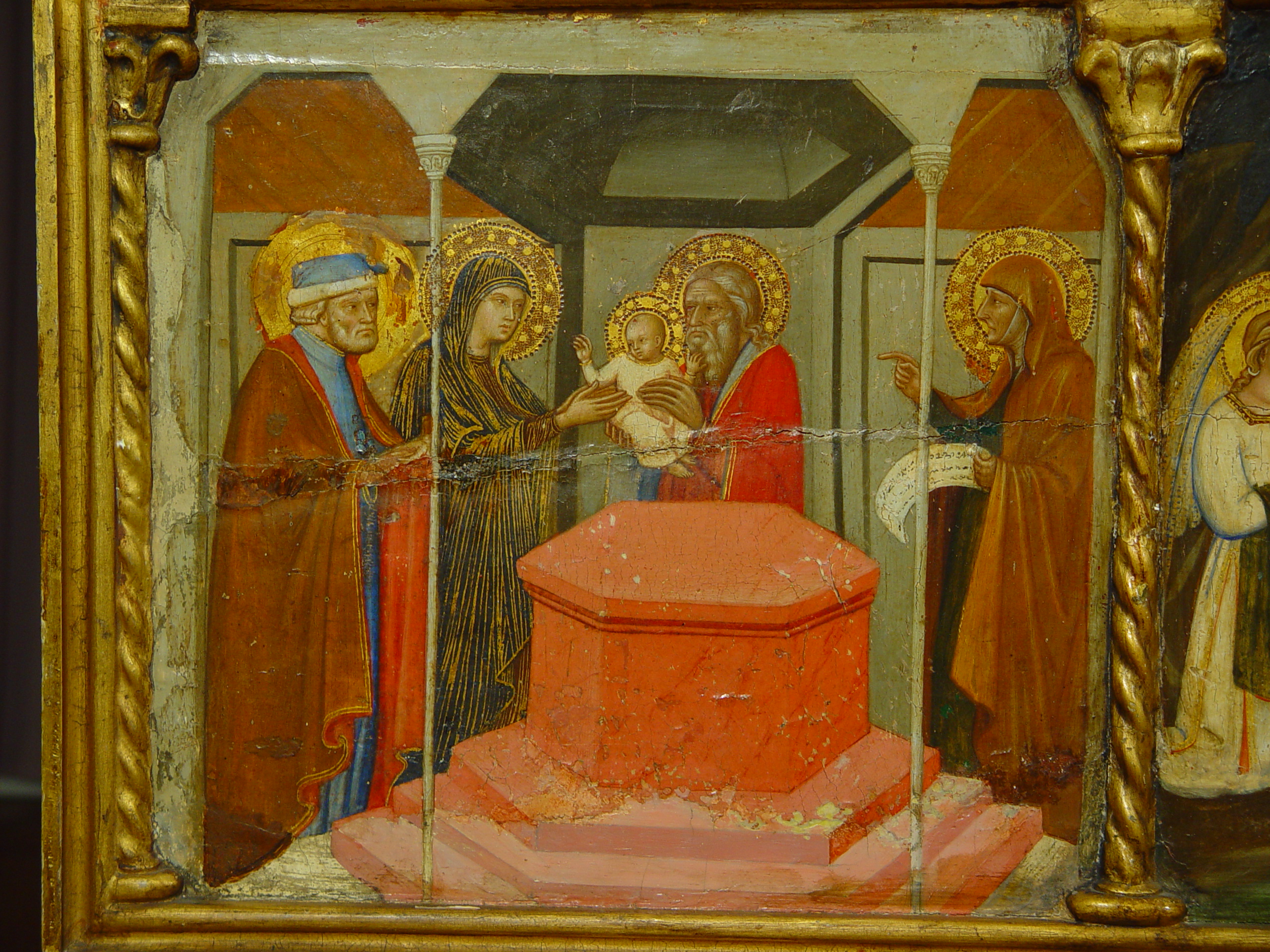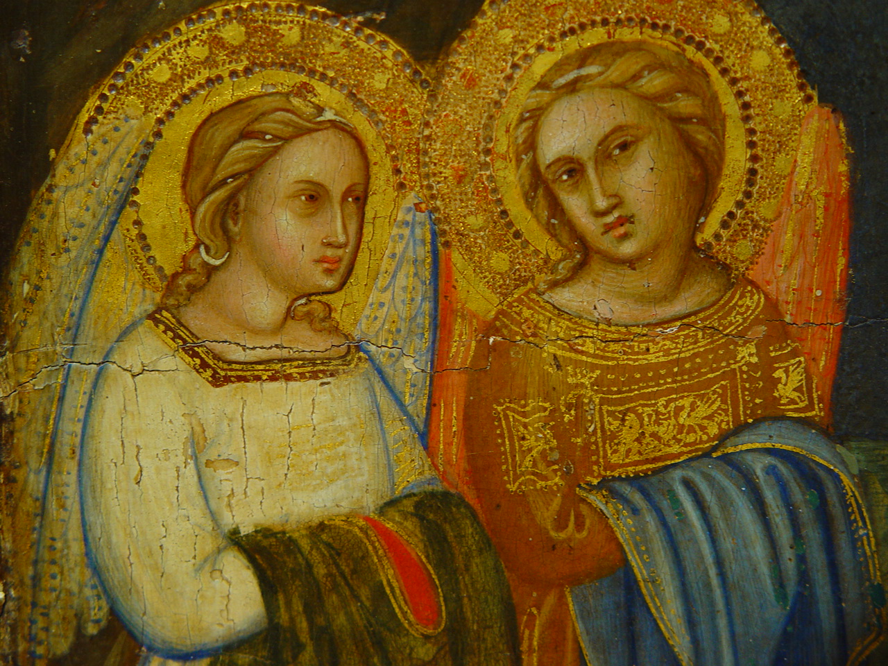 Шелушіння фарбового шару у 2,3 та 4 клейма, бугрування левкасу у правому клеймі ліворуч. Пожухлість на місцях заправок.,