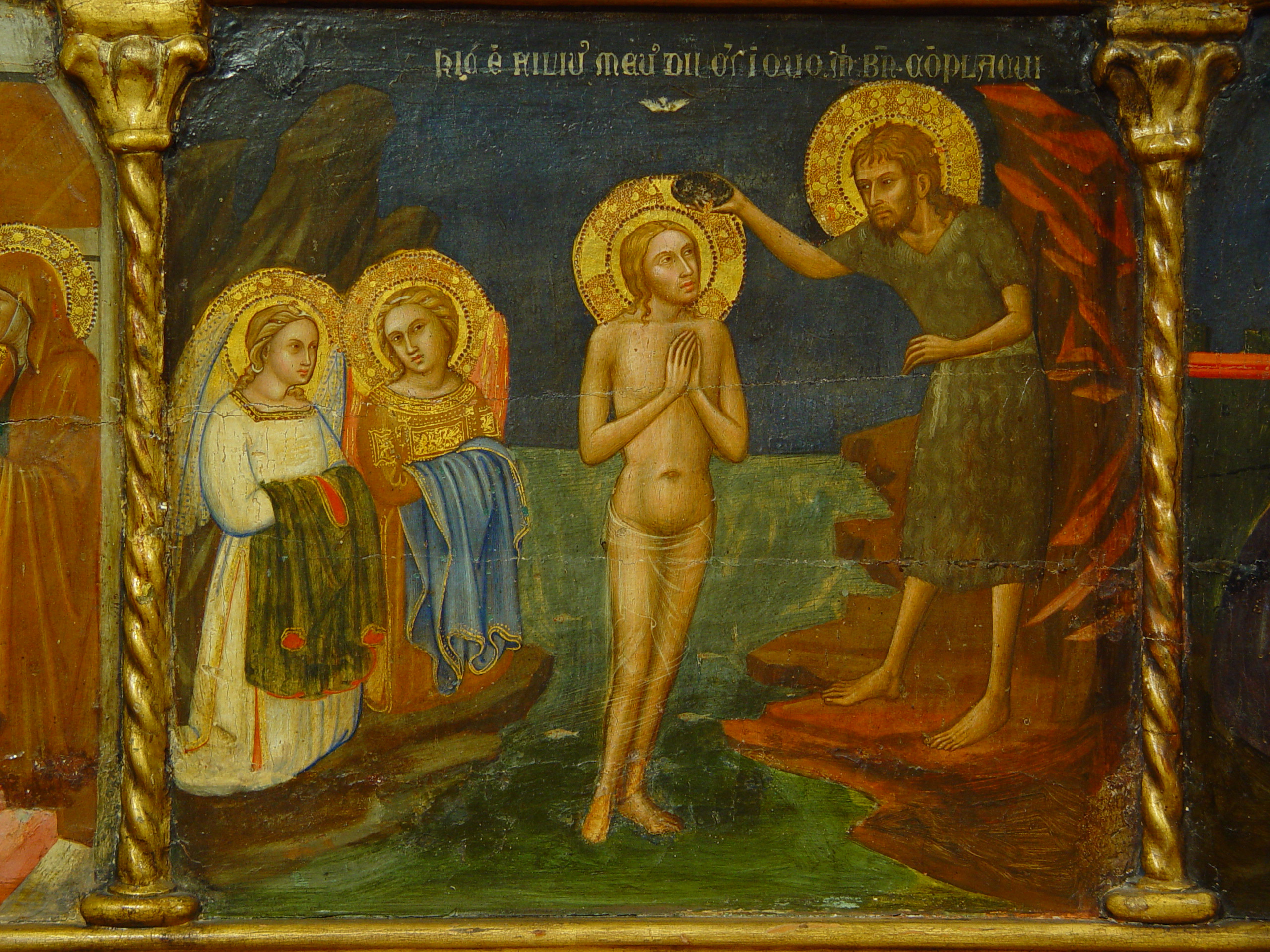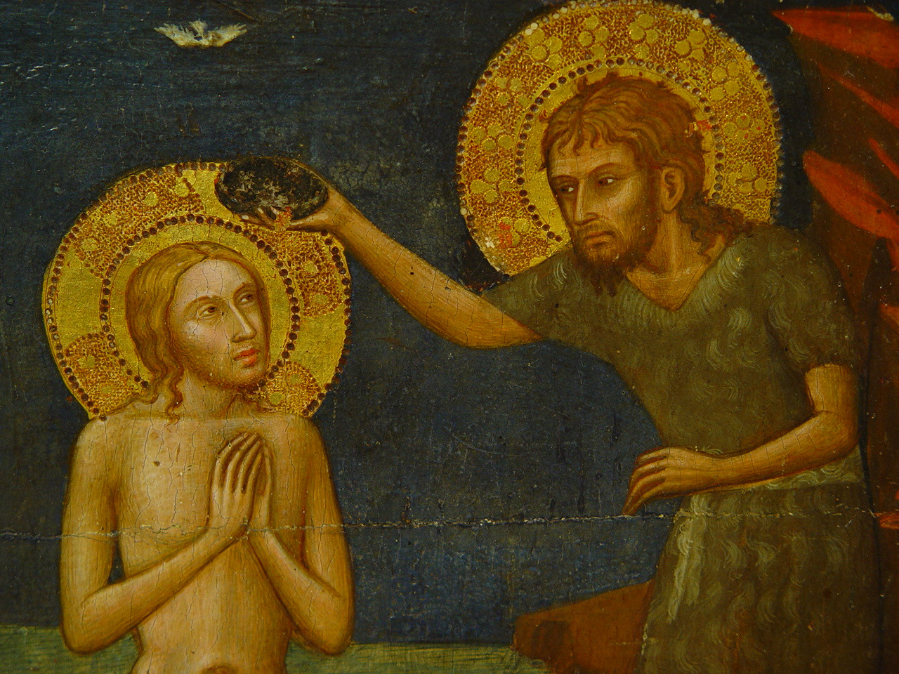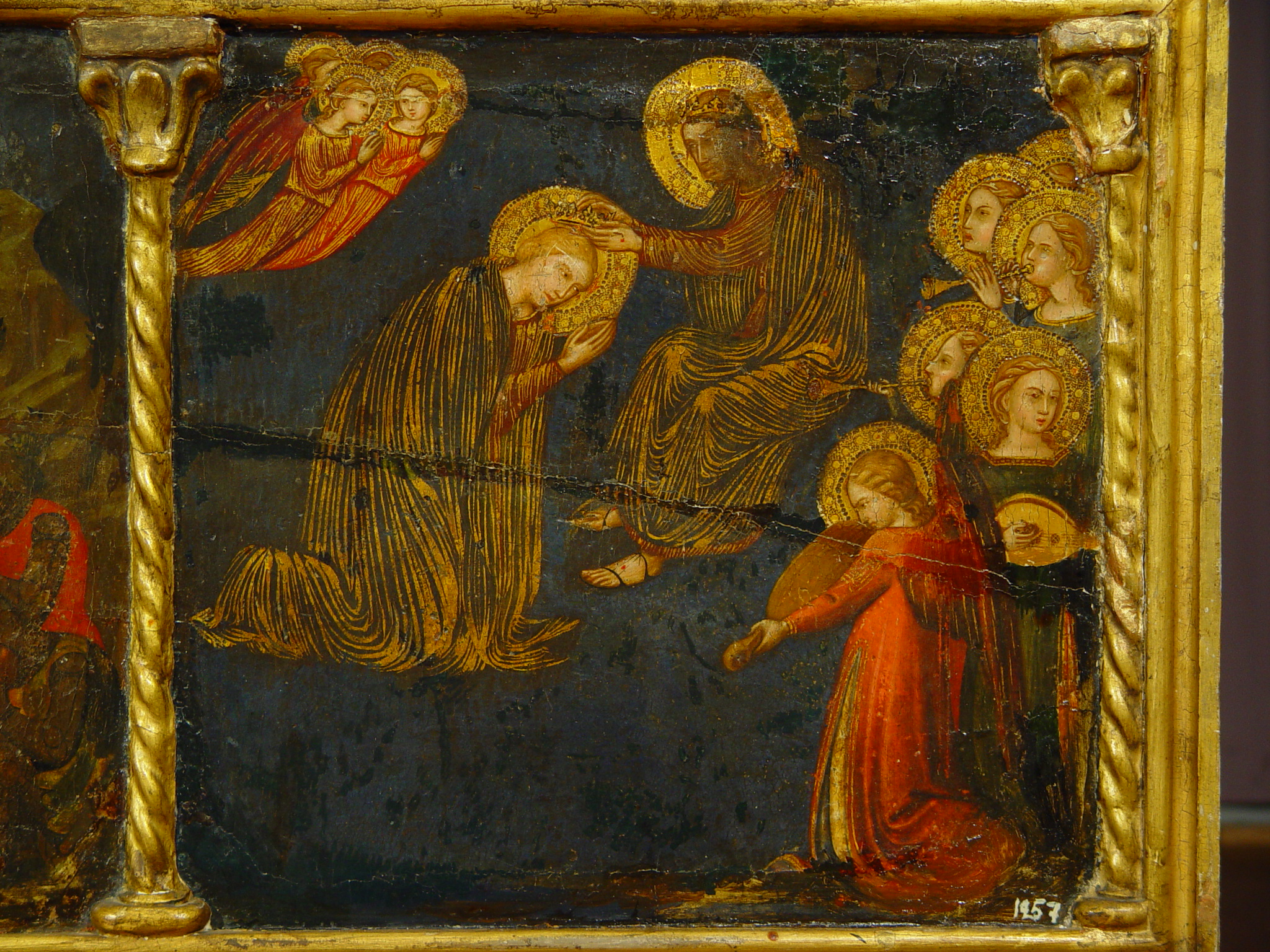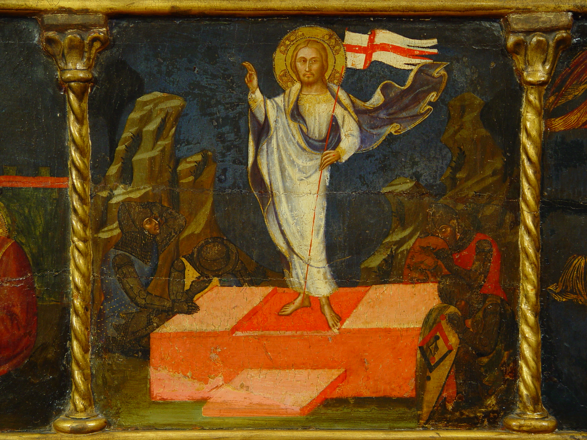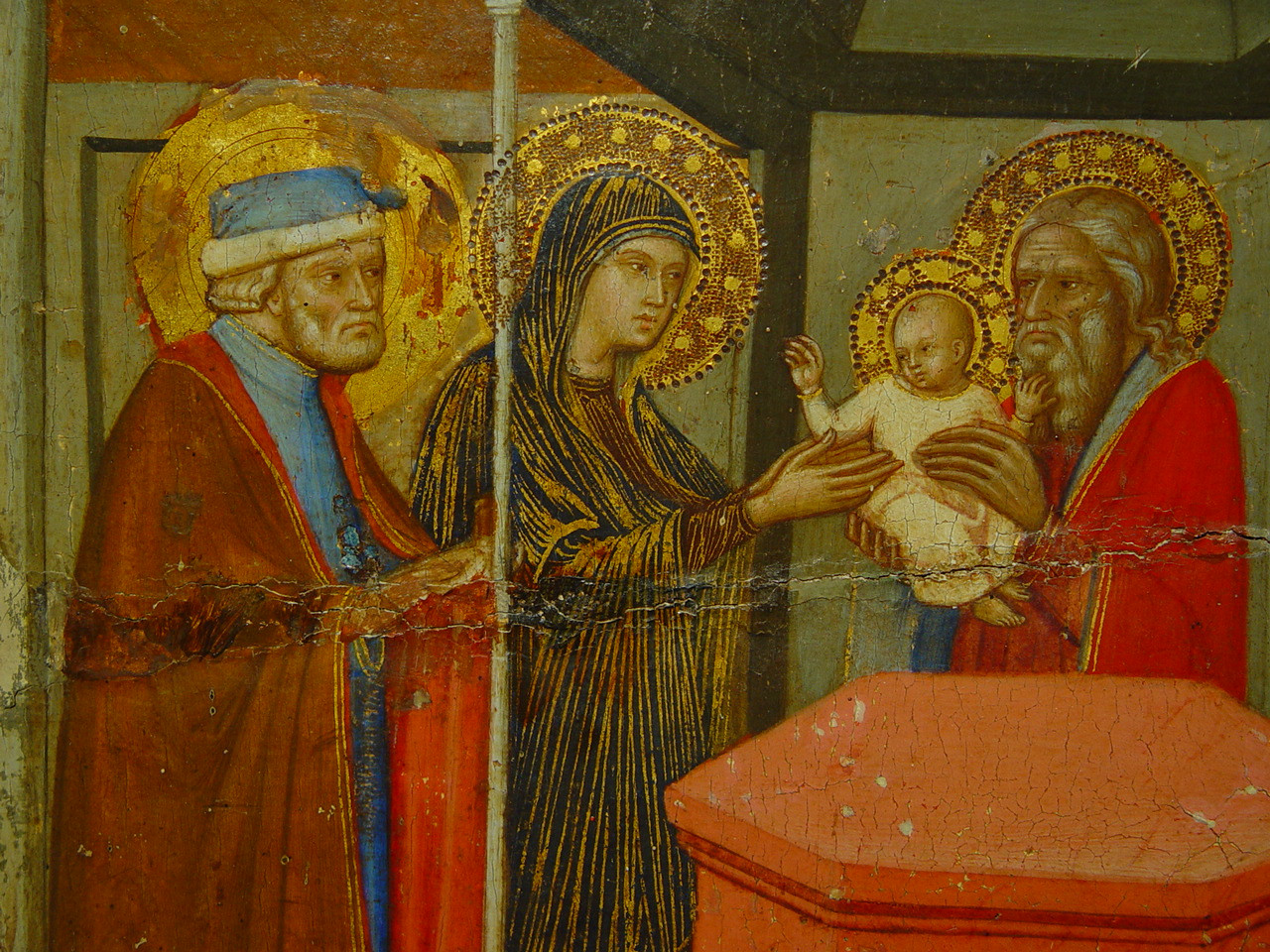 Шелушіння фарбового шару у 2,3 та 4 клейма, бугрування левкасу у правому клеймі ліворуч. Пожухлість на місцях заправок.,