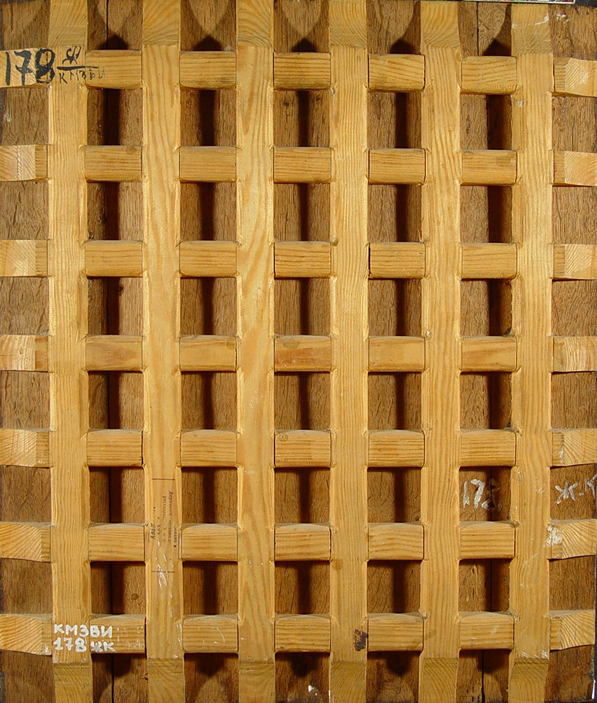 Дошка вигнута, права частина відламана, а на лівій намічується велика тріщина. Сильні потертості, глибокі подряпини по лаку.Три тріщини на дереві, шириною 0-0,2 см., загальною довжиною 150 см. Втрати фарбового шару: помитості 50%. Реставраційні тонування змінили тон і колір на 5%. Покривний шар пізній, лаковий. Пилові забруднення з обох боків. Дані про реставрації: паспорт №2304 ДНДРЦ. Потребує підготовки до експонування.,
