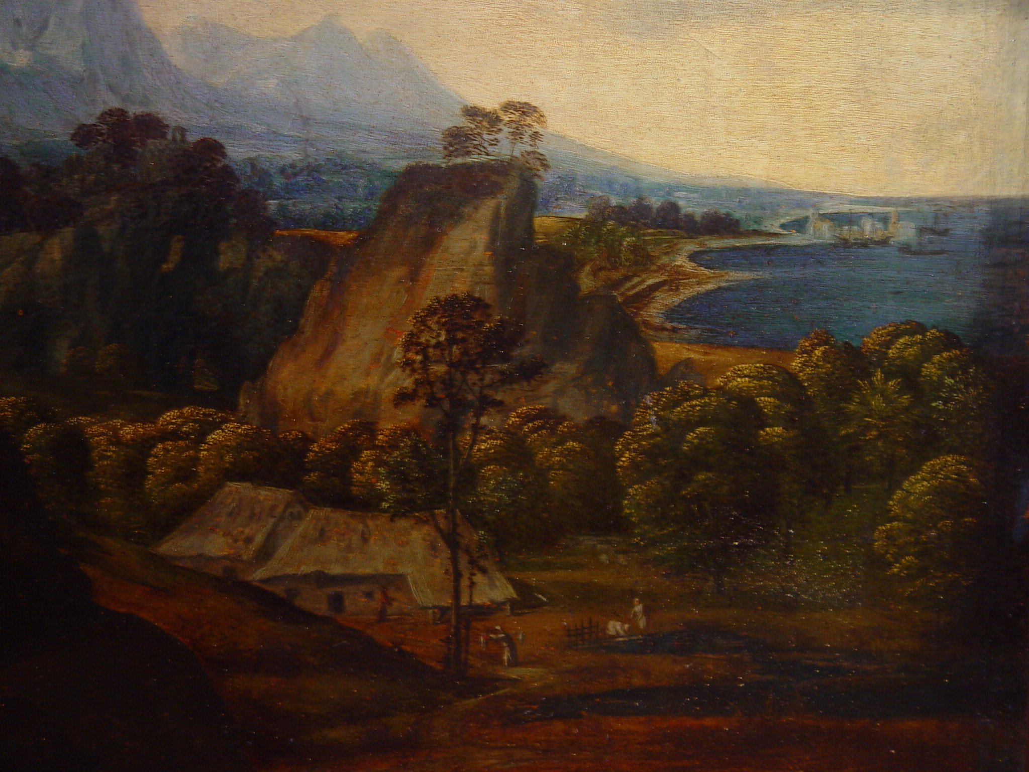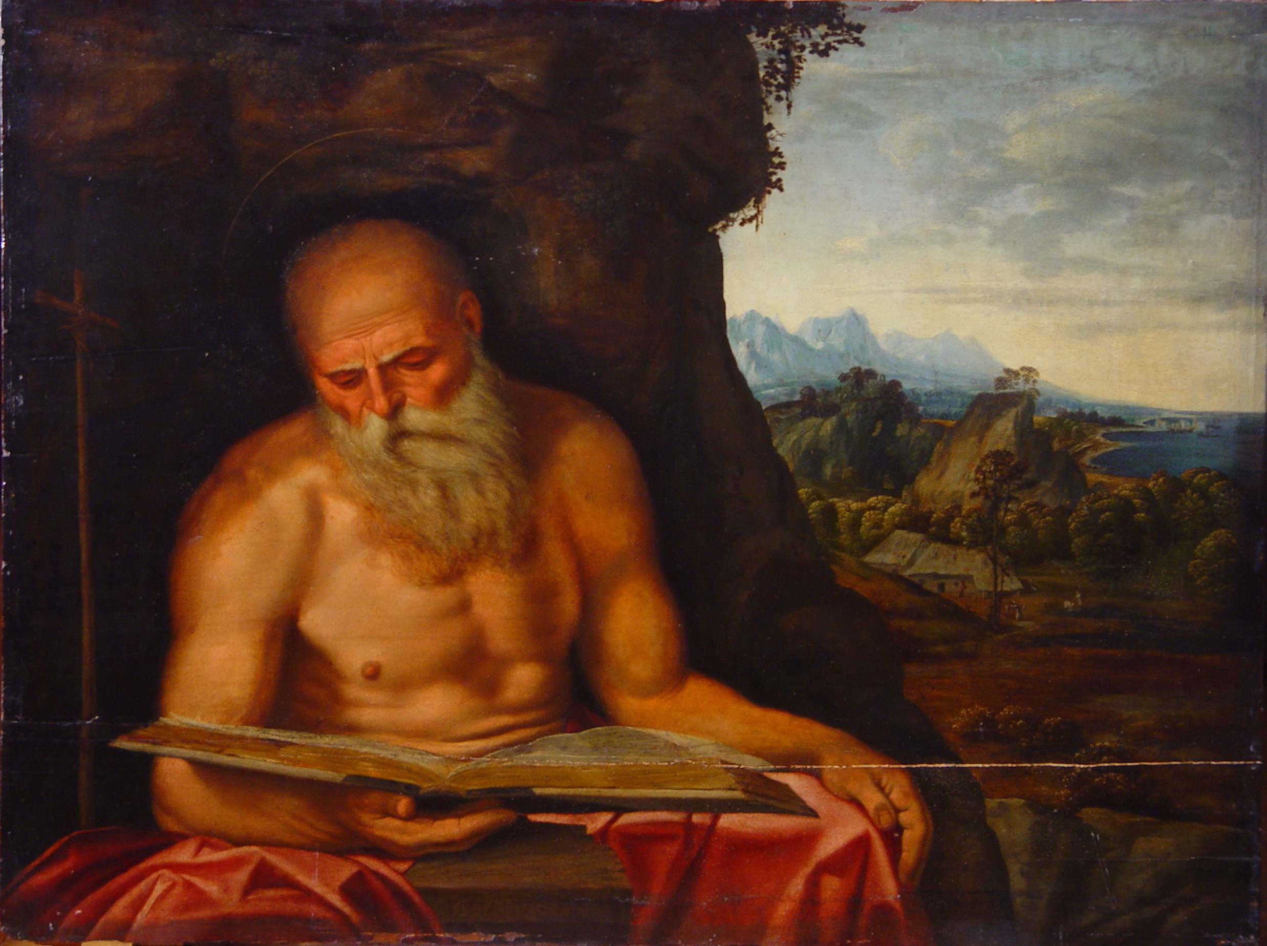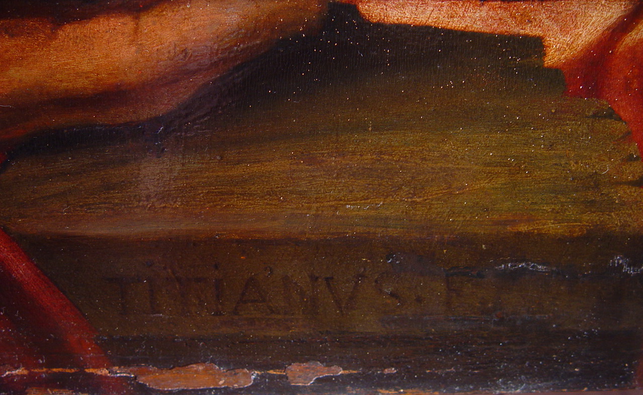 Задовільний. На дошці невеликі тріщини.Дерево потоншене. Одна тріщина, горизонтальна, шириною 0,1- 0,3 см., довжиною 75 см., (н. част.). Трухлявість бл. 30%. Паркетаж. Зв"язок грунту з основою задовільний. Втрати бл. 3%, по краях. Зв"язок фарбового шару з грунтом задовільний. Реставраційні тонування із засягненням на авторський живопис змінили тон і колір на 10%, по краях. Підписи: TITIANUS. F (н. кр. ліворуч), фальшиві. Покривний шар пізній, лаковий. Пилові забруднення з обох боків. Розрив основи внаслідок паркетування. Потребує підготовки до експонування.,