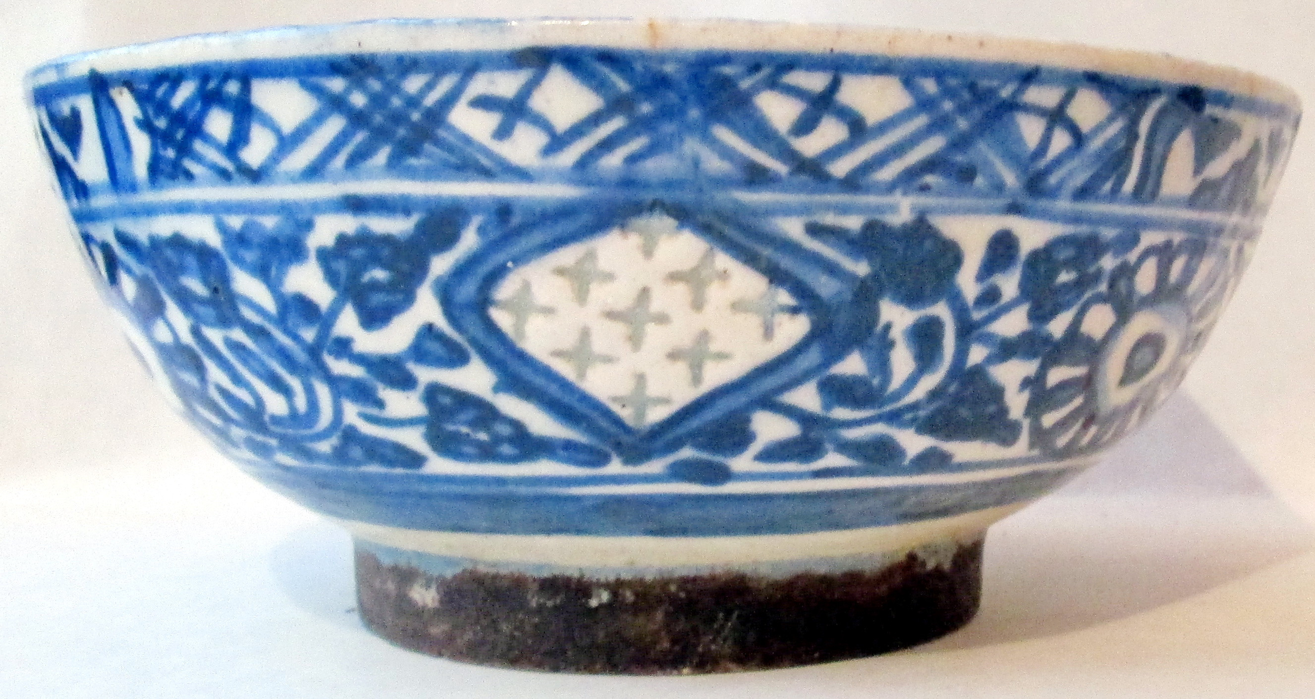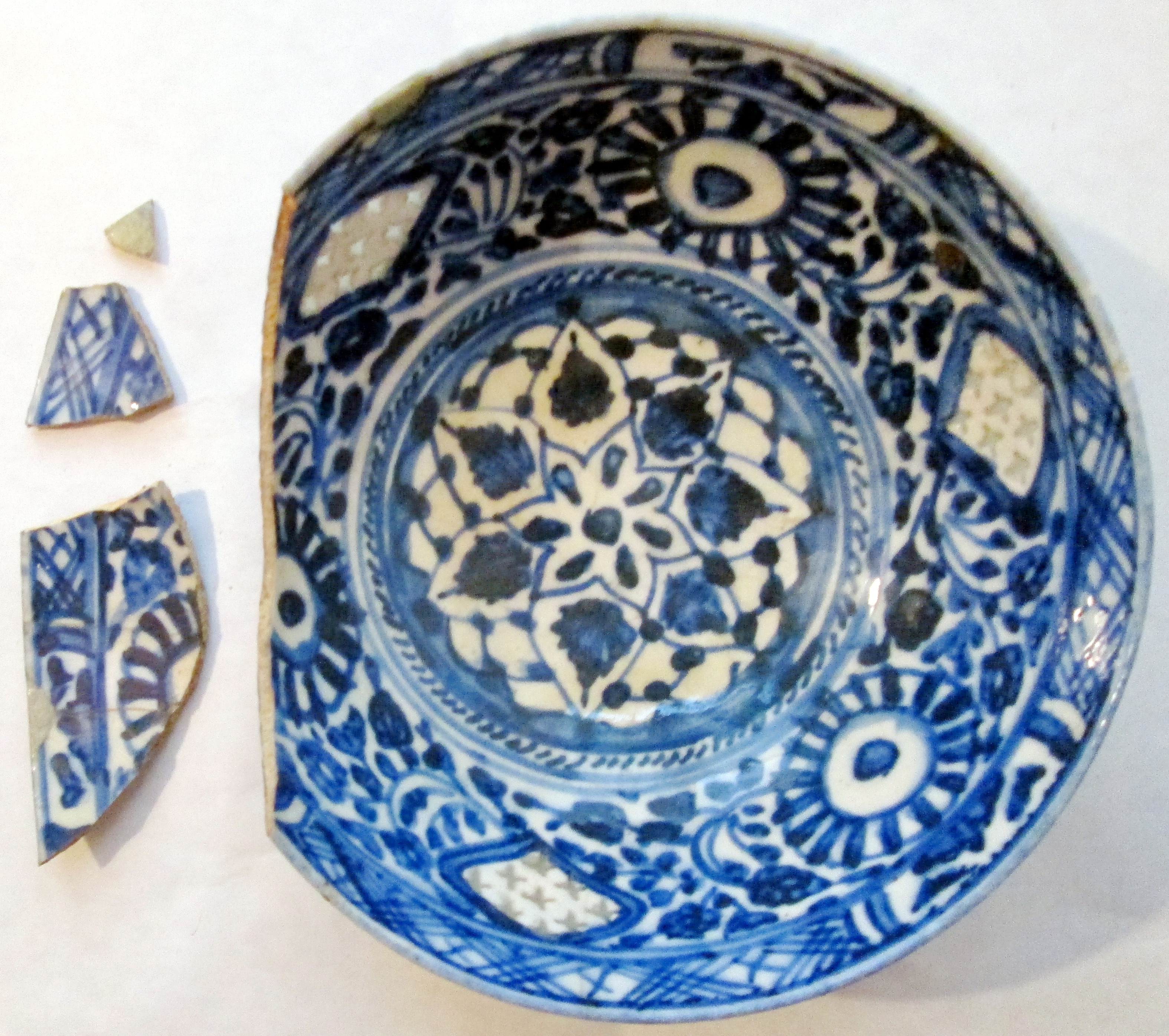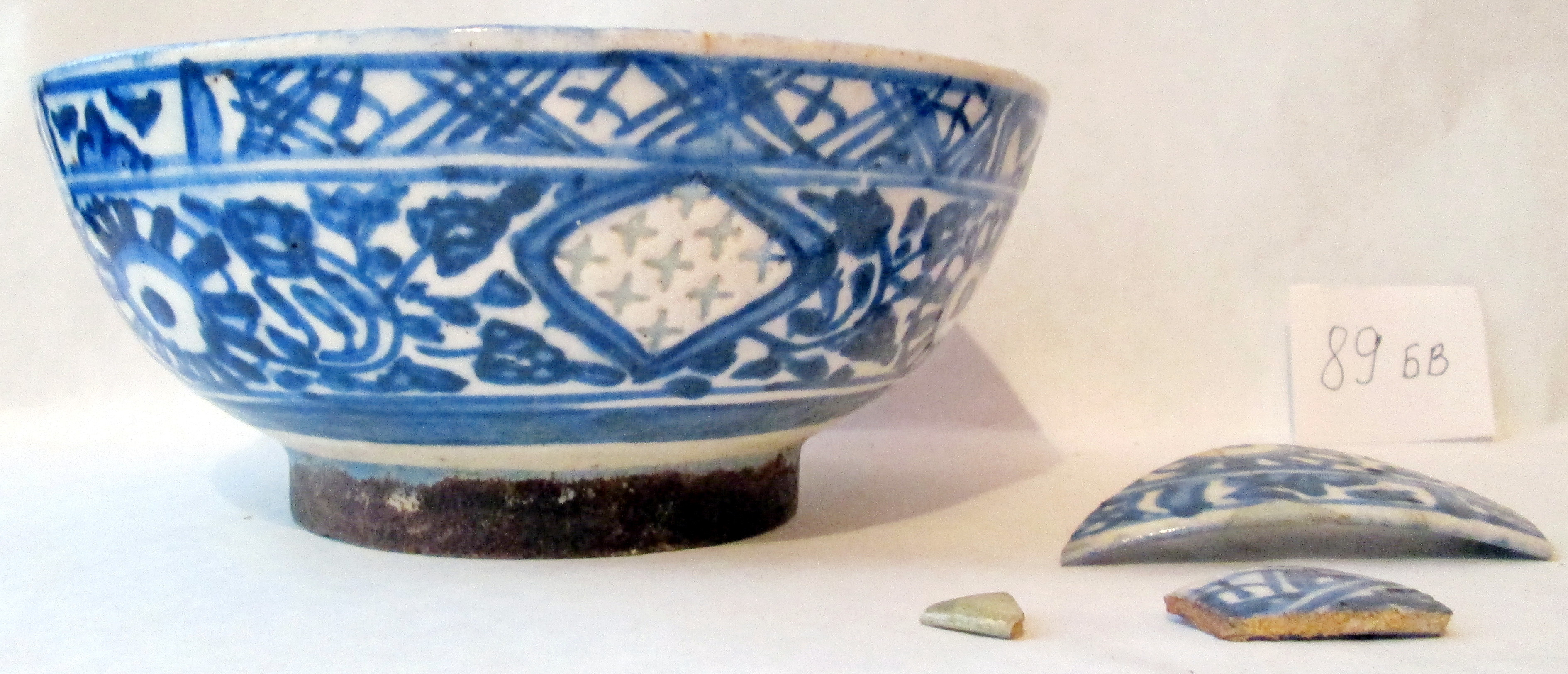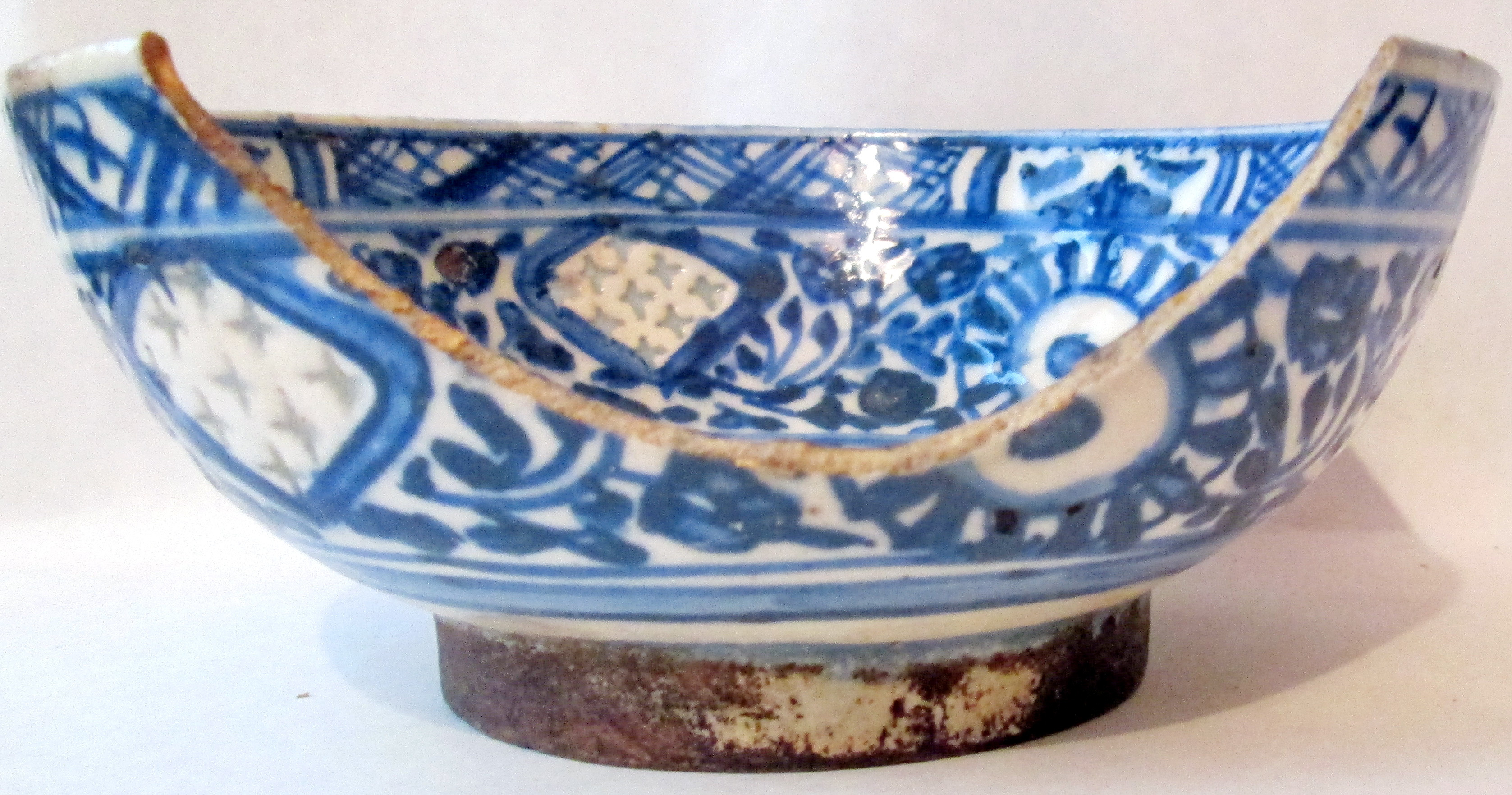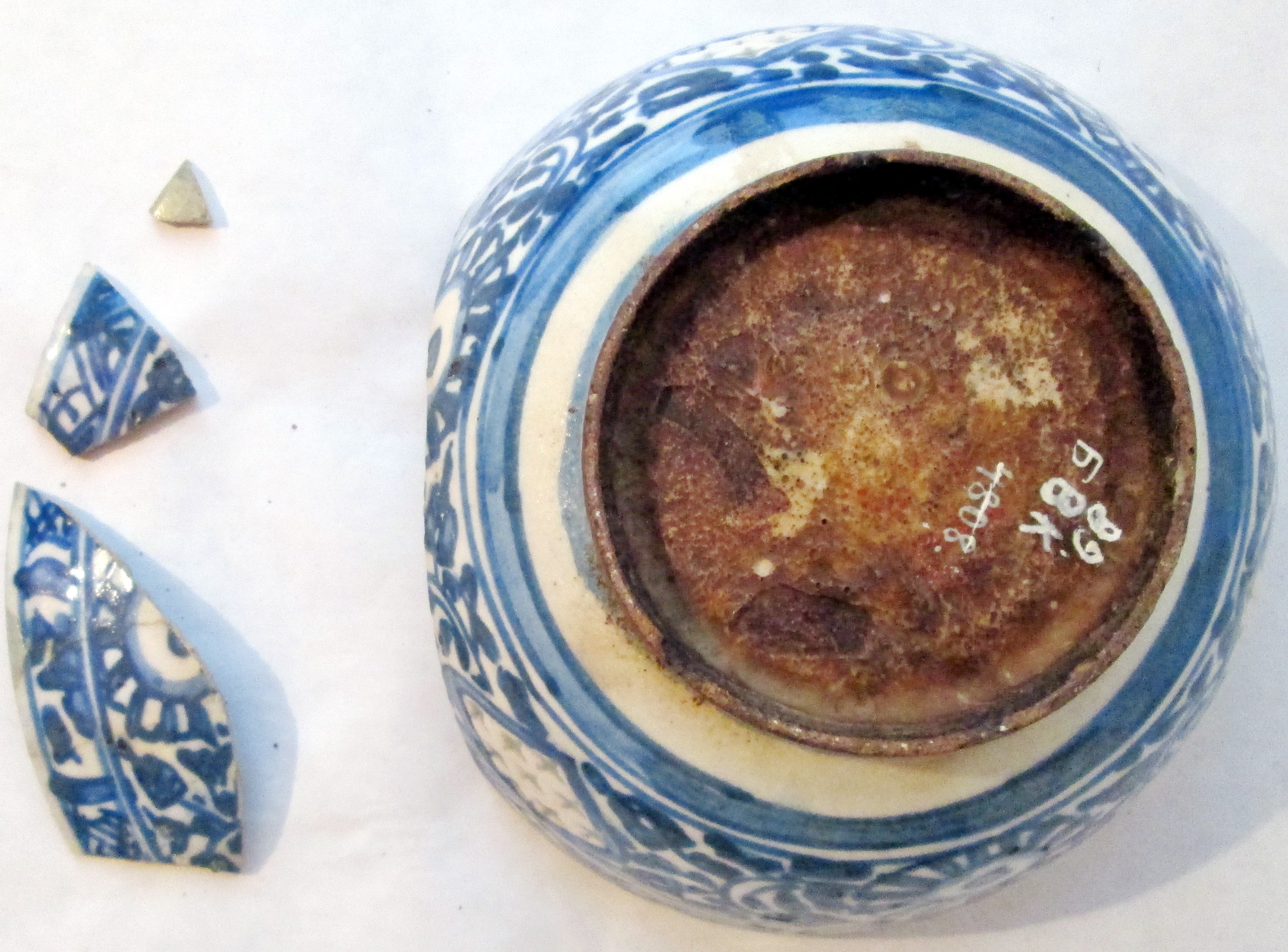 Частина стінки розбита на кілька шматків та склеєна. В цьому місці жовті плями.,