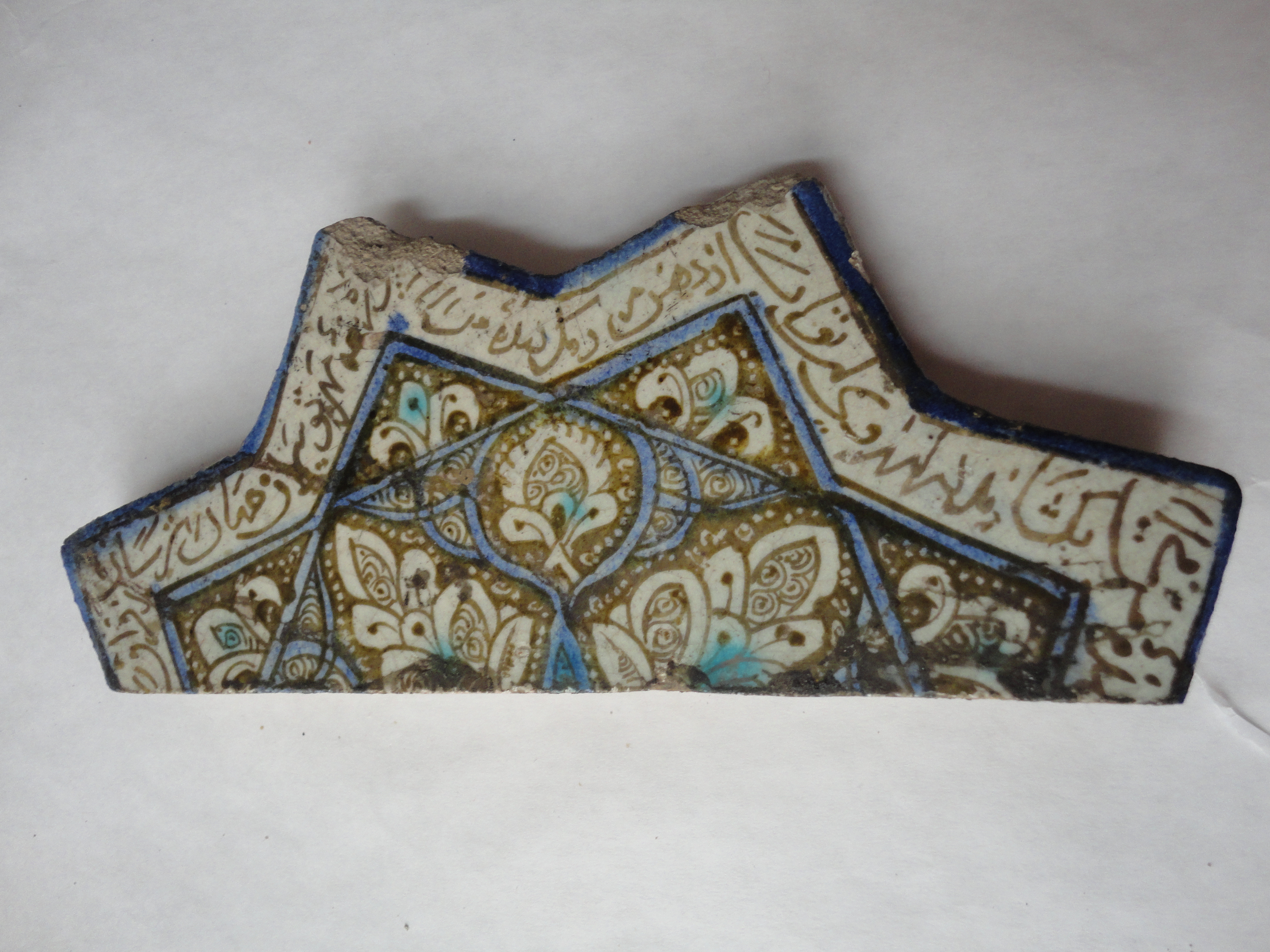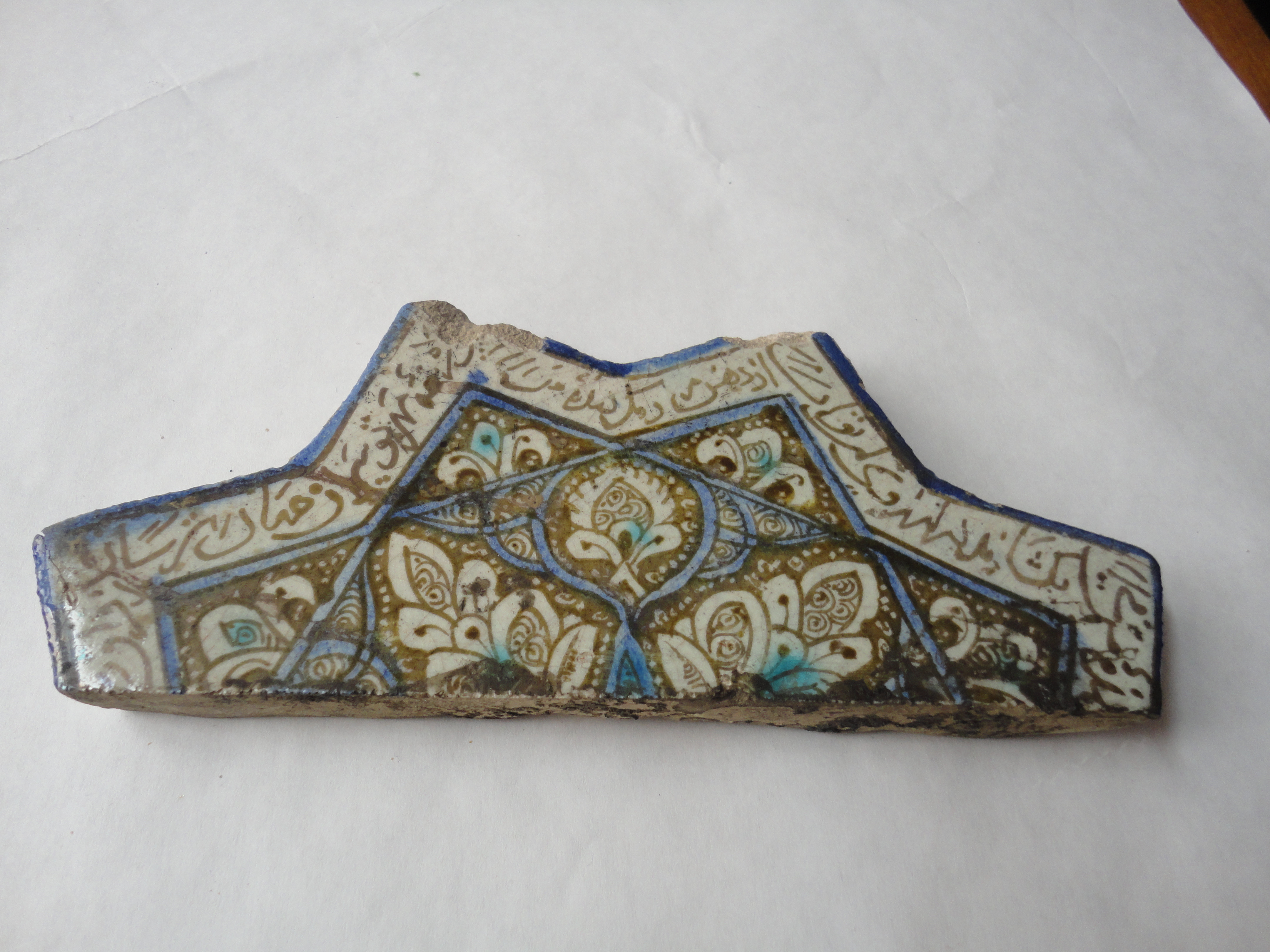 Закладка “Атрибуція” - Наим. предмета, издания: Кахель (фрагмент)/Змiн.додаток до назва (лист, ...): Кахель (фрагмент) люстрований з Мавзолею Пір-Гусейна в Азербайджані (1283-1284 рр.)/Змiн.опис: Фрагмент являє собою половину кахляної плитки, що мала форму восьмикутної зірки. В центрі зірки, вторуючи її обрисам, зображено восьмикутний медальйон, розписаний рослинними та геометричними мотивами брунатним люстром à réserve, окремі елементи виділено синьою та бірюзовою глазурями. Основні елементи розпису – пишне листя та пальмети, заповнені тонким візерунком у вигляді спіральок. Тло розроблене переважно низками дрібних крапок. Медальйон оточено стрічкою люстрового напису на світлому тлі поливи. Краєм зірки йде тонка смуга синього.місце створення, школа: КашанНовый материал: кашин (фаянс)Новый материал: полива олов'янаНовый материал: полива синя (сполуки кобальту)Новый материал: полива зелена (сполуки міді)Новый материал: люстрПериод: доба ІльханідівИзм. техника: формовкаИзм. техника: випалИзм. техника: поливаИзм. техника: розпис по сирій поливі (in-glaze)Изм. техника: розпис люстром