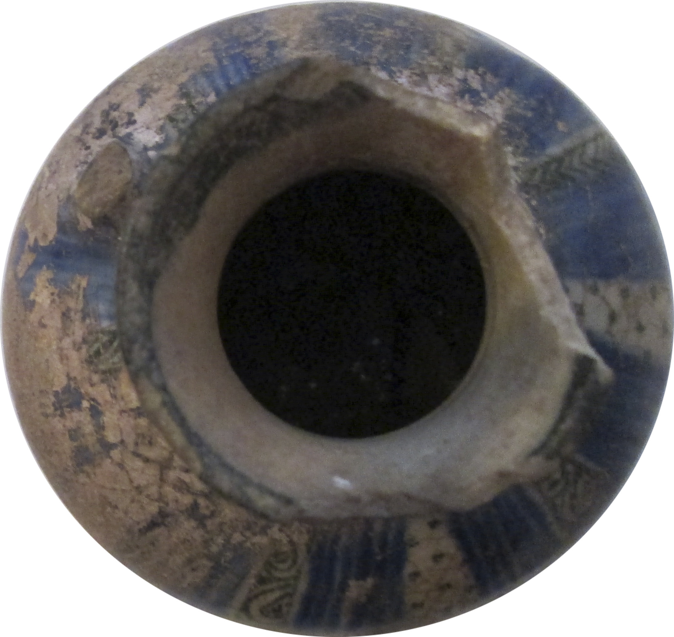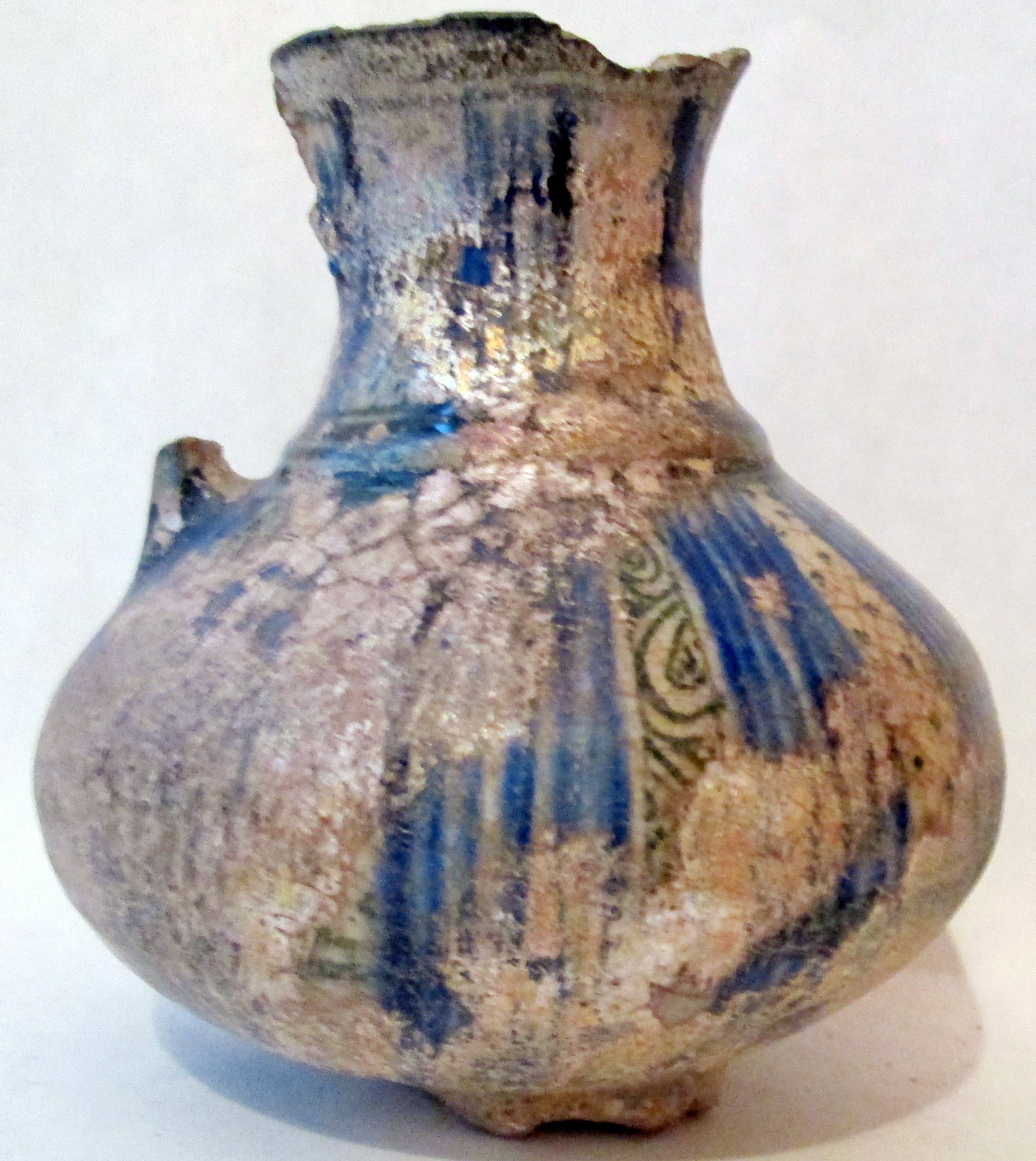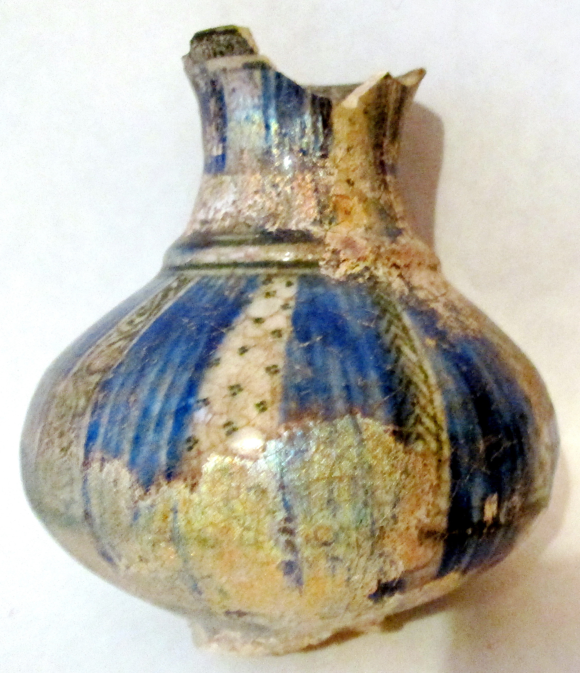 Ніжка, частина шийки та ручка відбиті. Велика частина орнаменту пошкоджена іризацією.,