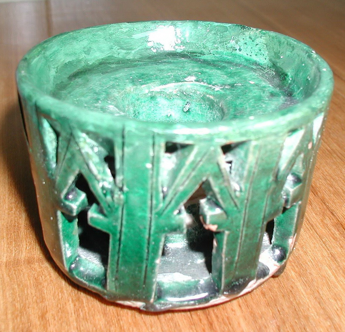 глазуровані чорнильниці зустрічаються в пластах не раніше середини 10 ст., але, можливо. з"явилися й раніше....Очевидно, вже у 10 ст. було винайдено цілком нову, набагато більш стійку форму у вигляді циліндра с двома стінками, зовнішня з яких часто була ажурною (табл. 19, 2-9)