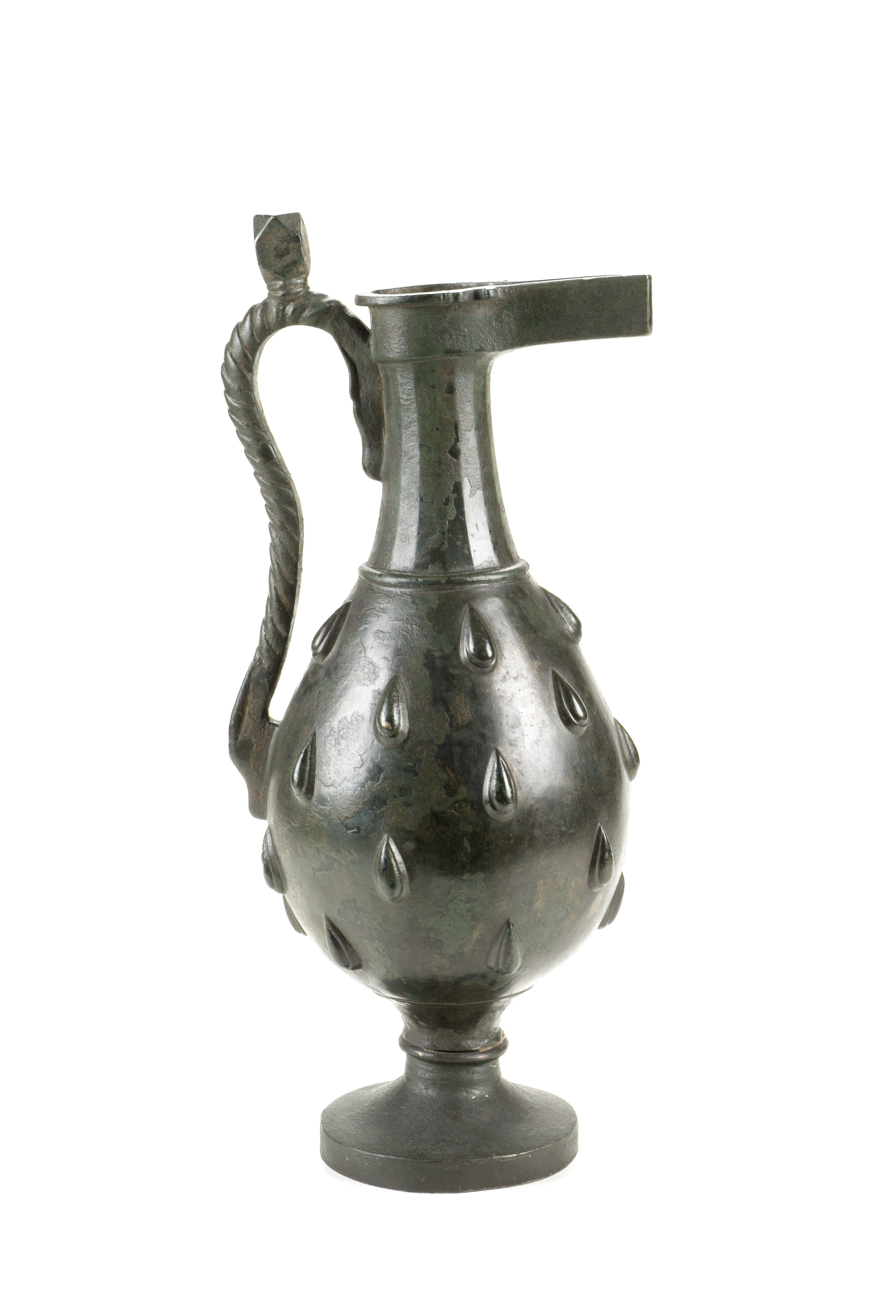 The almond-shaped bosses on the body were a favorite form of decoration on early bottles, and might have been intended not only to produce an aesthetic effect, but also to provide a better grip on the bottle. Usually, these vessels have a circular opening, which in some cases was covered with a perforated plate. This one, however, ends in a sculptural goat’s or gazelle’s head from whose mouth the liquid was poured.