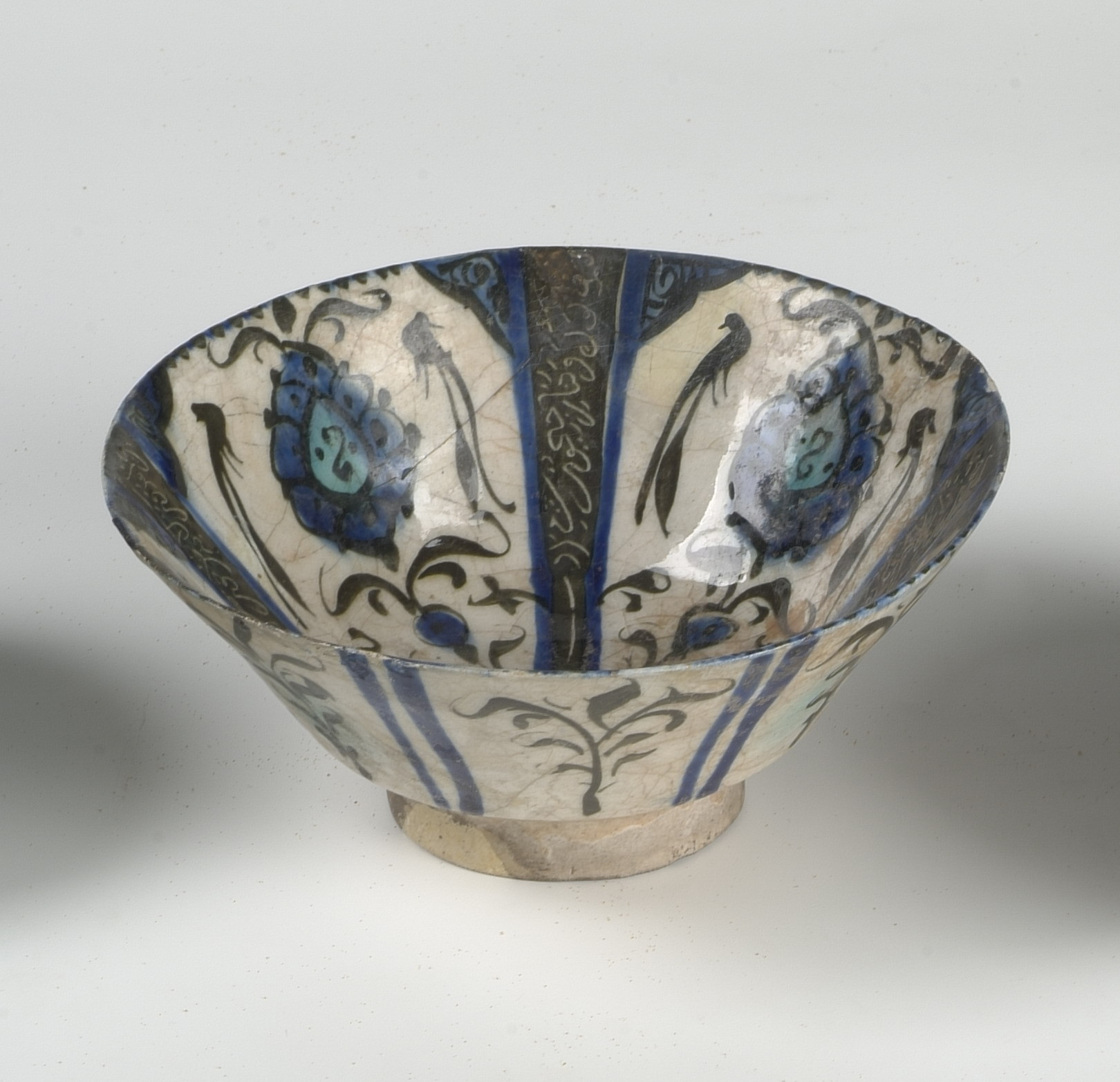 Conical bowl with "panel style" decoration. Iran, perhaps Kashan, 1200-1250. Fritware painted with underglaze blue and black manganese. H. 10.8 cm x Diam. 22.2 cm. Там само: http://67.52.109.59:8080/emuseum/view/objects/asitem/search$0040/17/title-asc/designation-asc?t:state:flow=da363d60-cef2-4f1a-87c6-35c43745194a Bowl with "panel style" decoration. Iran, perhaps Kashan, 1200-1220. Glazed fritware with underglaze painting. H. 10.2 cm x Diam. 20.3 cm