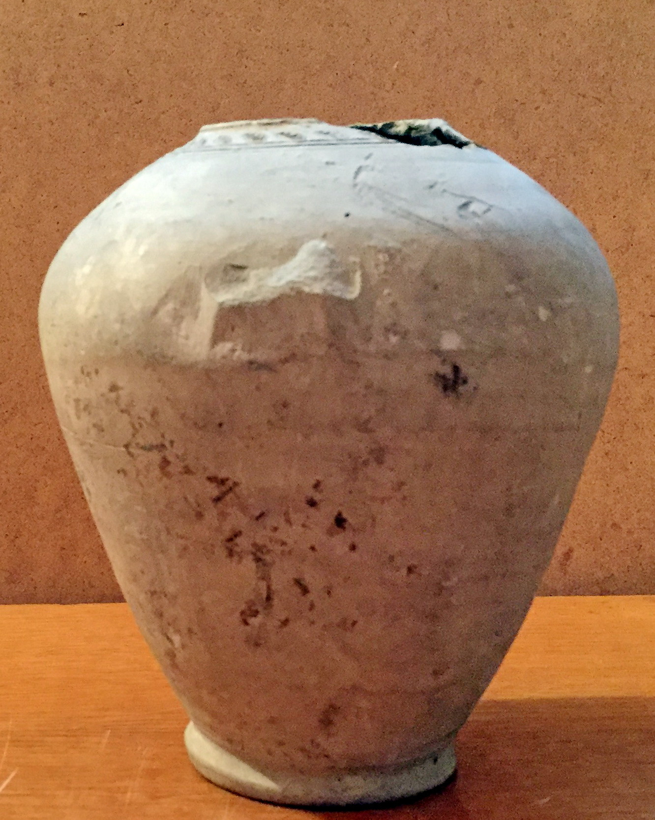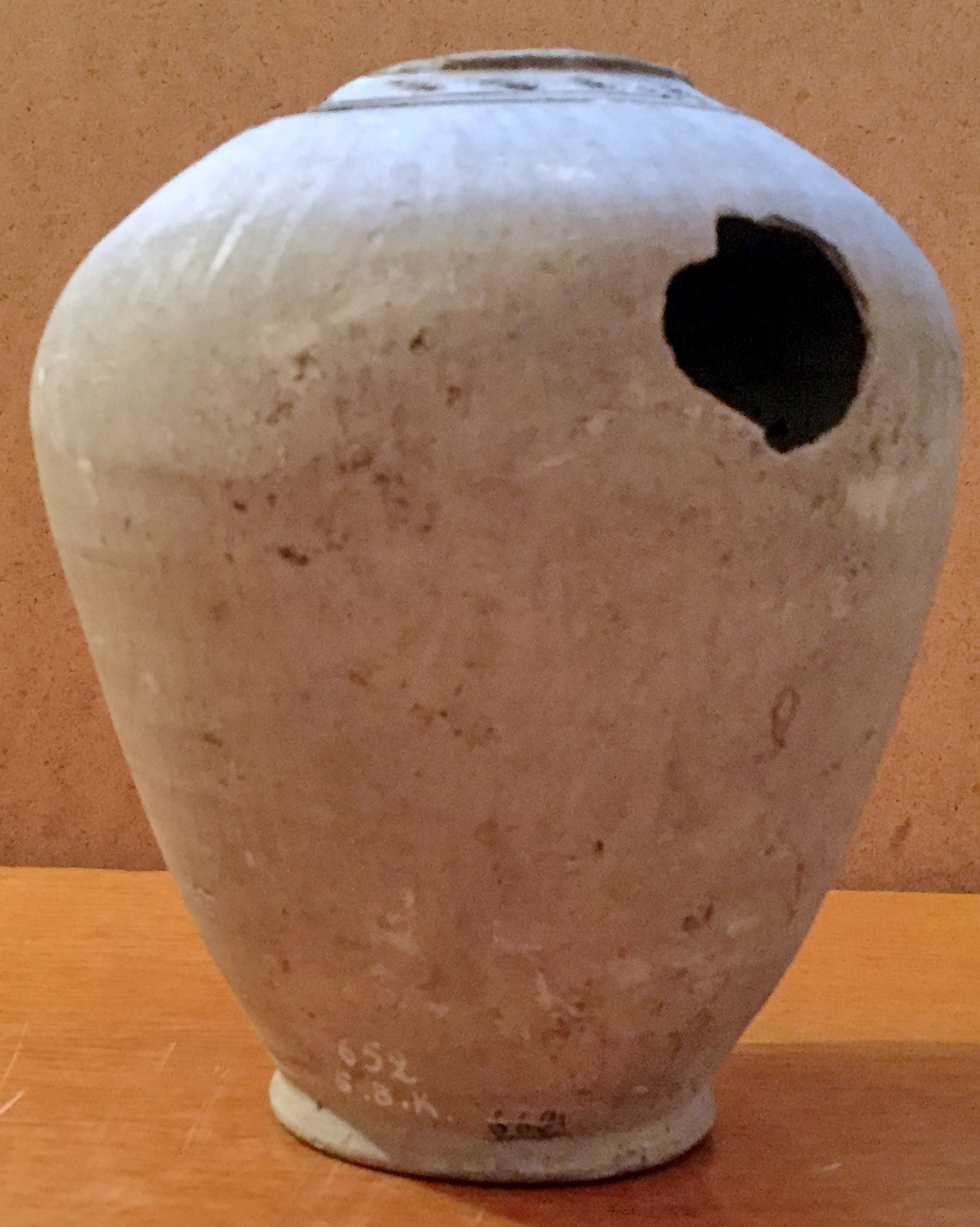 Шийка та ручка відбиті. На боці кругла пробоїна.,