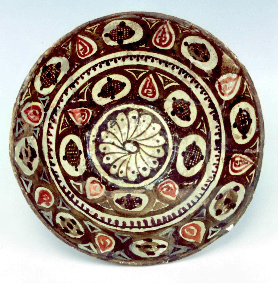 Розбита та догіпсована. Склеєна. Реставрована у 1951 році. Щільні пило-жирові нашарування. Склеєна з числених фрагментів. Значна частина борту грубо доповнена та покрита фарбою. Здутини та лущення фарби, здутини поливи. Потребує реставрації.,
