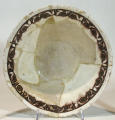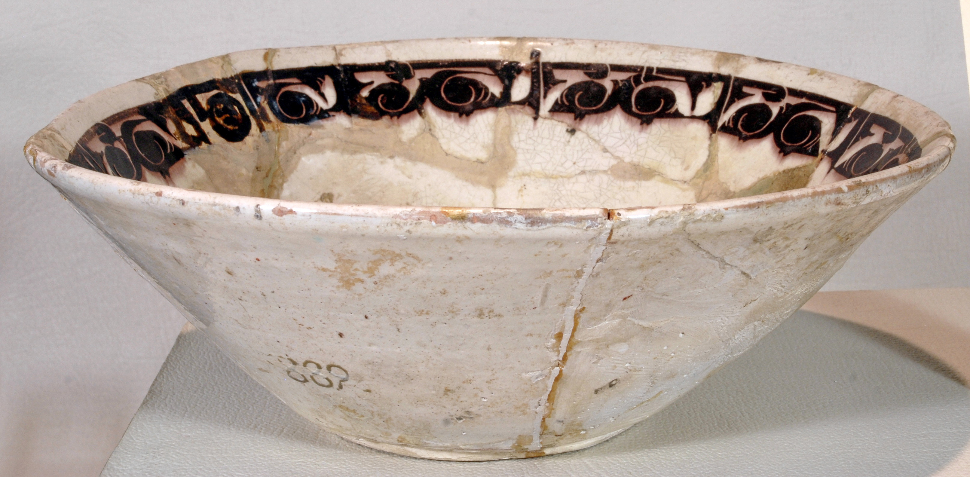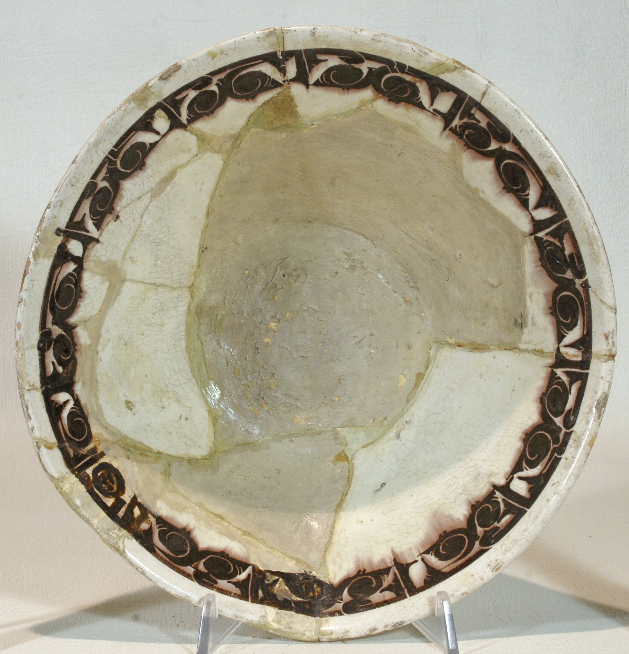 Склеєна. Догипсована. Реставрована у 1951 р.Щільні пило-жирові нашарування. Склеєна з фрагментів.Денце та частина борту доповнені; шви розходяться. Потертості та лущення поливи. Потребує реставрації.,