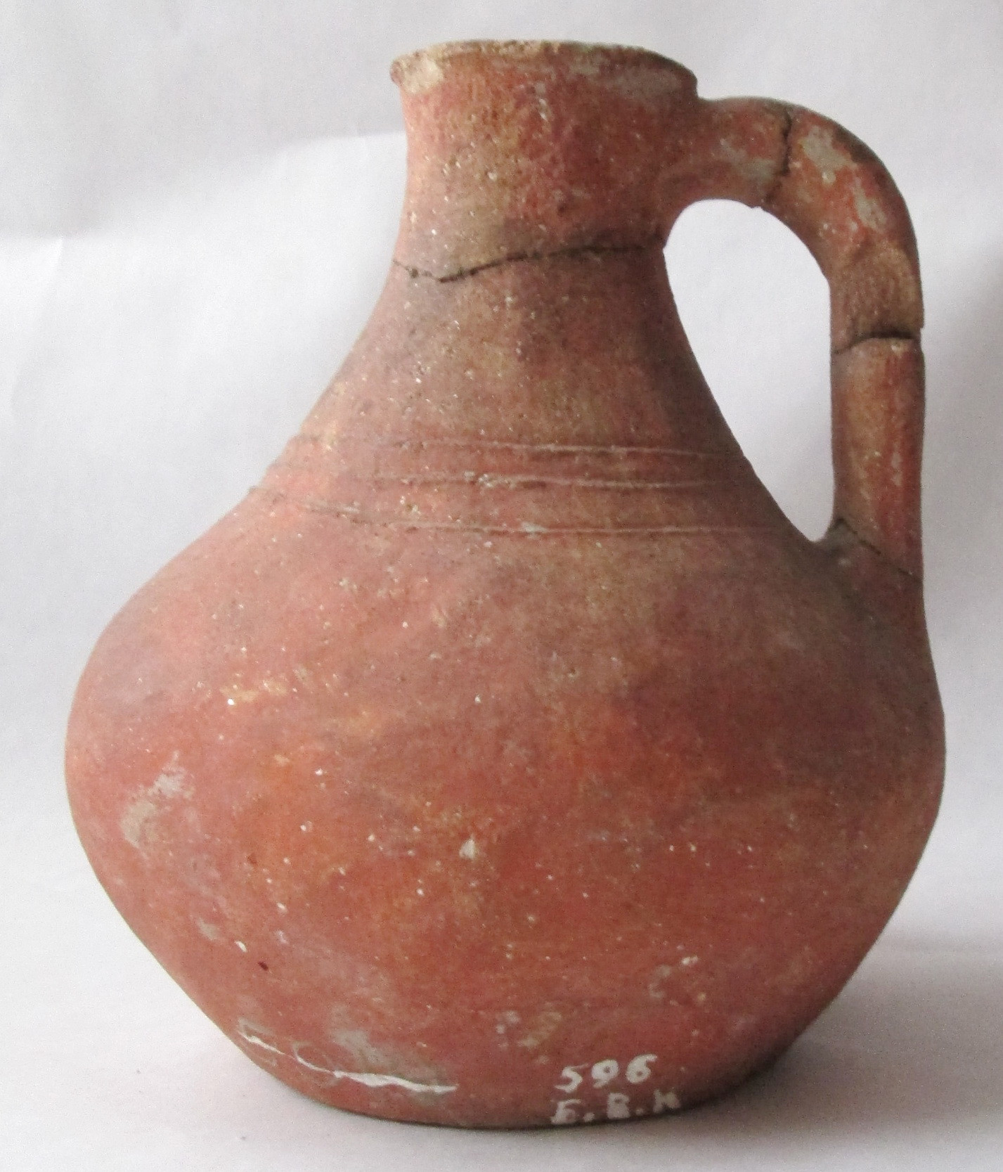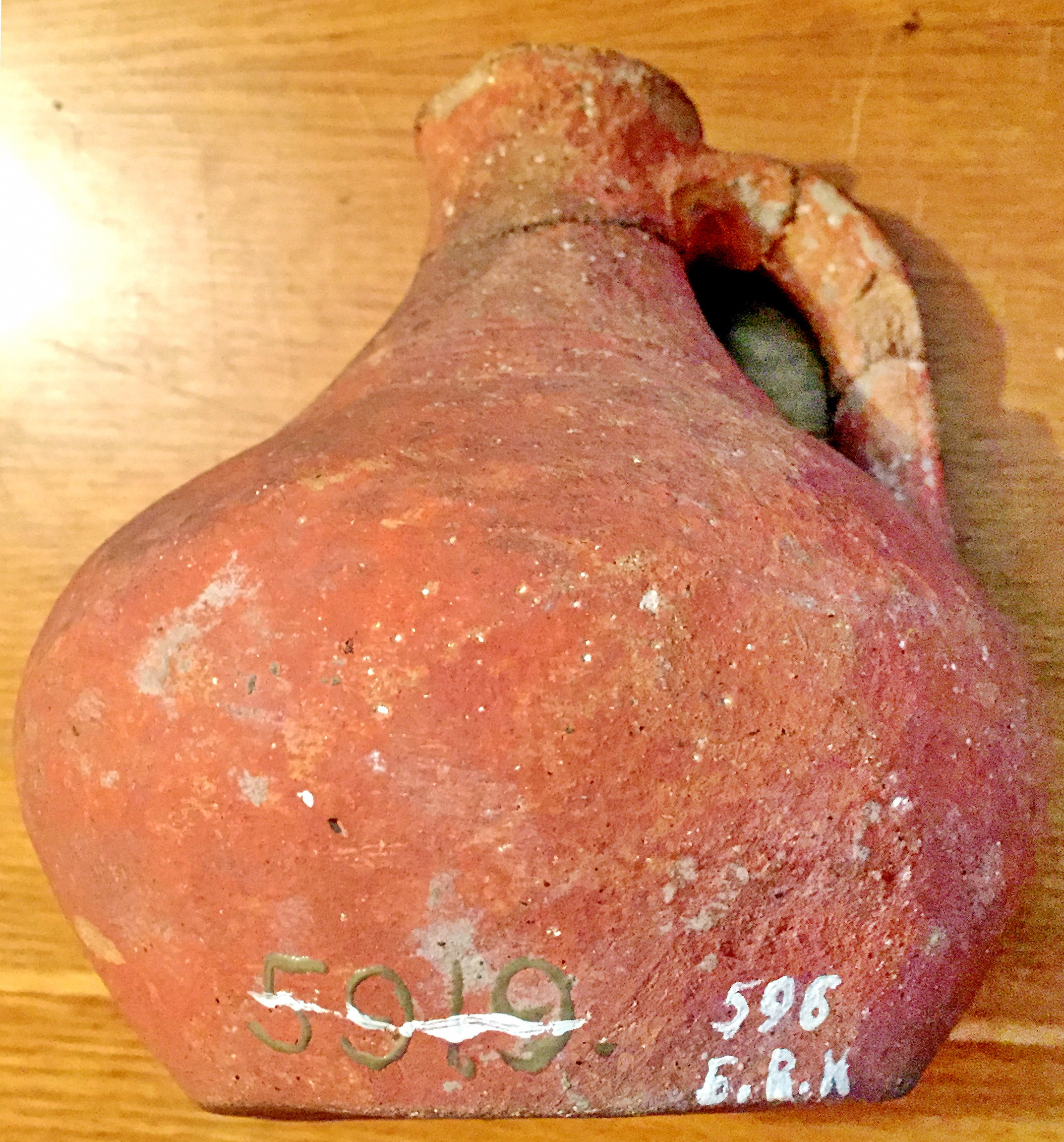 Склеєний з кількох шматків. В нижній частині корпусу довга вузька пробоїна.,