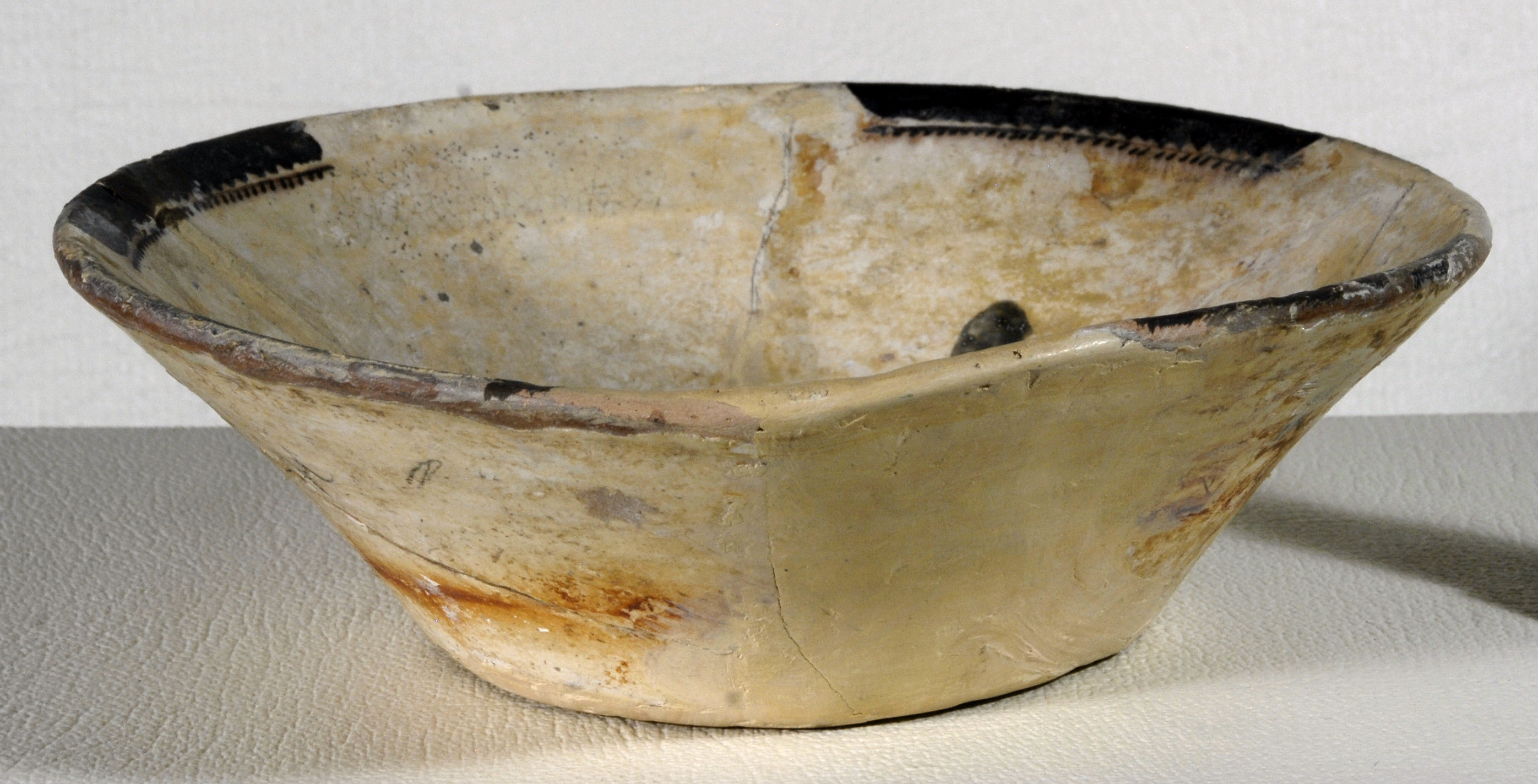 Склеєна з шматків. Щільні пило-жирові нашарування. Склеєна з фрагментів, частина борту та денце доповнені; реставраційні шви розходяться. Потребує реставрації.,