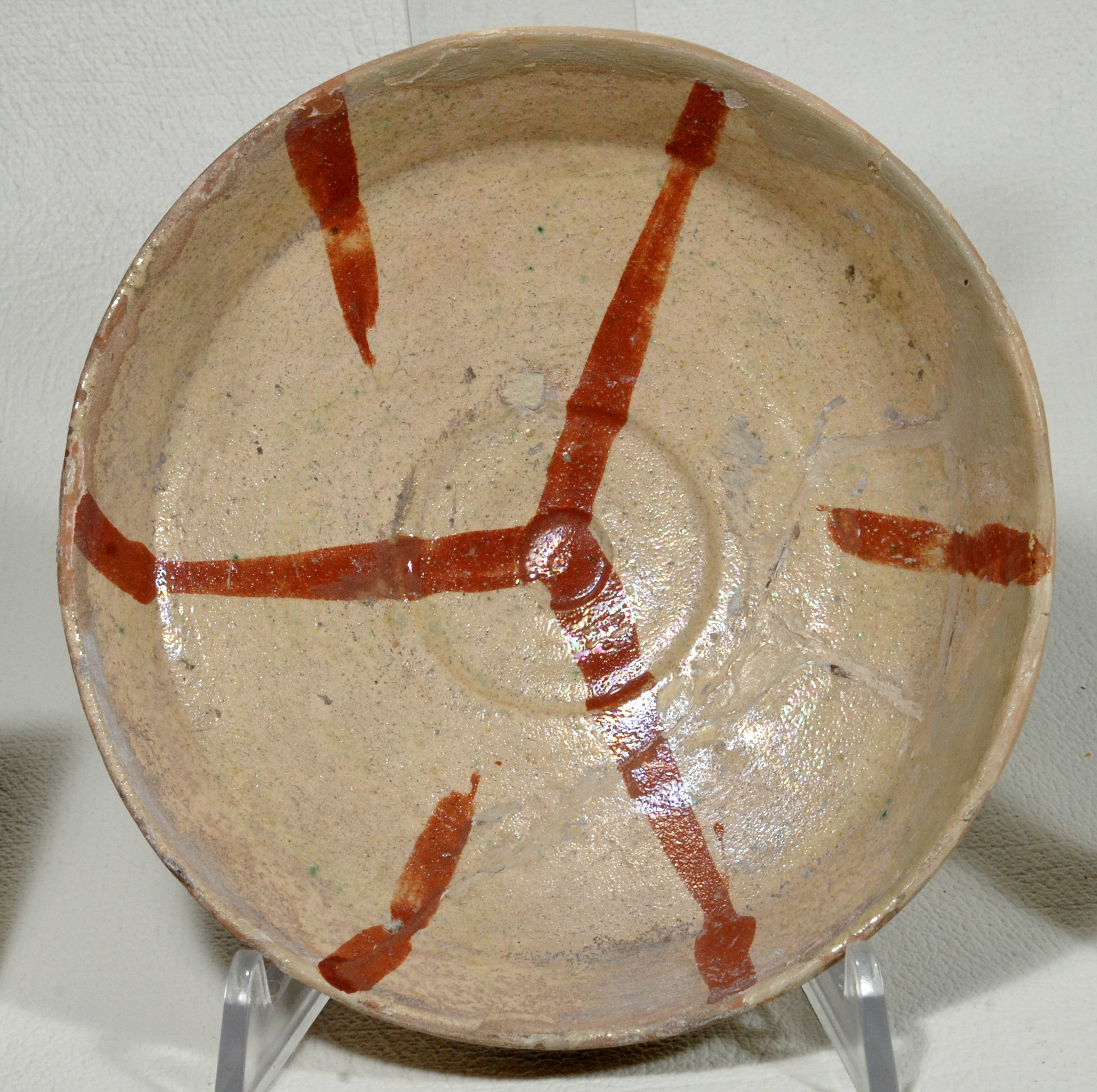 Розбита на частини. Реставрована у 1951 р.Щільні пило-жирові нашарування. Склеєна з 5 фрагментів, грубі матисковкі та тонування. Втарти поливи. Потребує реставрації.,