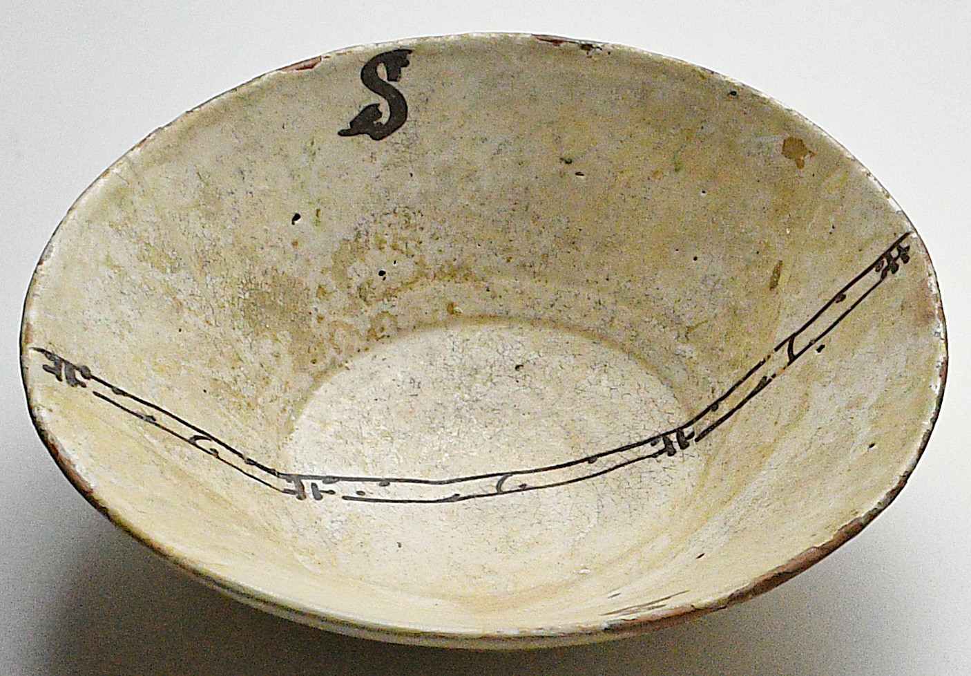Щільні пило-жирові нашарування. Склеєна з фрагментів. Реставраційні шви розходяться. Тонування грубі. Значні потретості та втрати поливи. Потребує реставрації.,