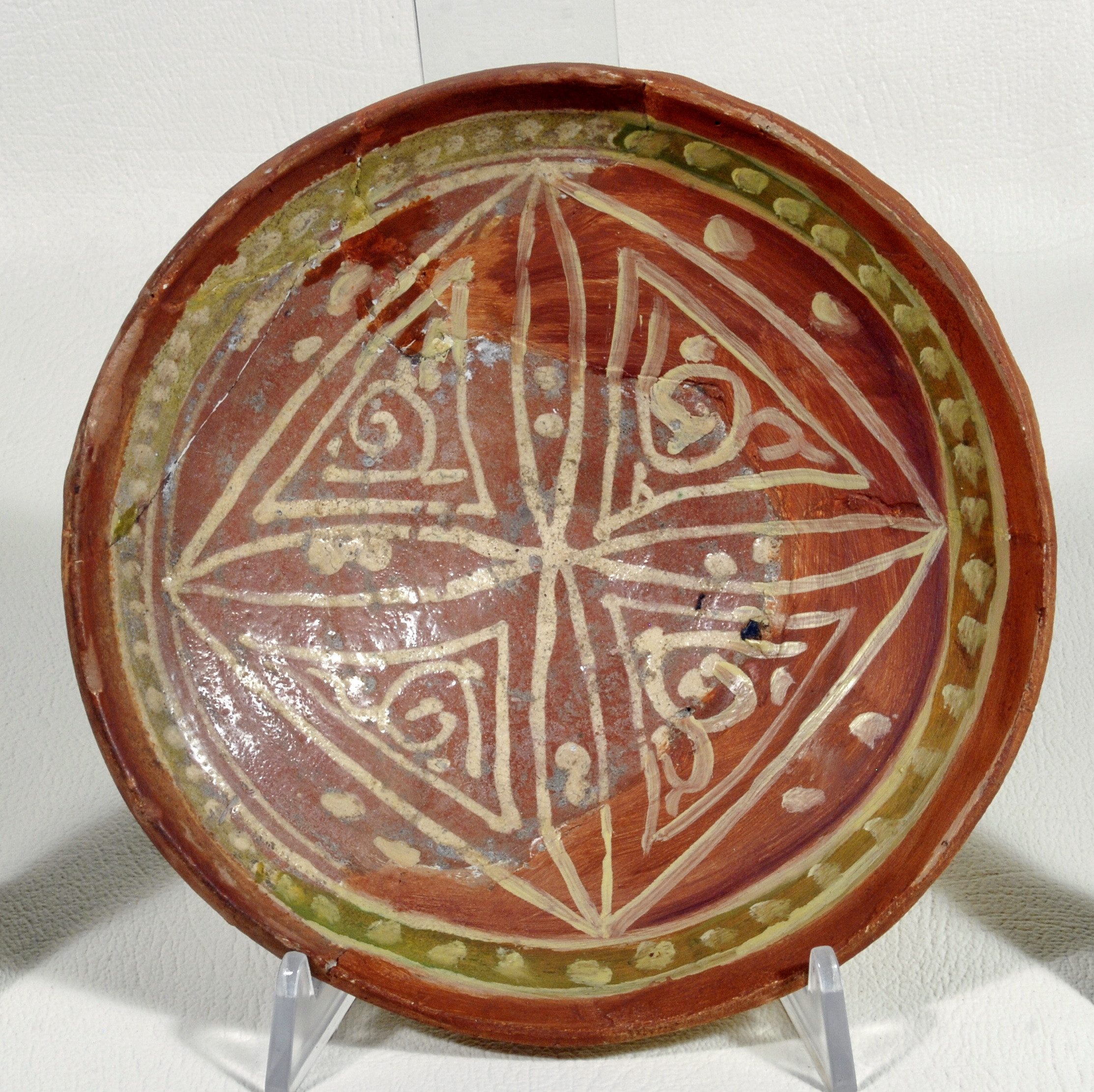 Склеєна, дороблена. Щільні пило-жирові нашарування. Склеєна з фрагментів; більша частина миски доповнена; грубі тонування. Потребує реставрації.,