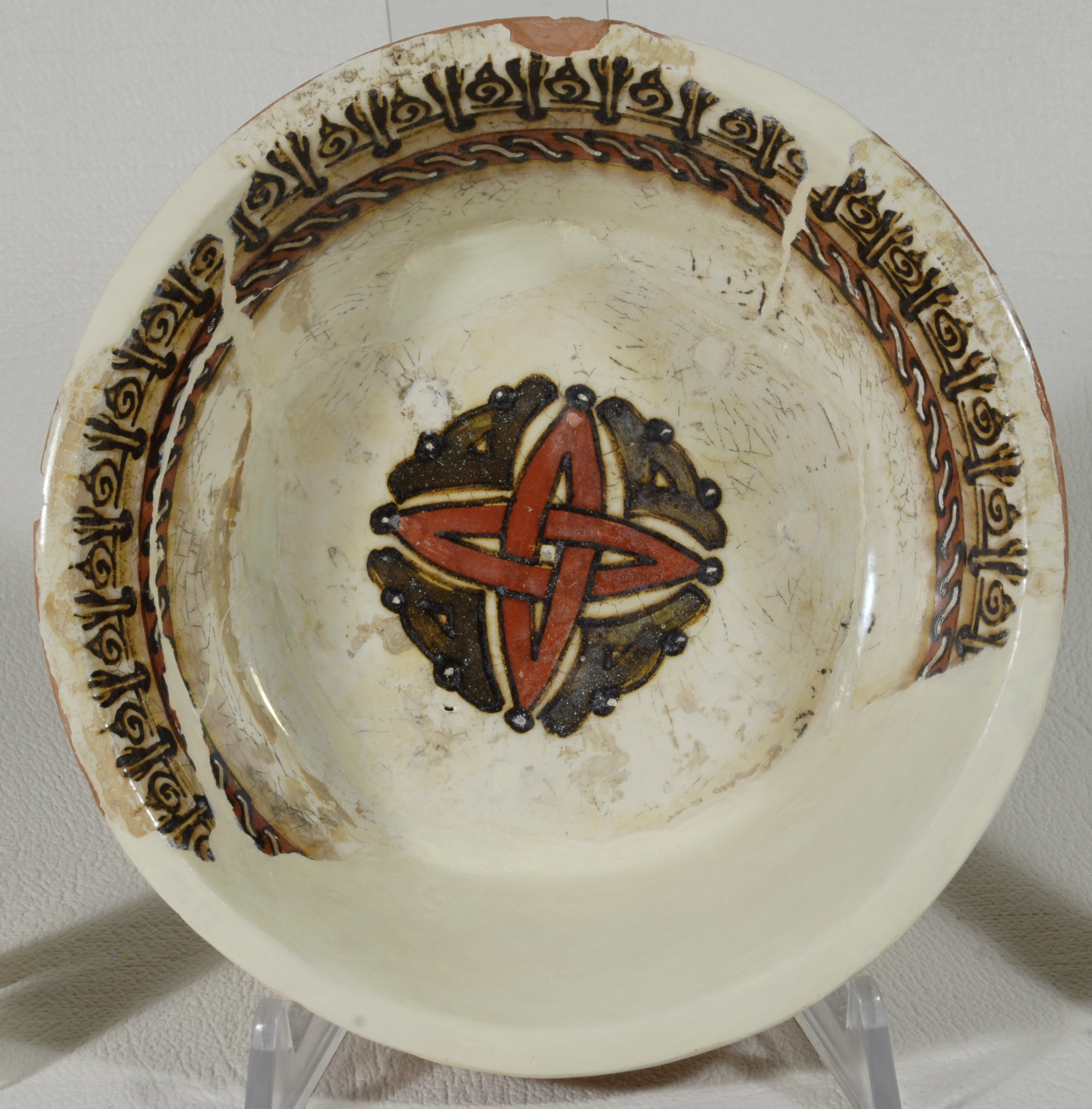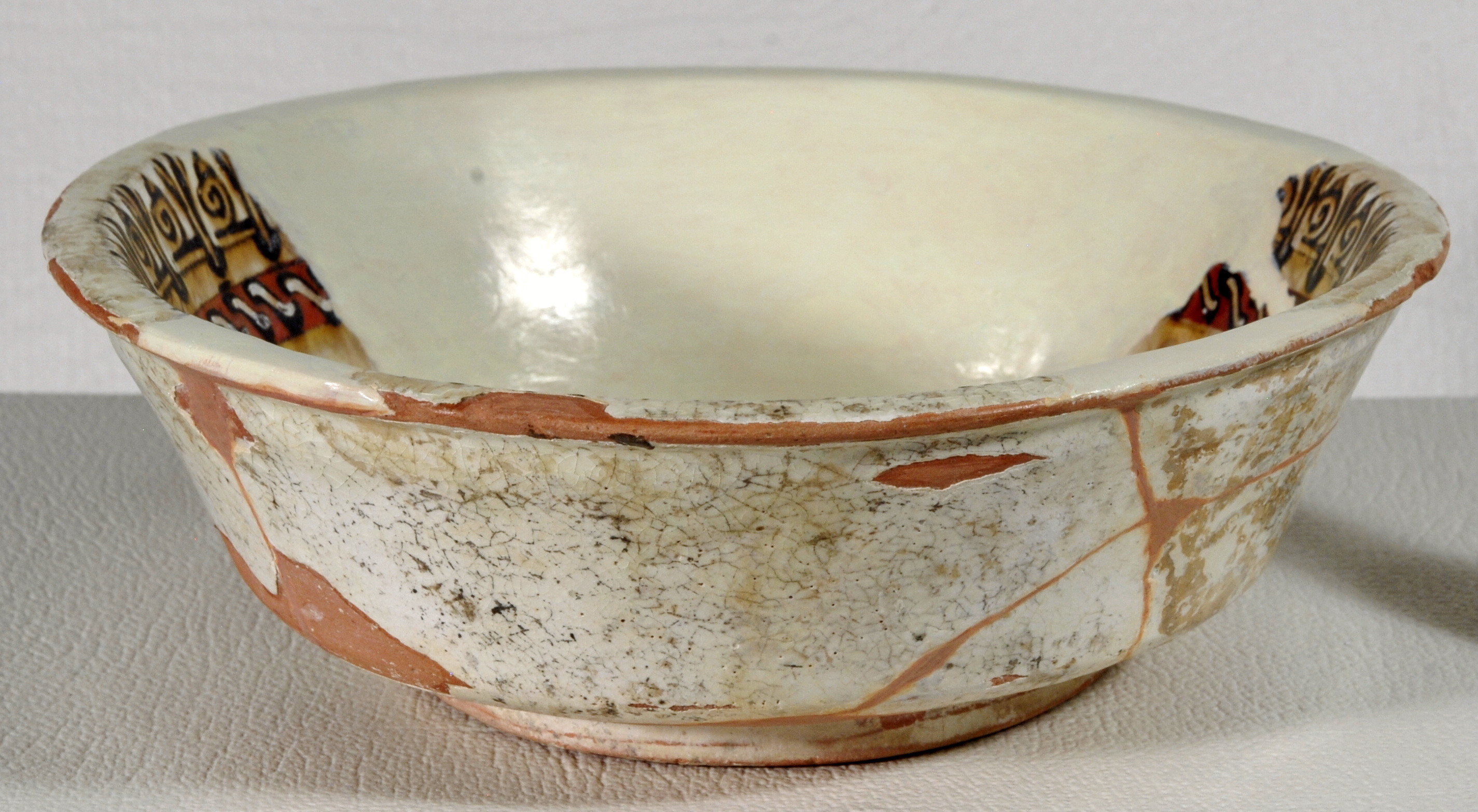 Склеєна, дороблена. Щільні пило-жирові нашарування. Склеєна з фрагментів. Частина борту доповнена. Шви та мастиковки грубі. Окремі шви розходяться. Лущення та втрати поливи. Потребує реставрації.,